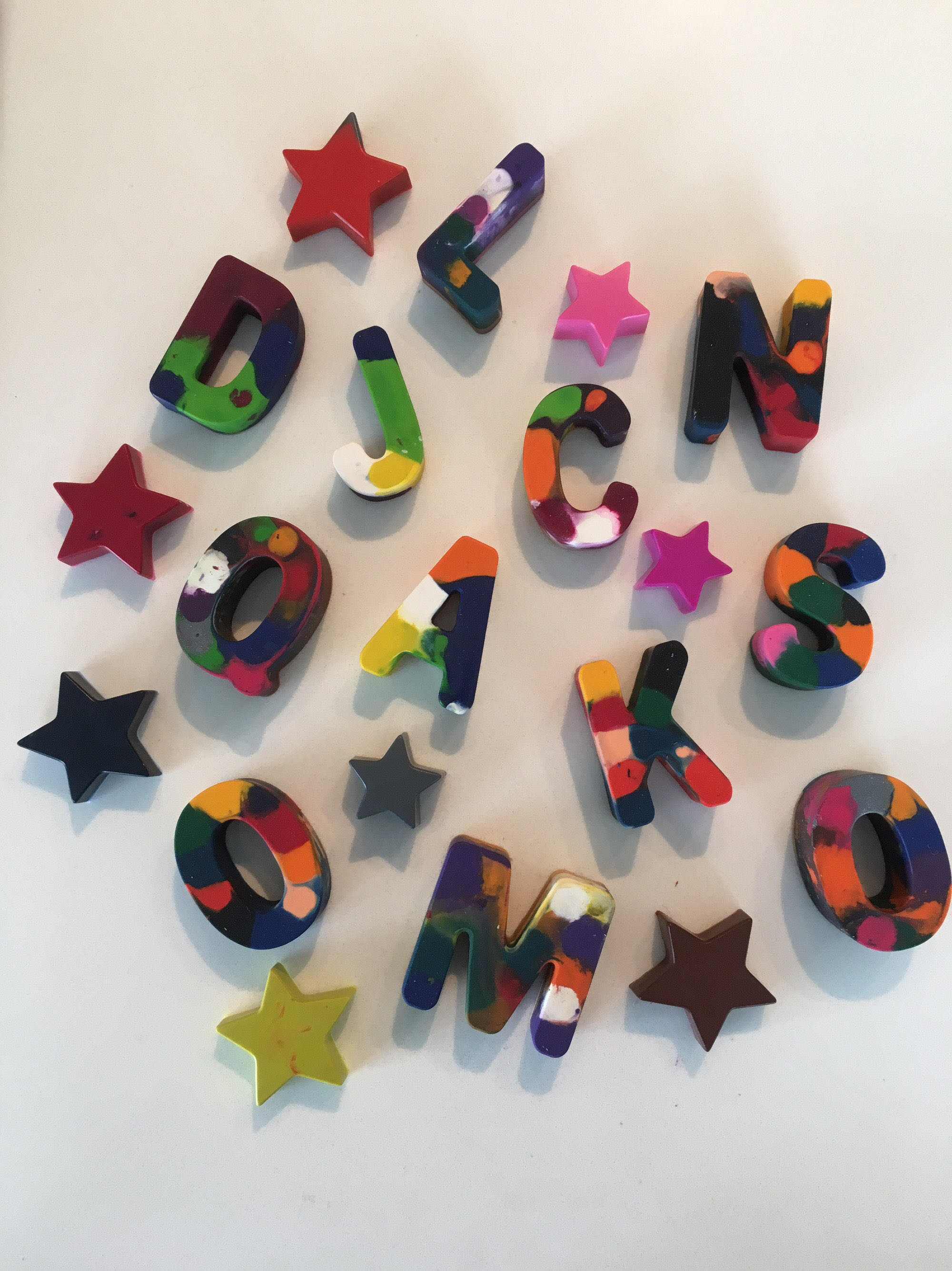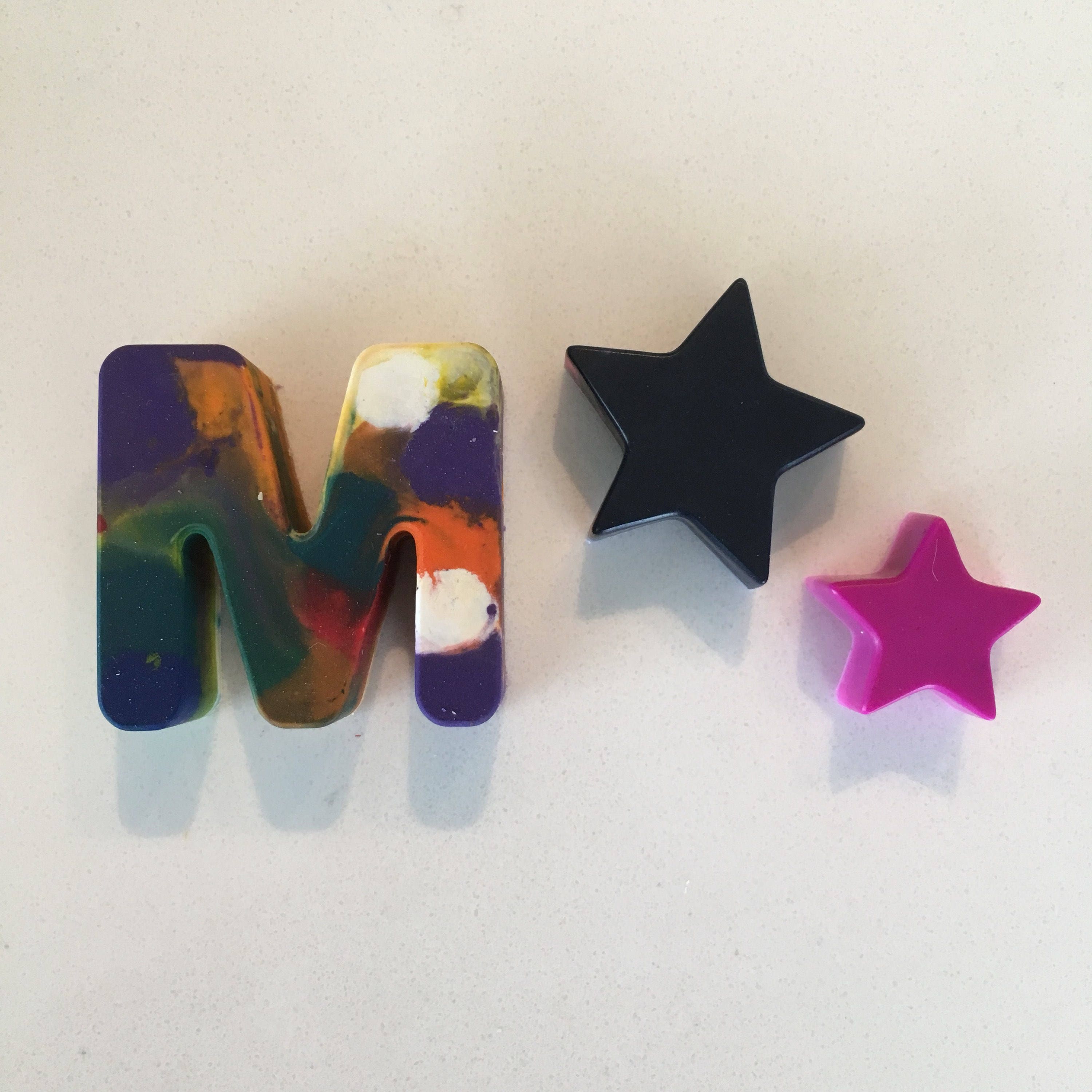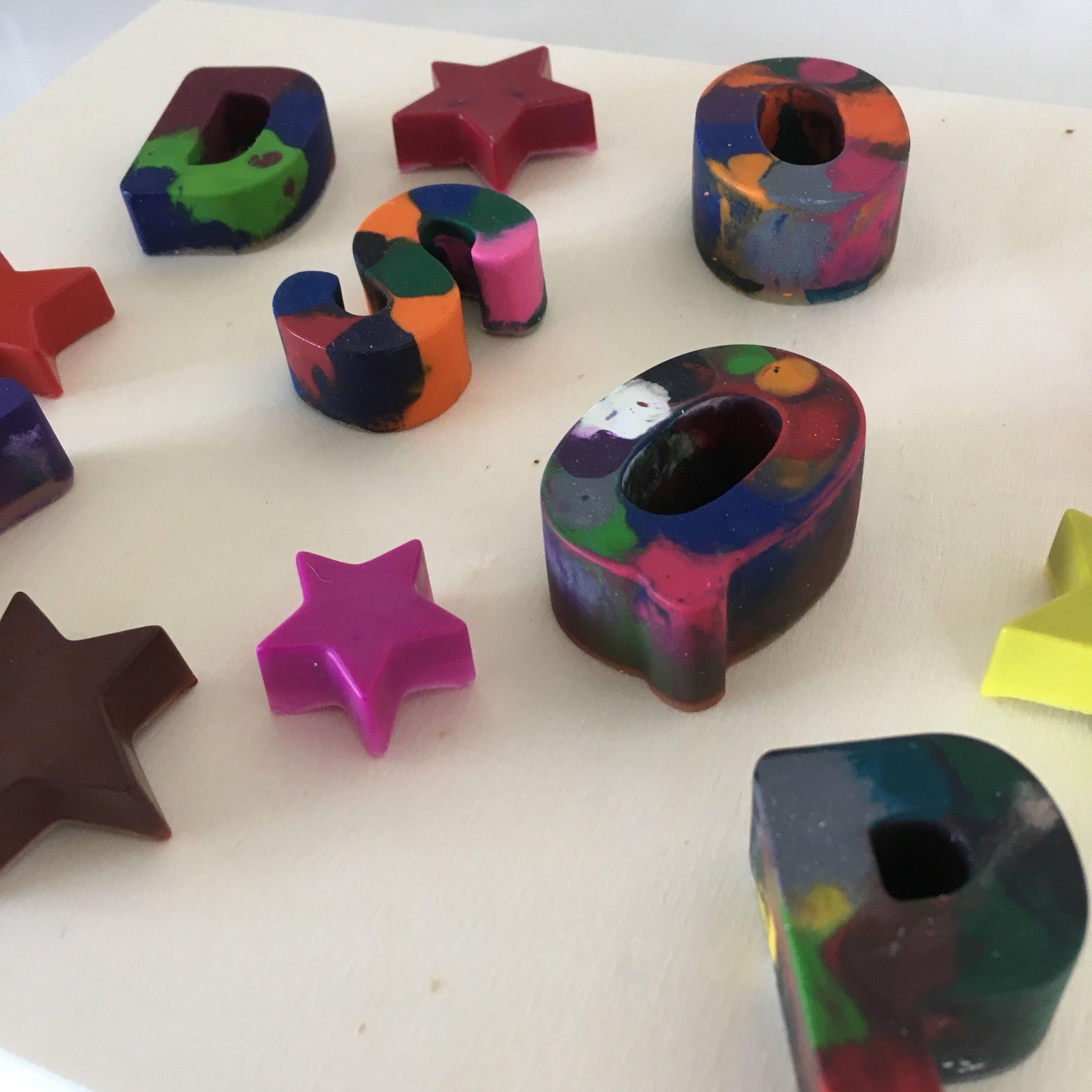 Handmade marble effect crayon party favours in the shape of letters and stars