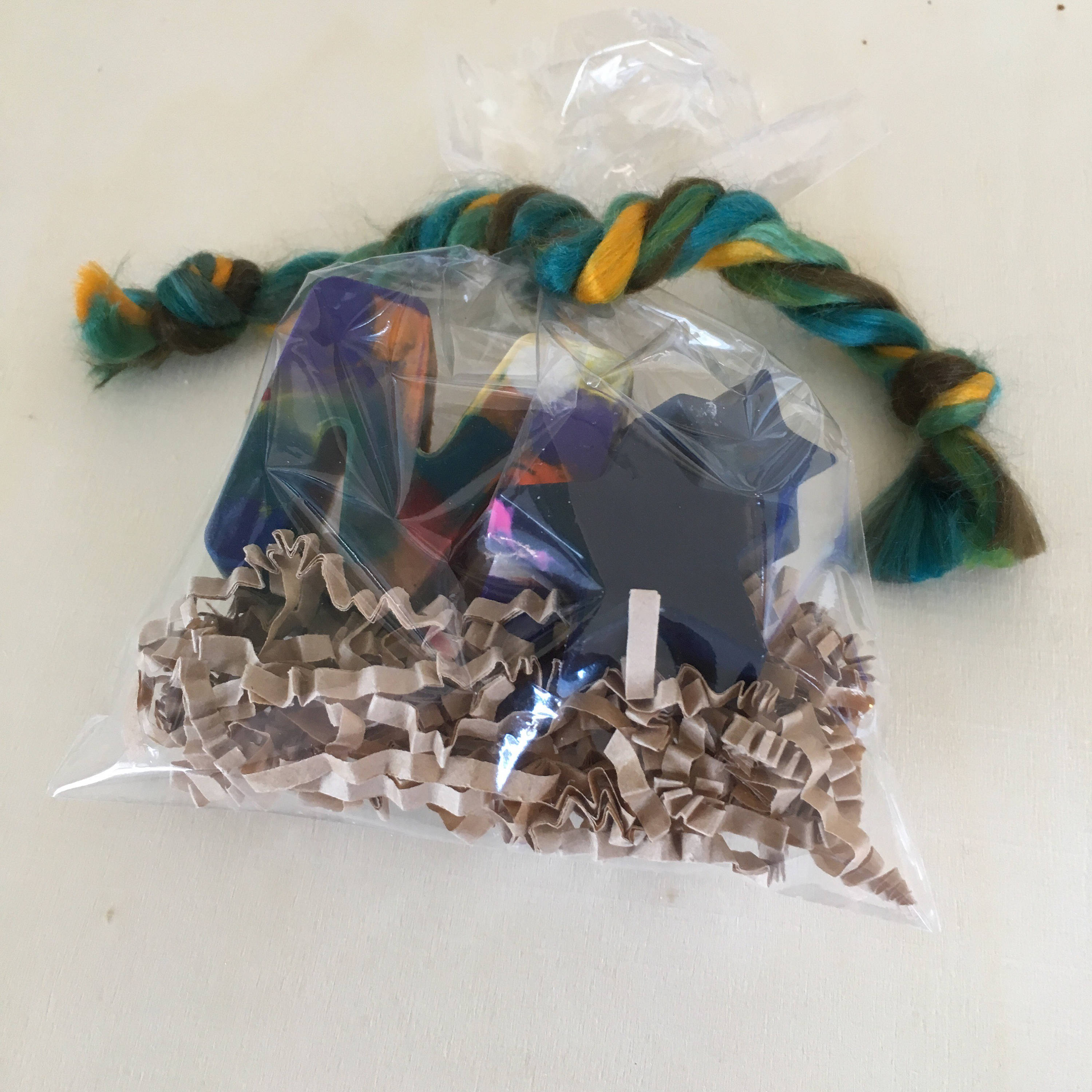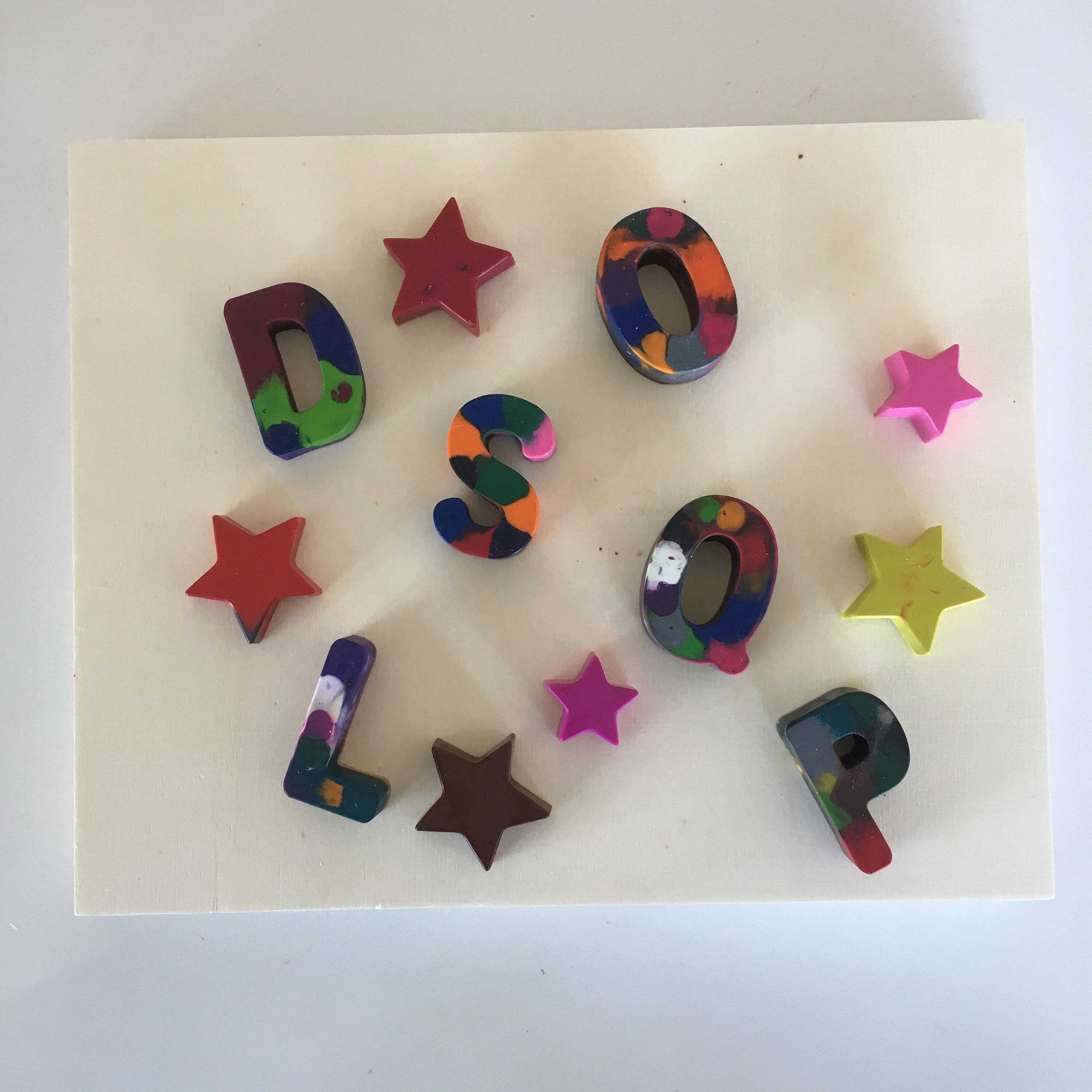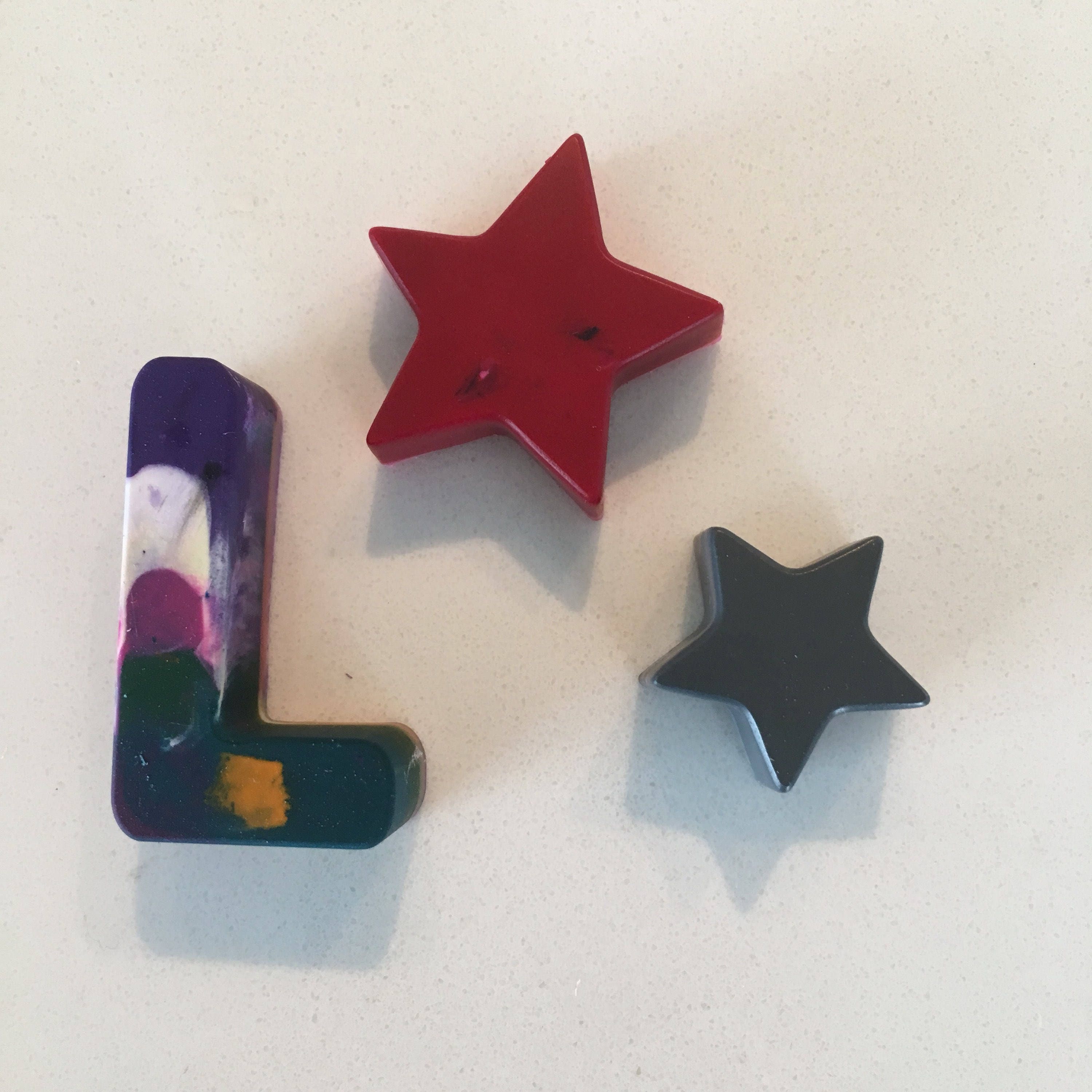 Handmade marble effect crayon party favours in the shape of letters and stars