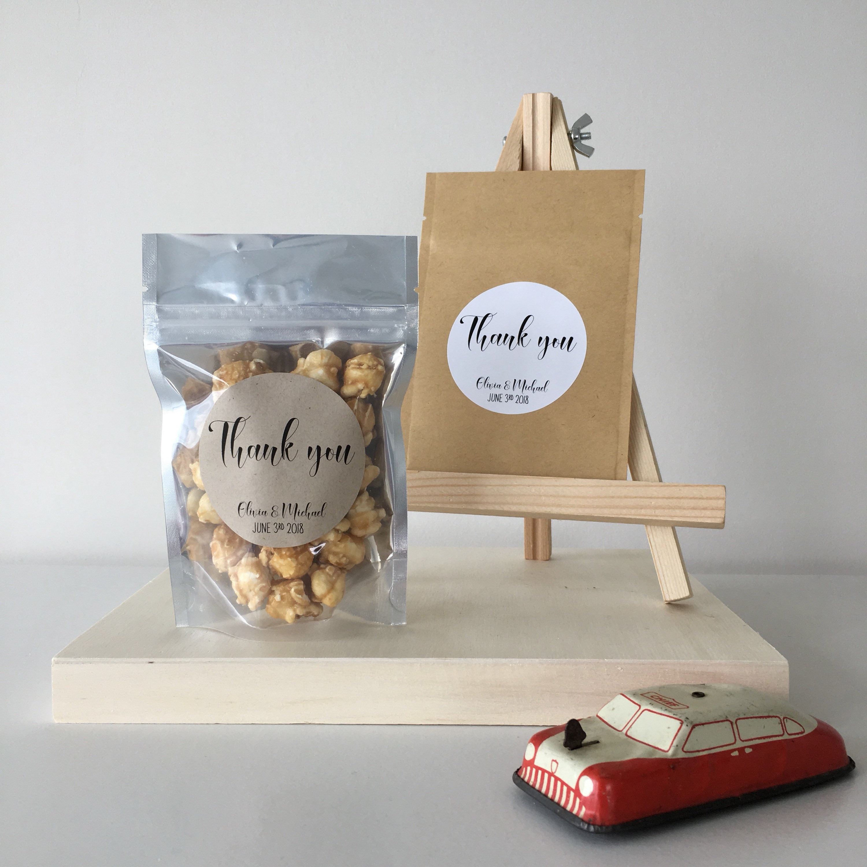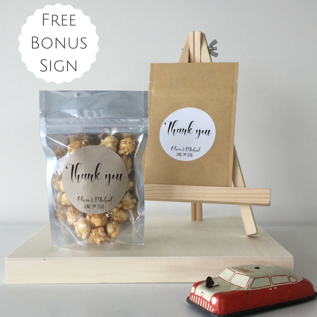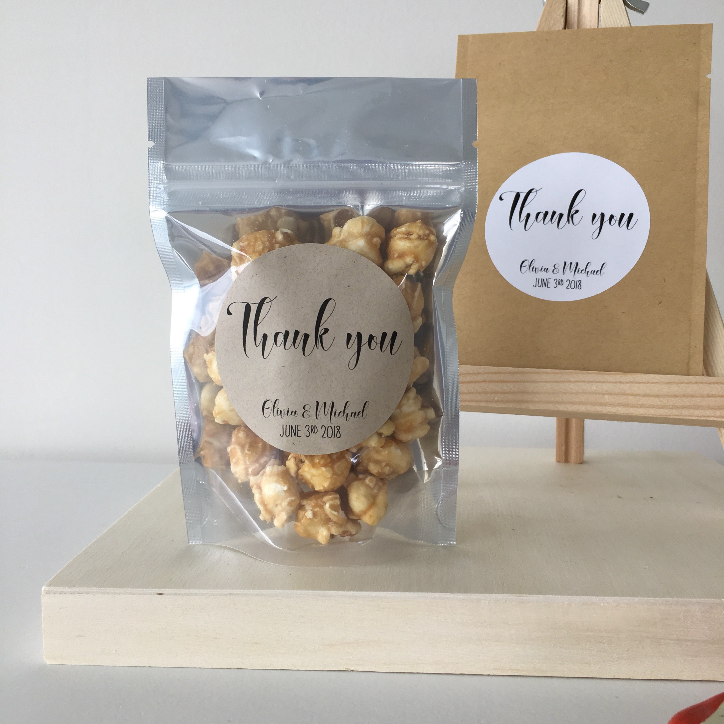 Bags are FDA food safe with a stand up bottom, making these perfect to fill with treats such as candy, popcorn or sweets and have displayed standing on a favour table. They have a closure similar to a ziplock bag to seal in treats and keep them freshly sealed.