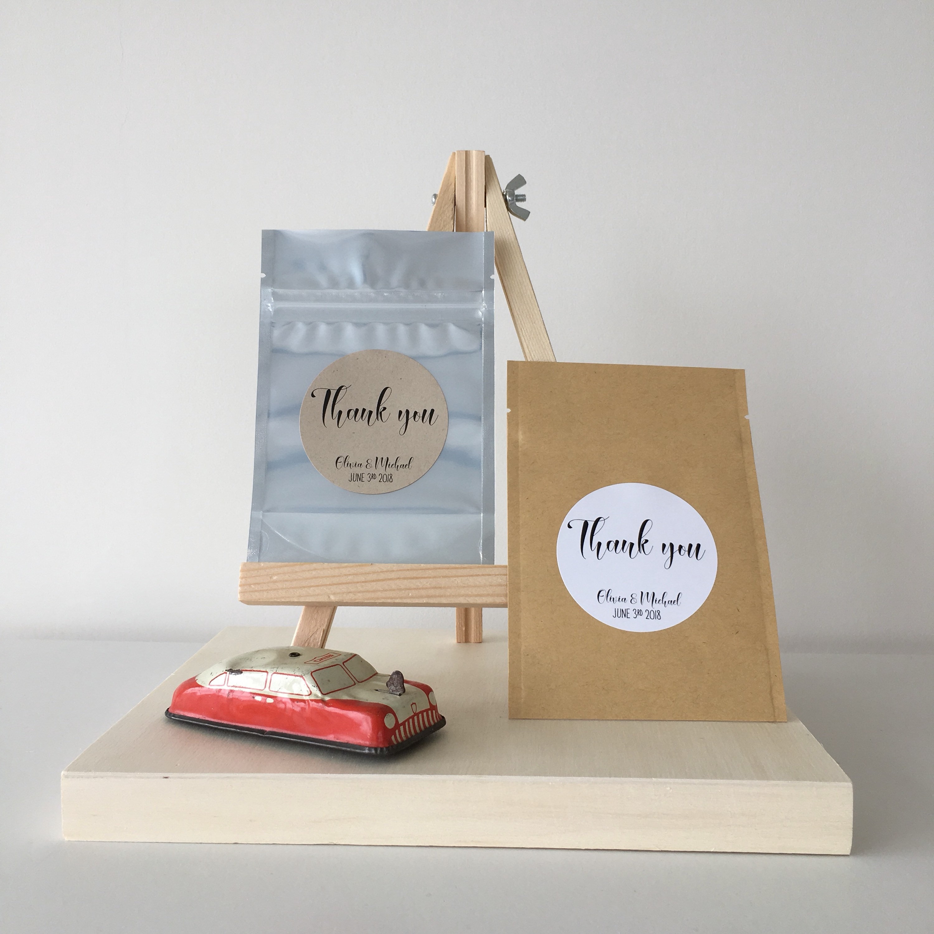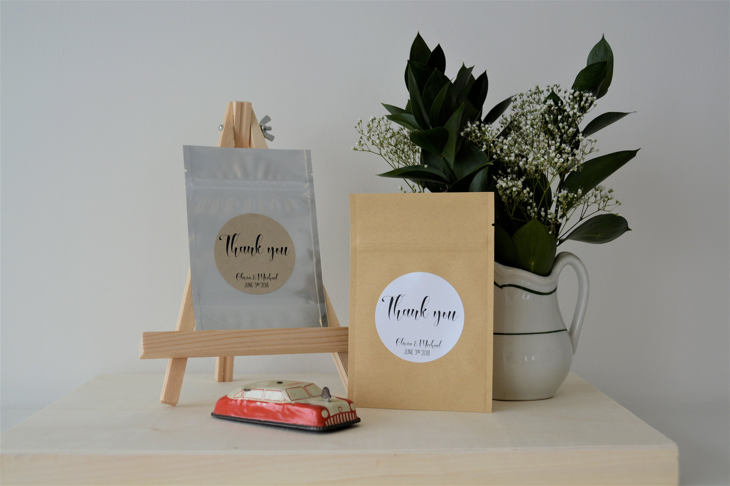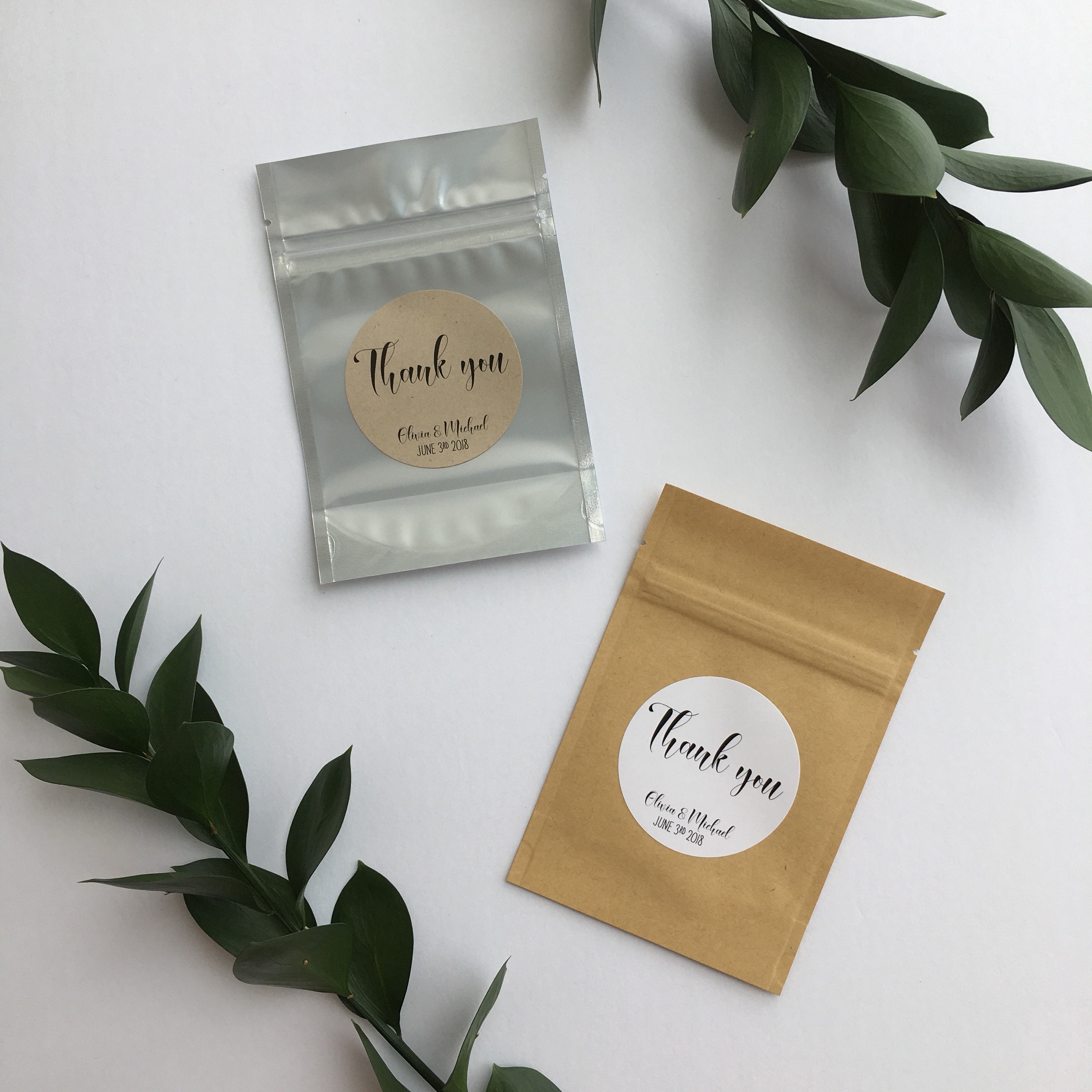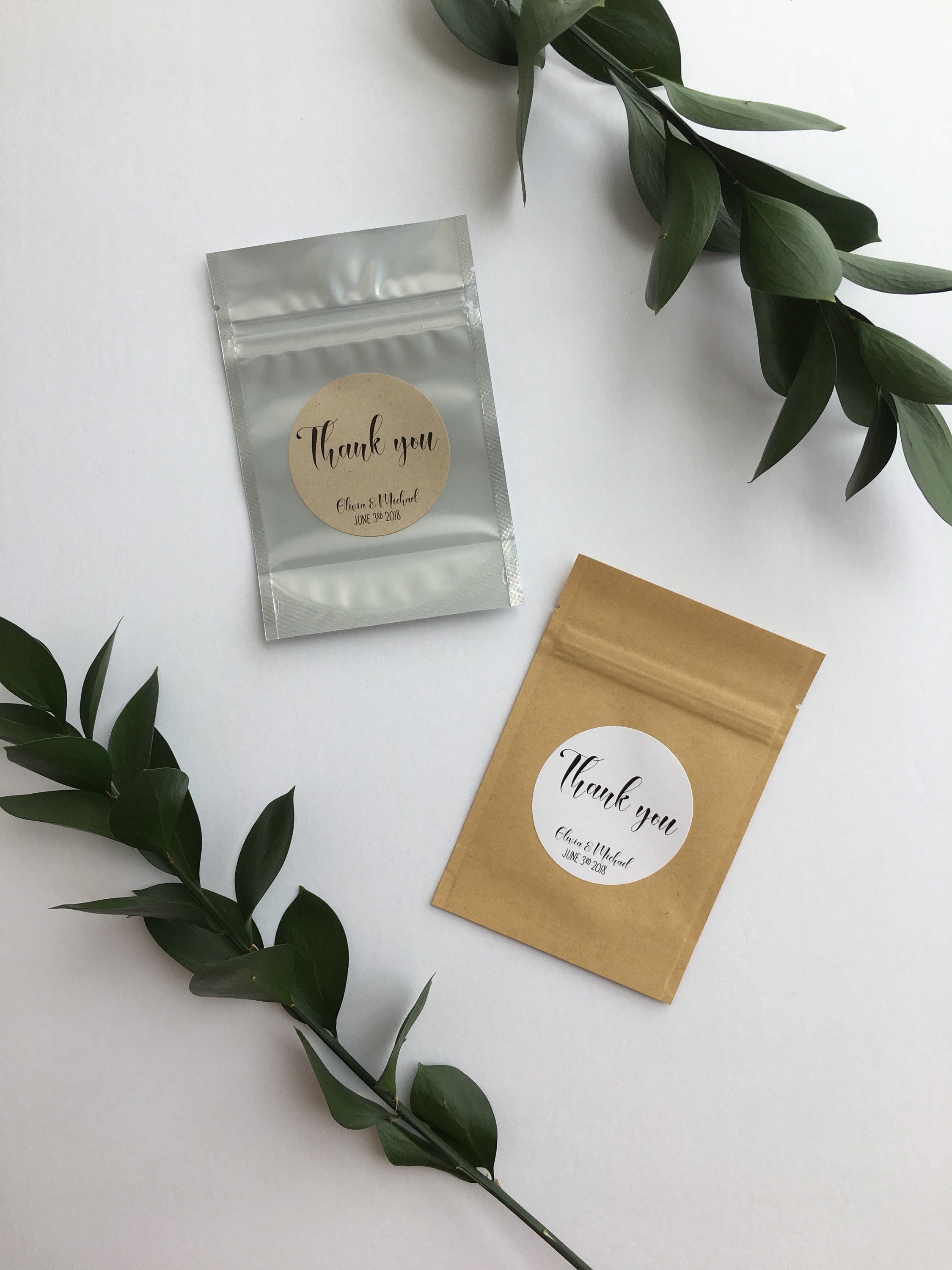 Wedding favor treat bags featuring the saying "Thank you"