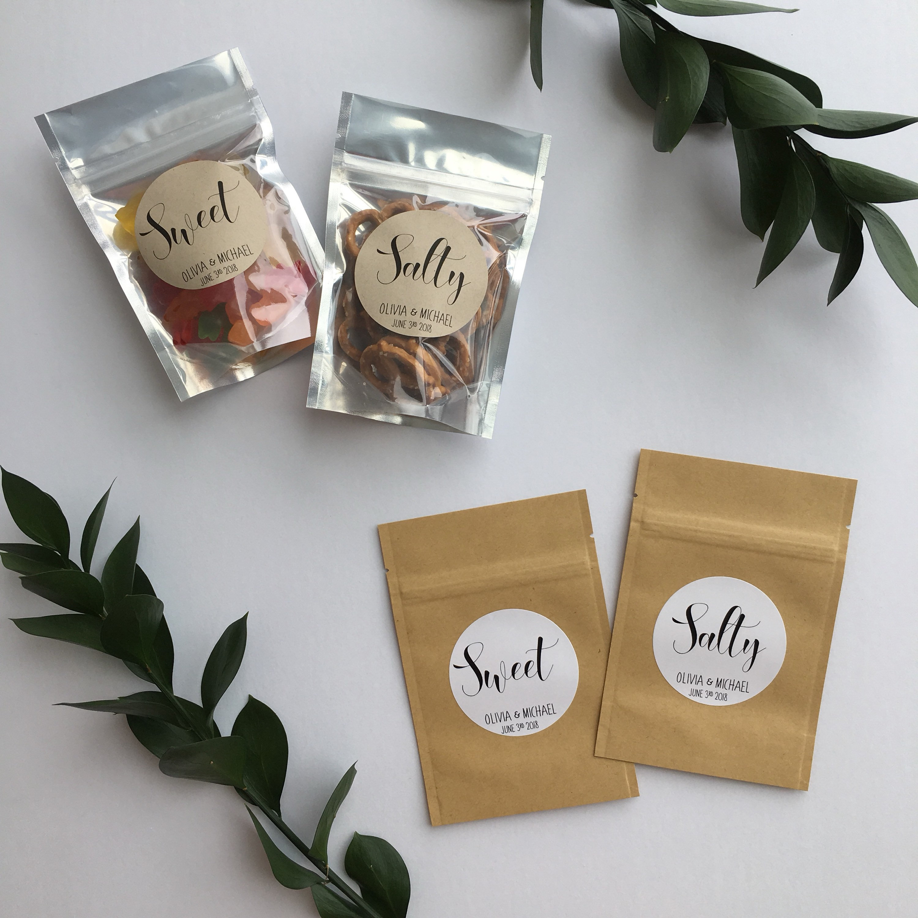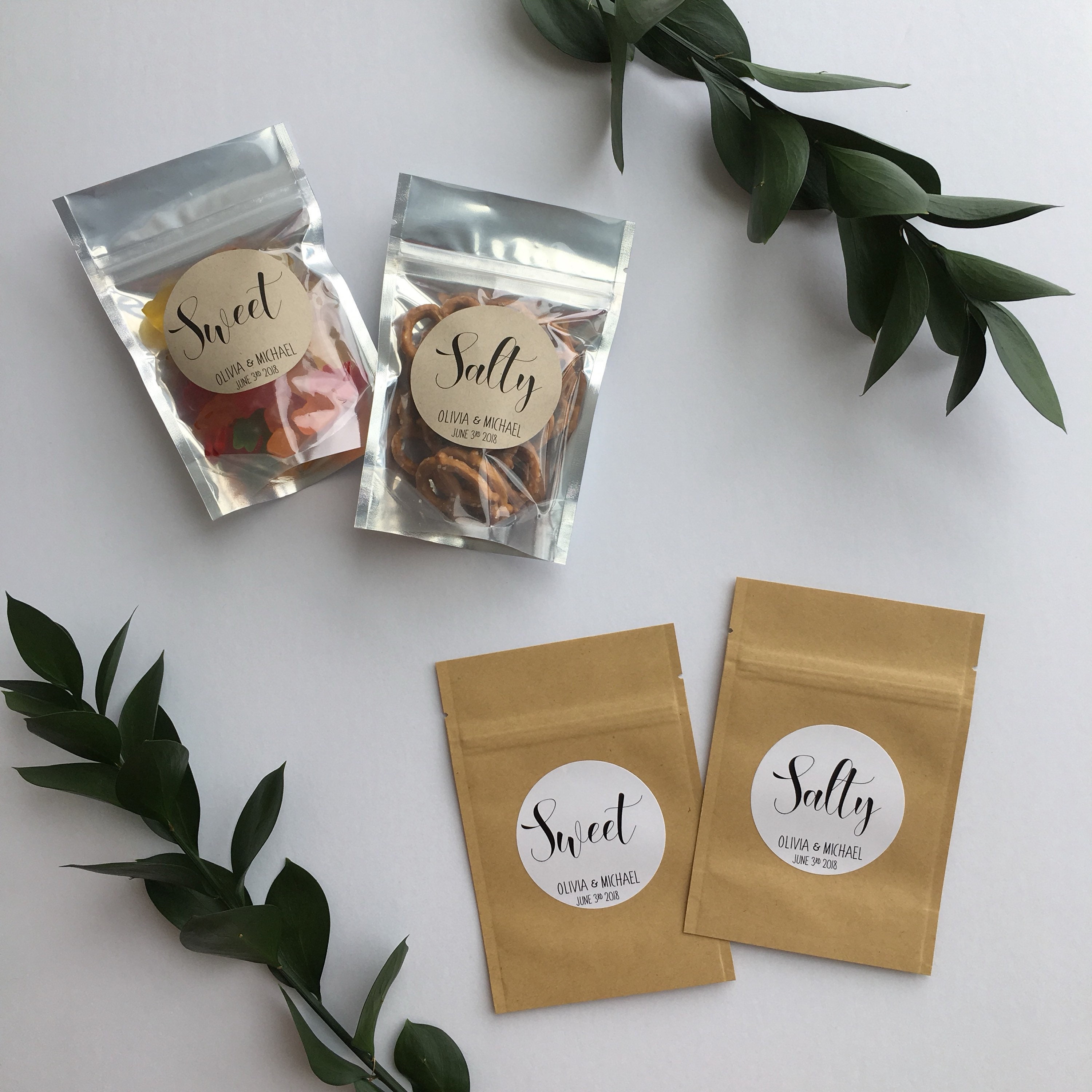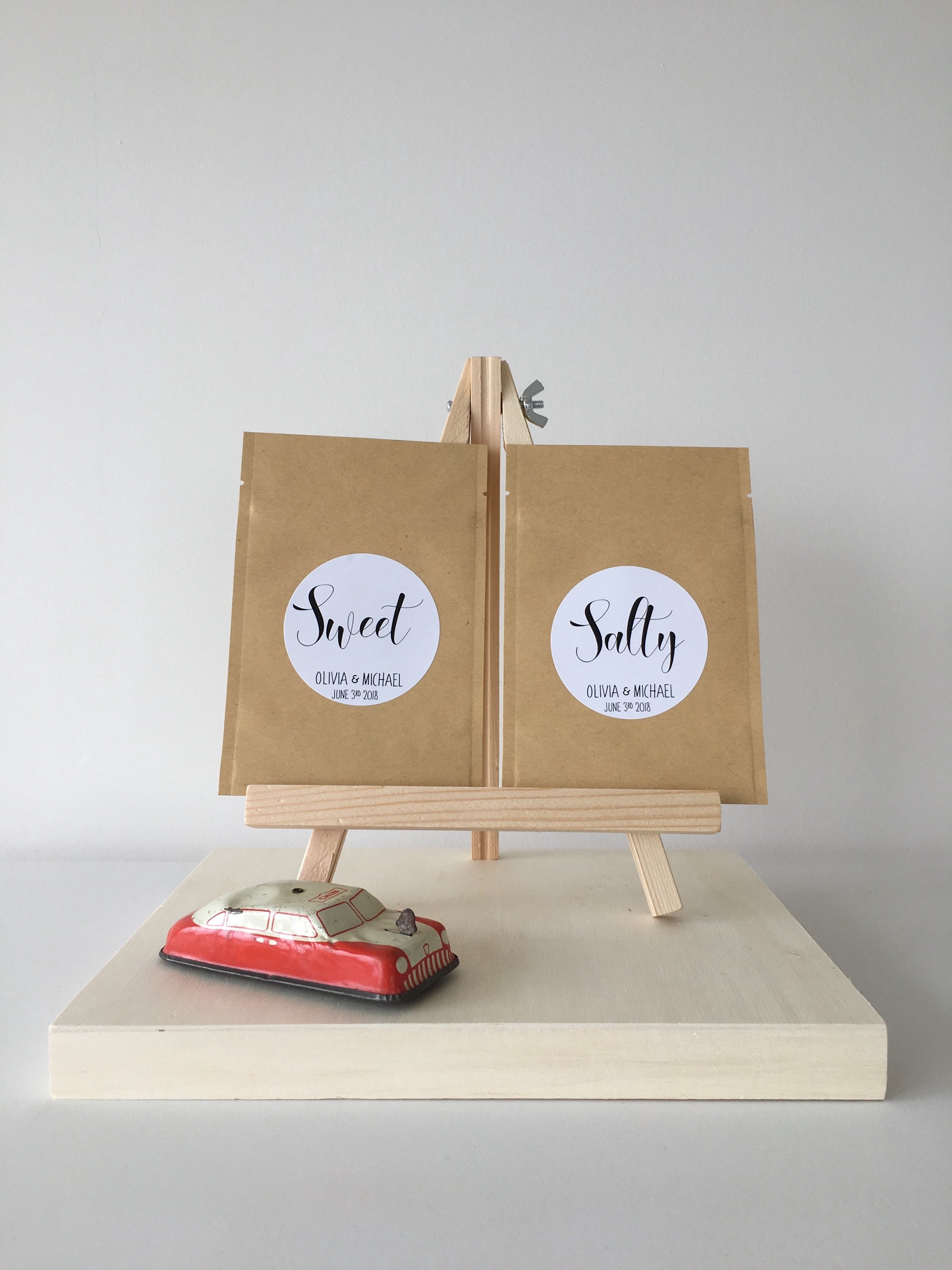 Wedding favor treat bags featuring the saying "Salty” & "Sweet"