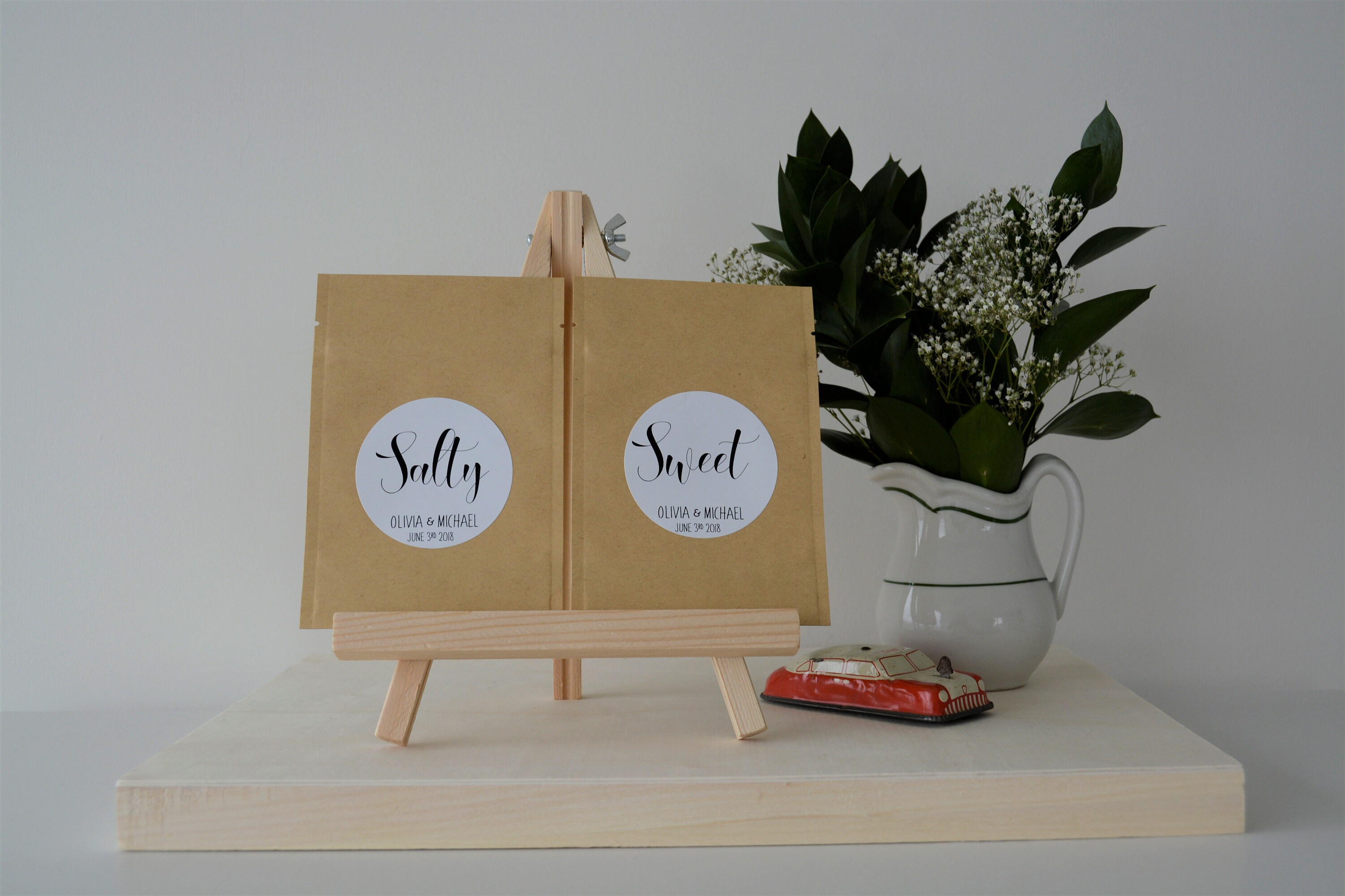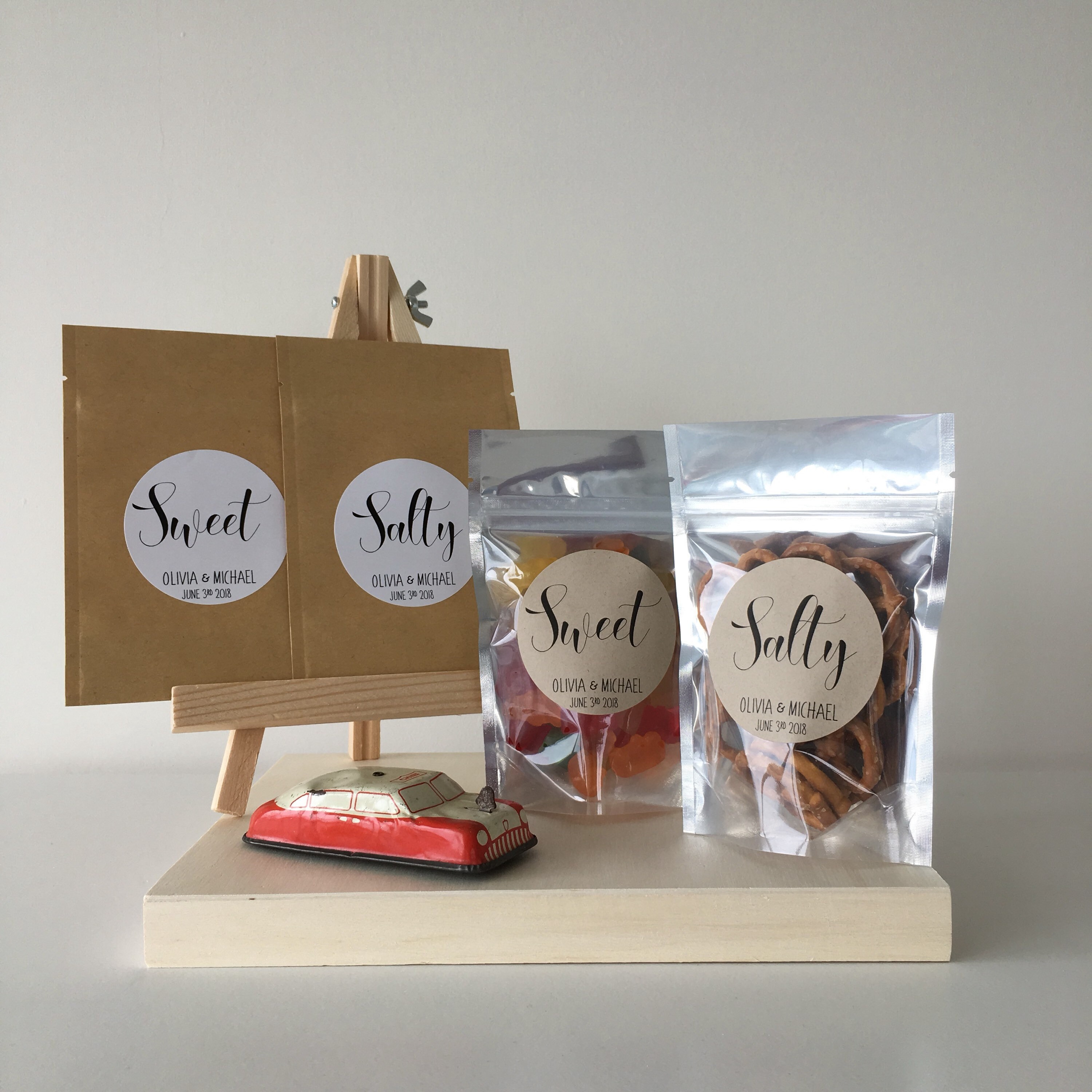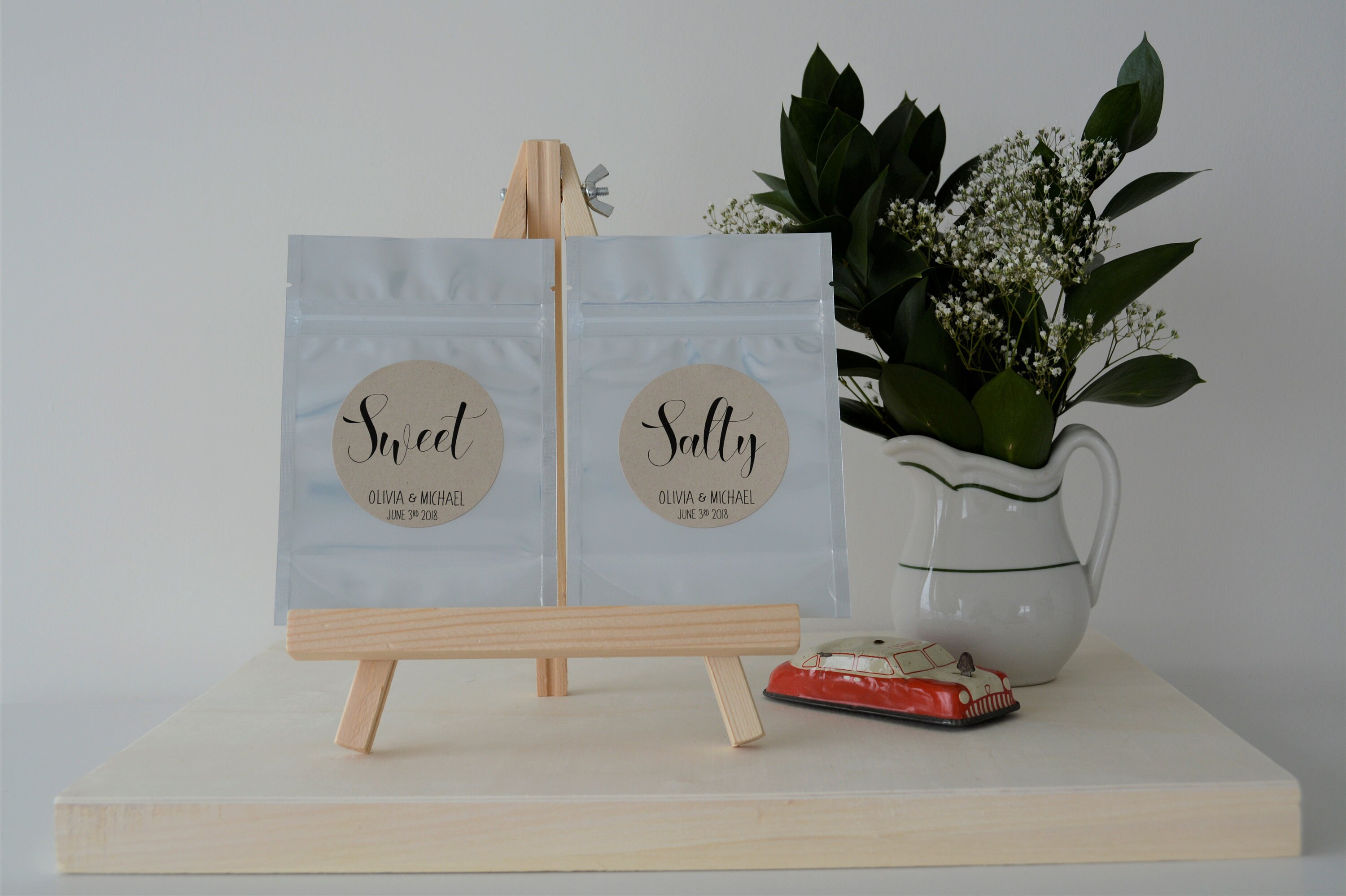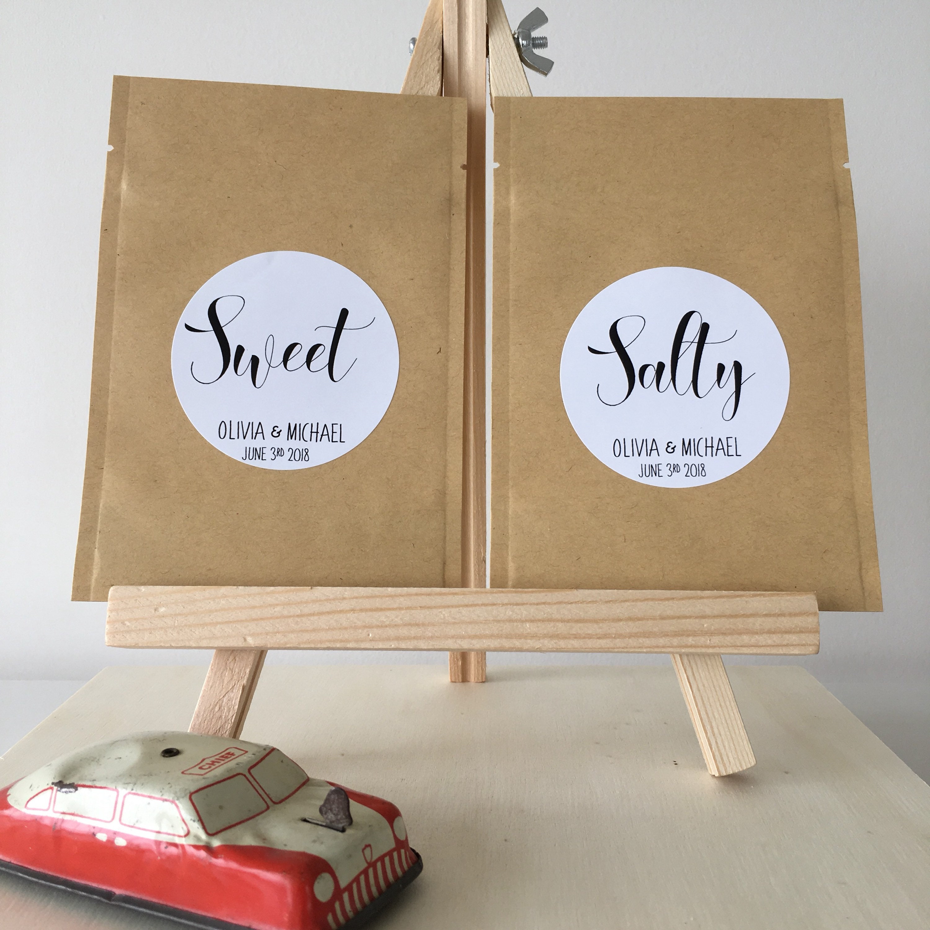 Wedding favor treat bags featuring the saying "Salty” & "Sweet"