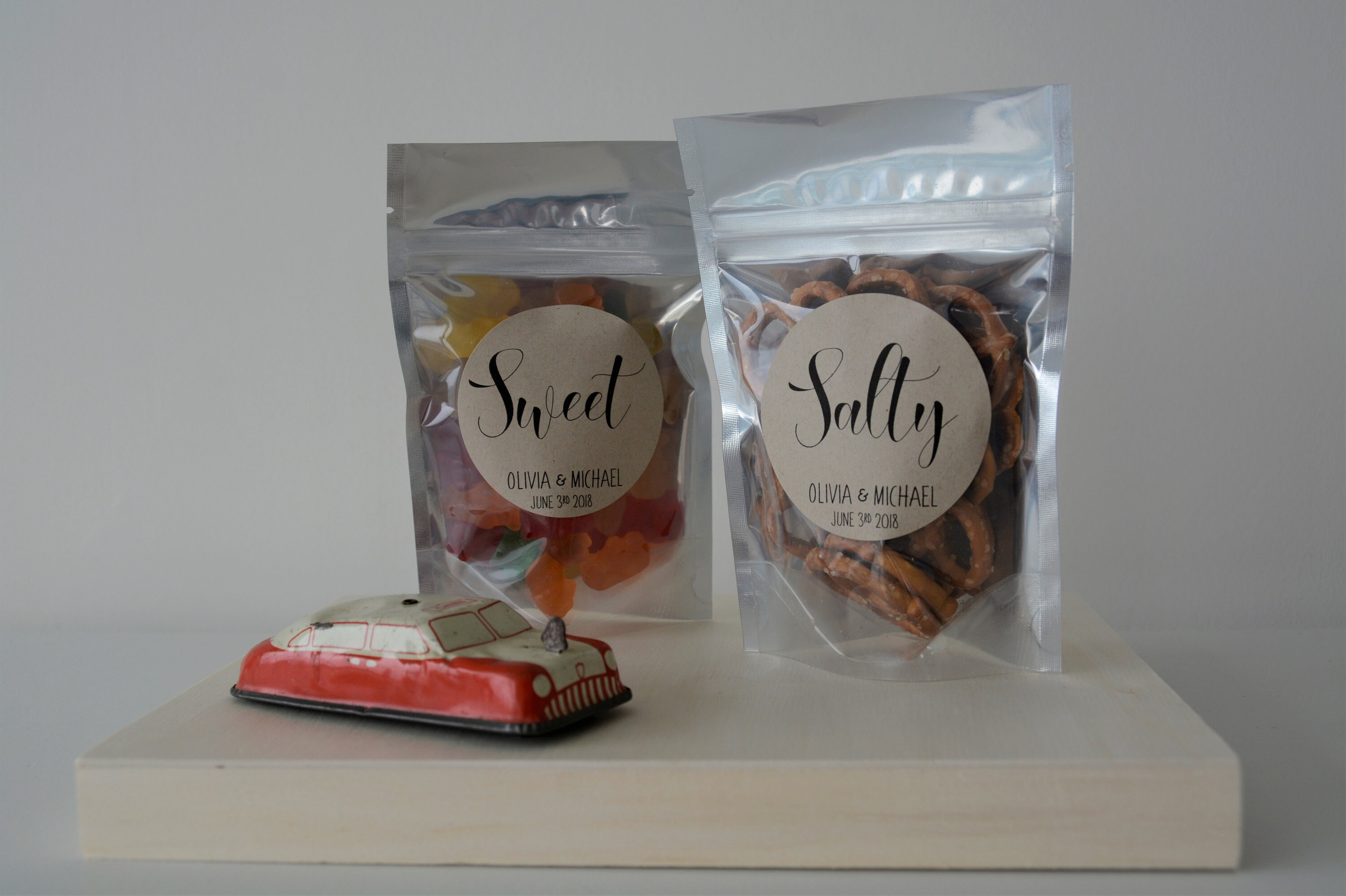 Bags are FDA food safe with a stand up bottom, making these perfect to fill with treats such as candy, popcorn or sweets and have displayed standing on a favour table. They have a closure similar to a ziplock bag to seal in treats and keep them freshly sealed.