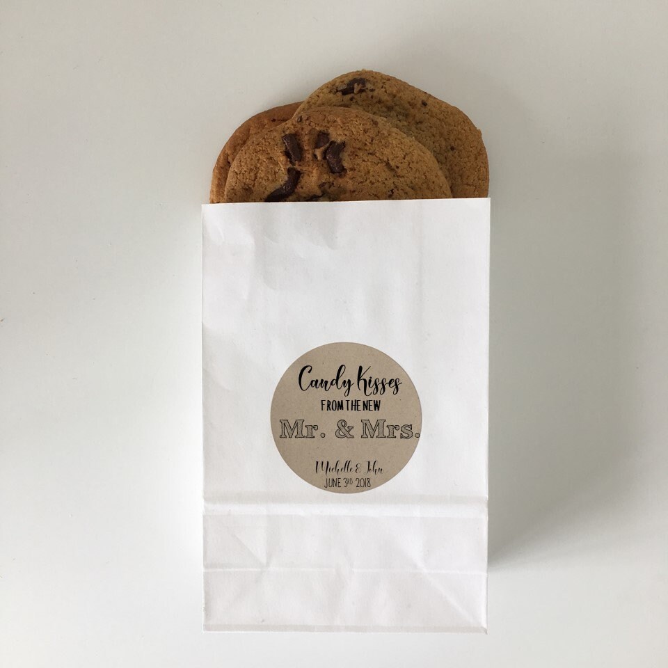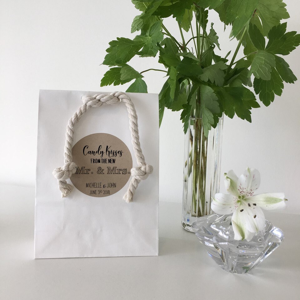 Set of 10 Wedding favor treat bags featuring the saying "Candy Kisses from the new Mr. & Mrs."