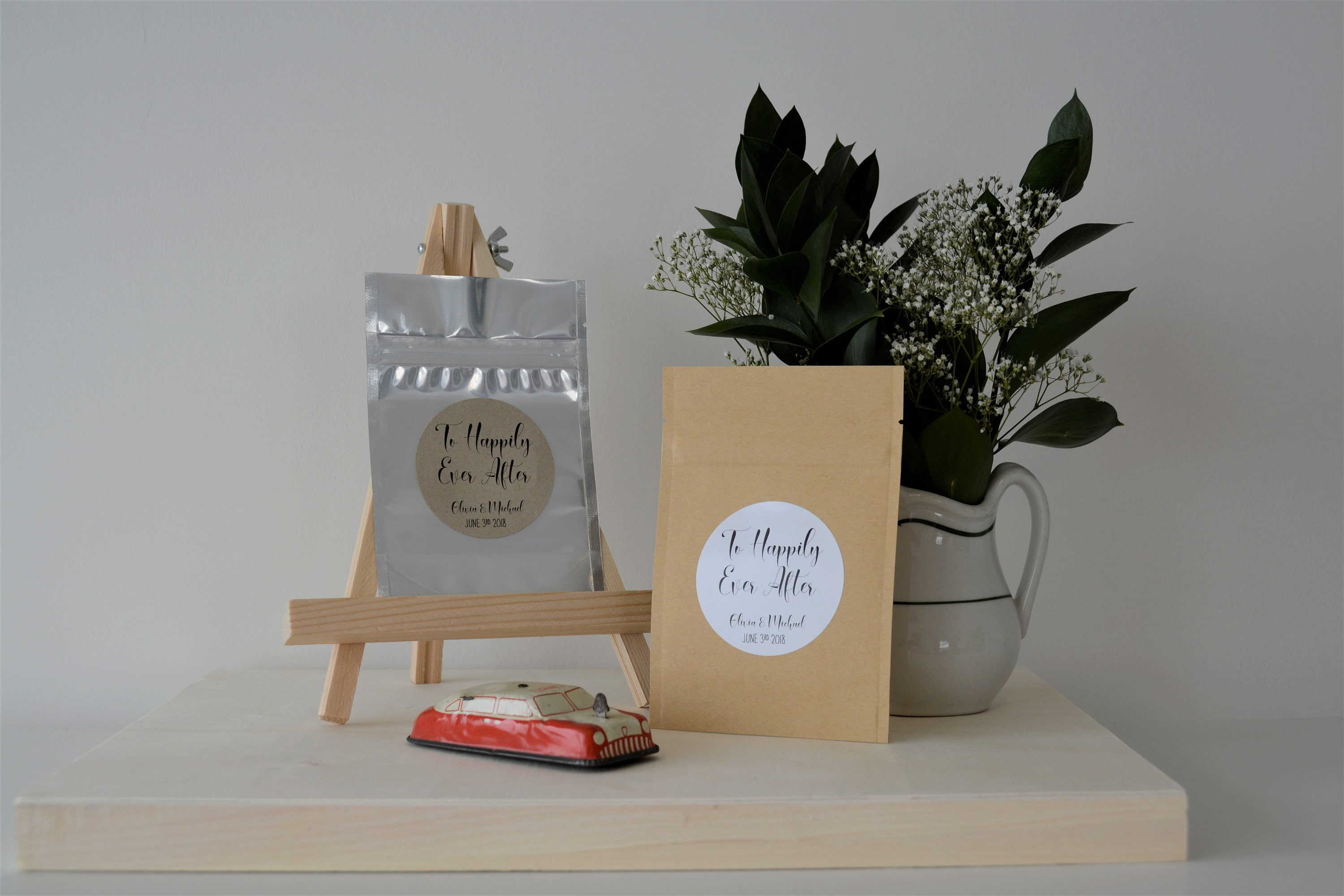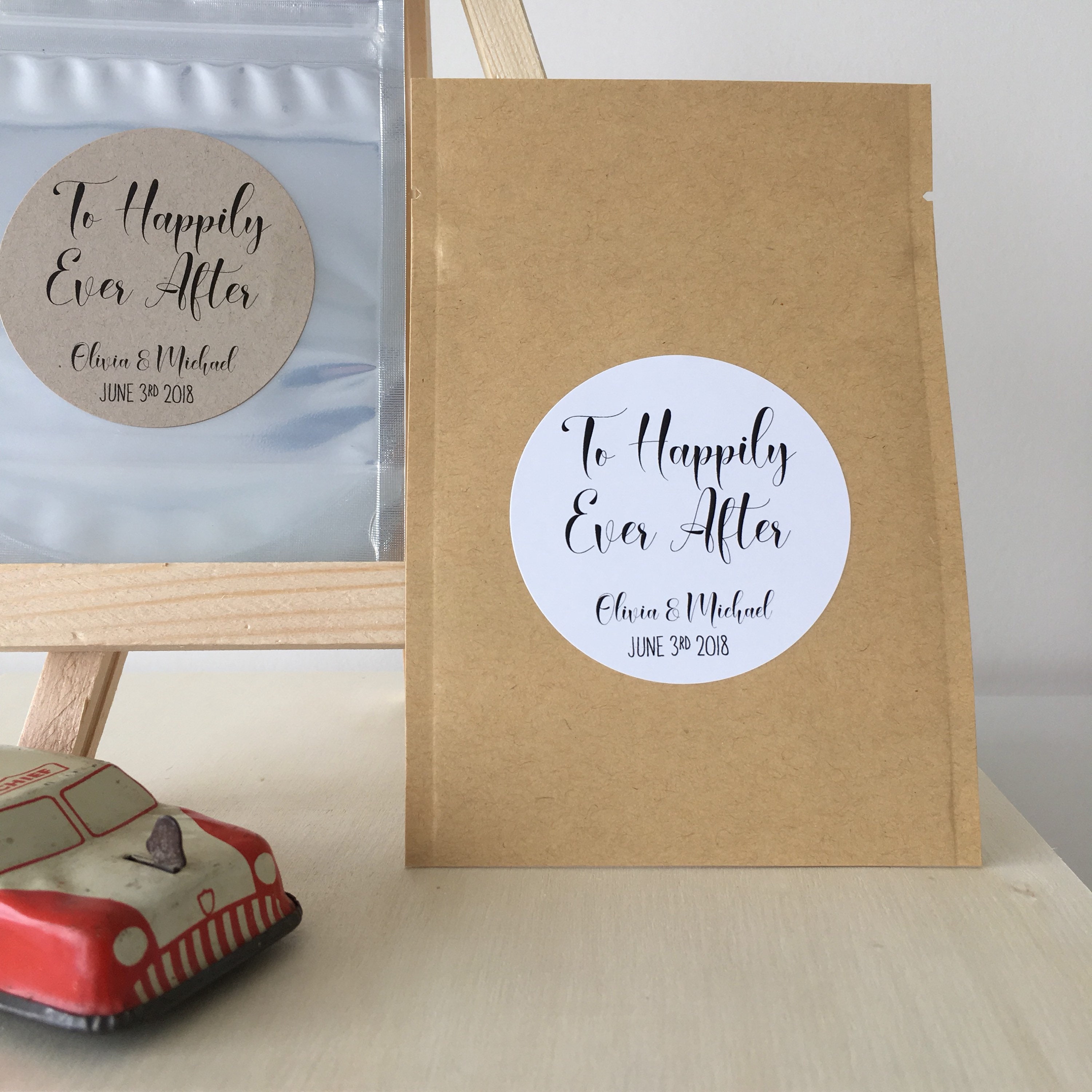 Wedding favor treat bags featuring the saying "To Happily Ever After"