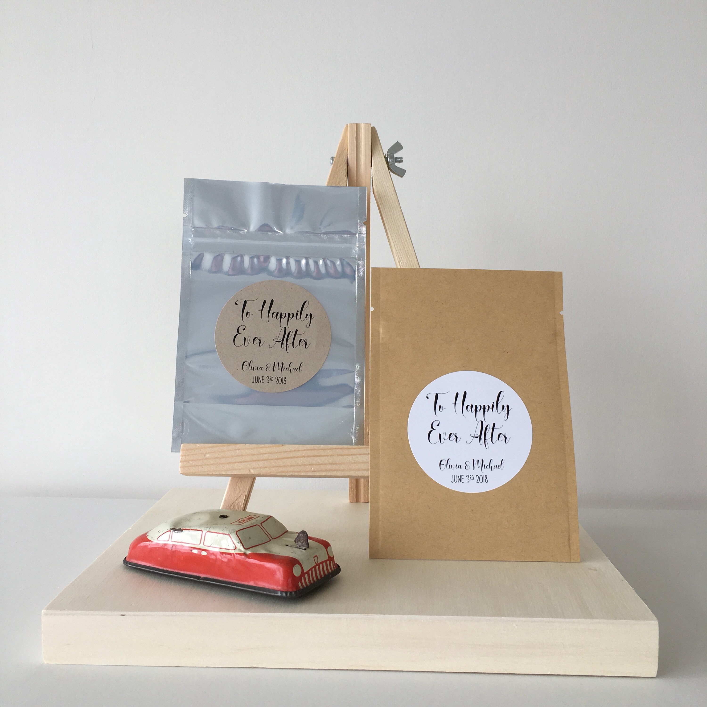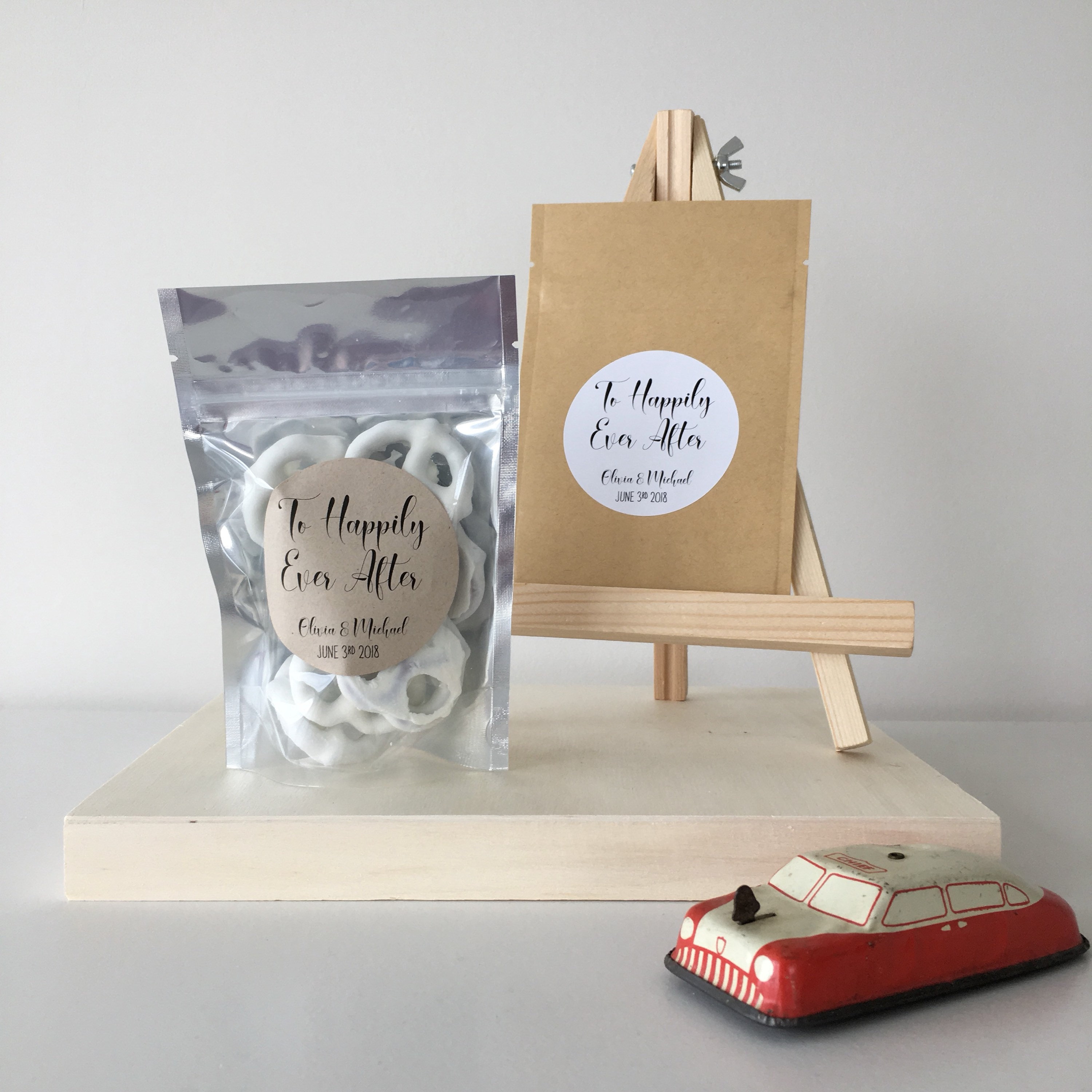 Labels are customized with the couples names as well as the date of the wedding.