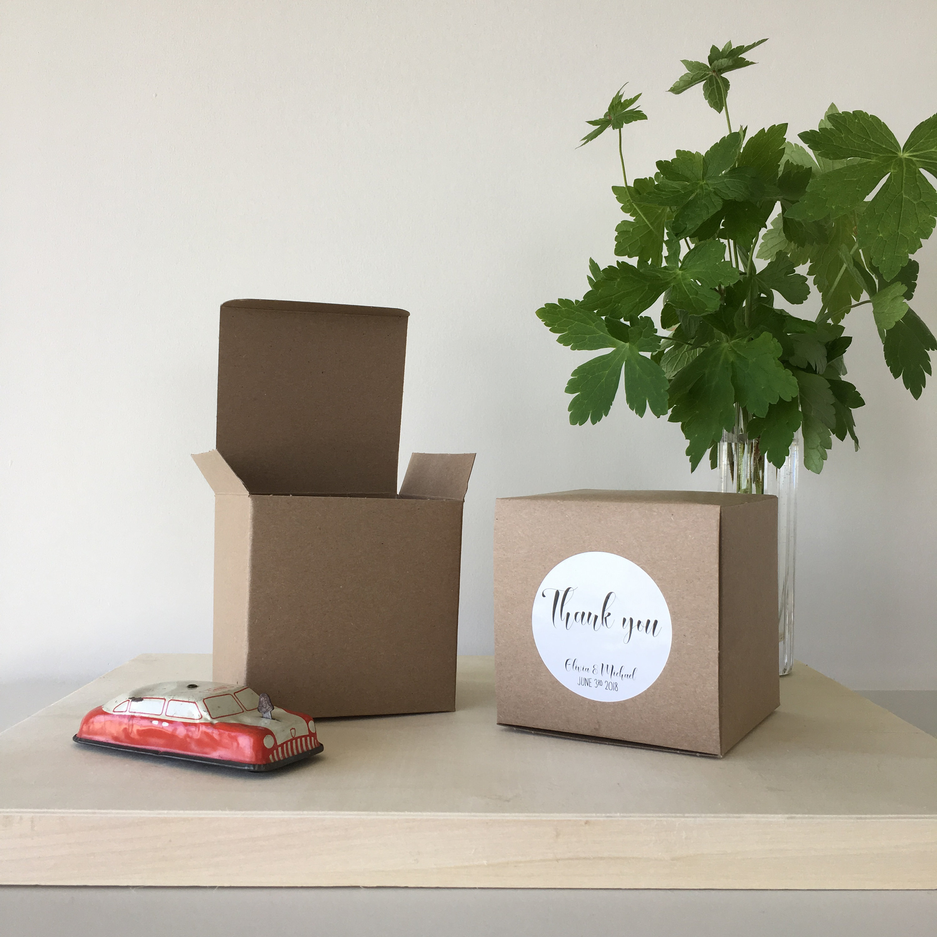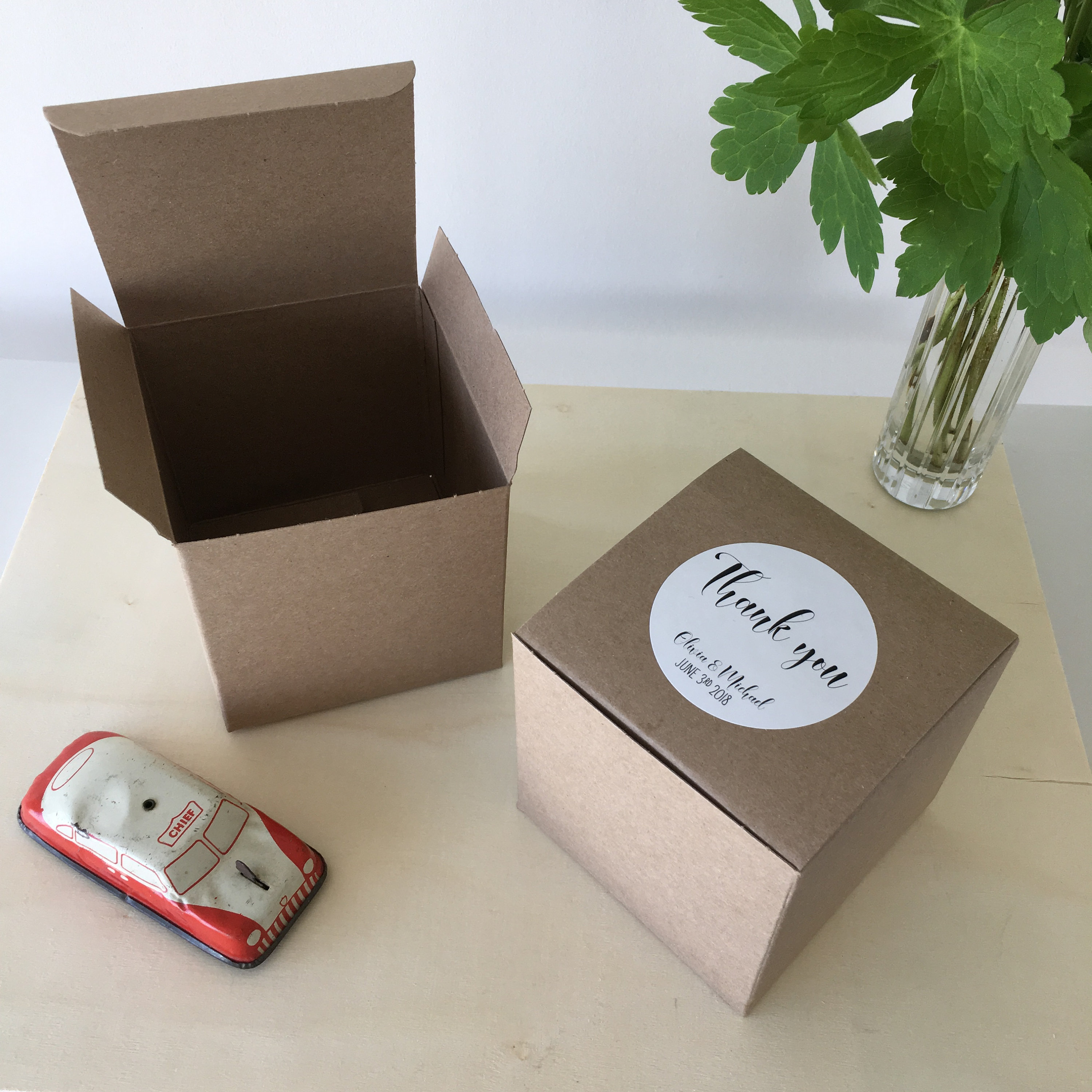 Boxes ship flat with the labels already affixed, they quickly and easily fold together to be filled with treats and be gifted to your guests!