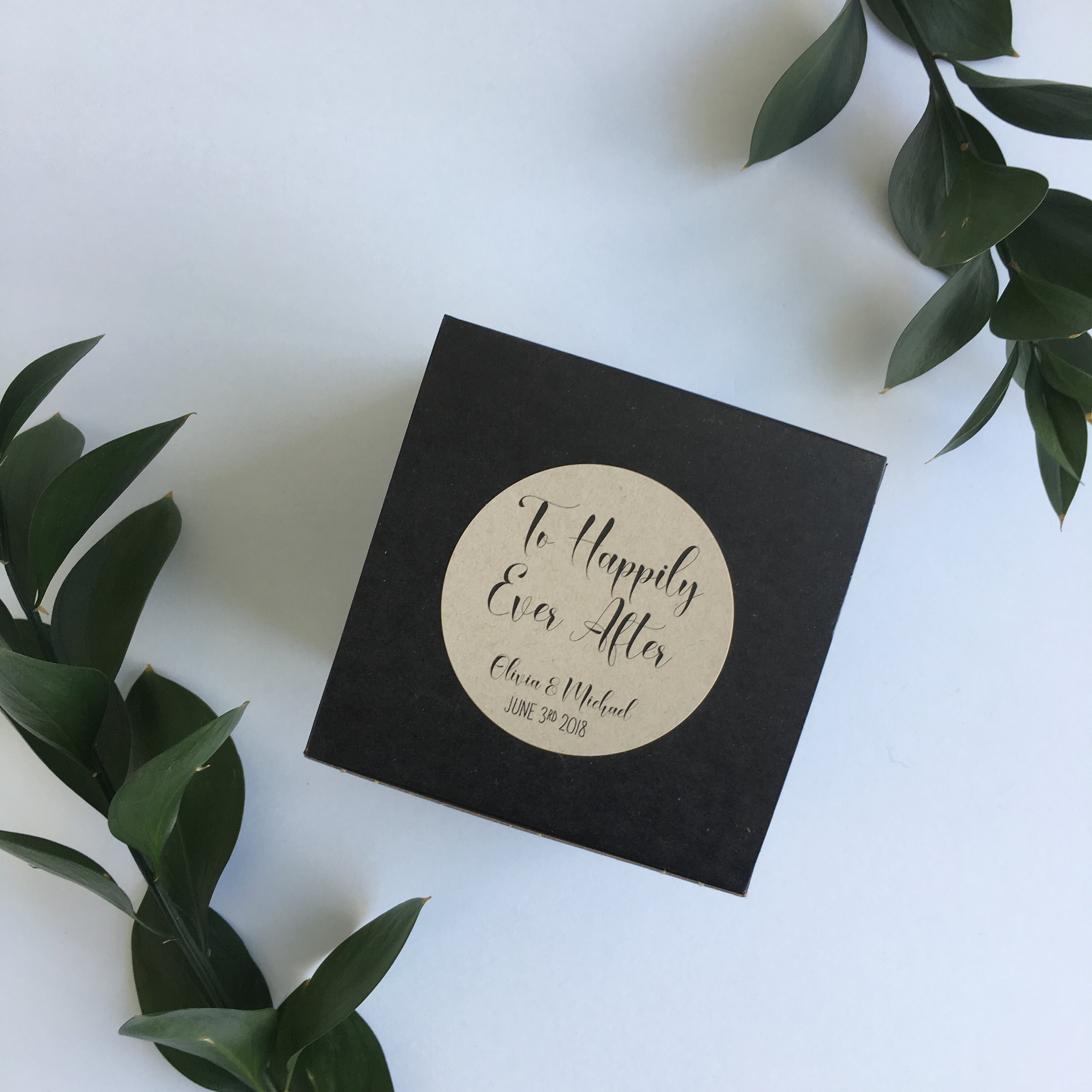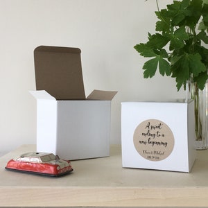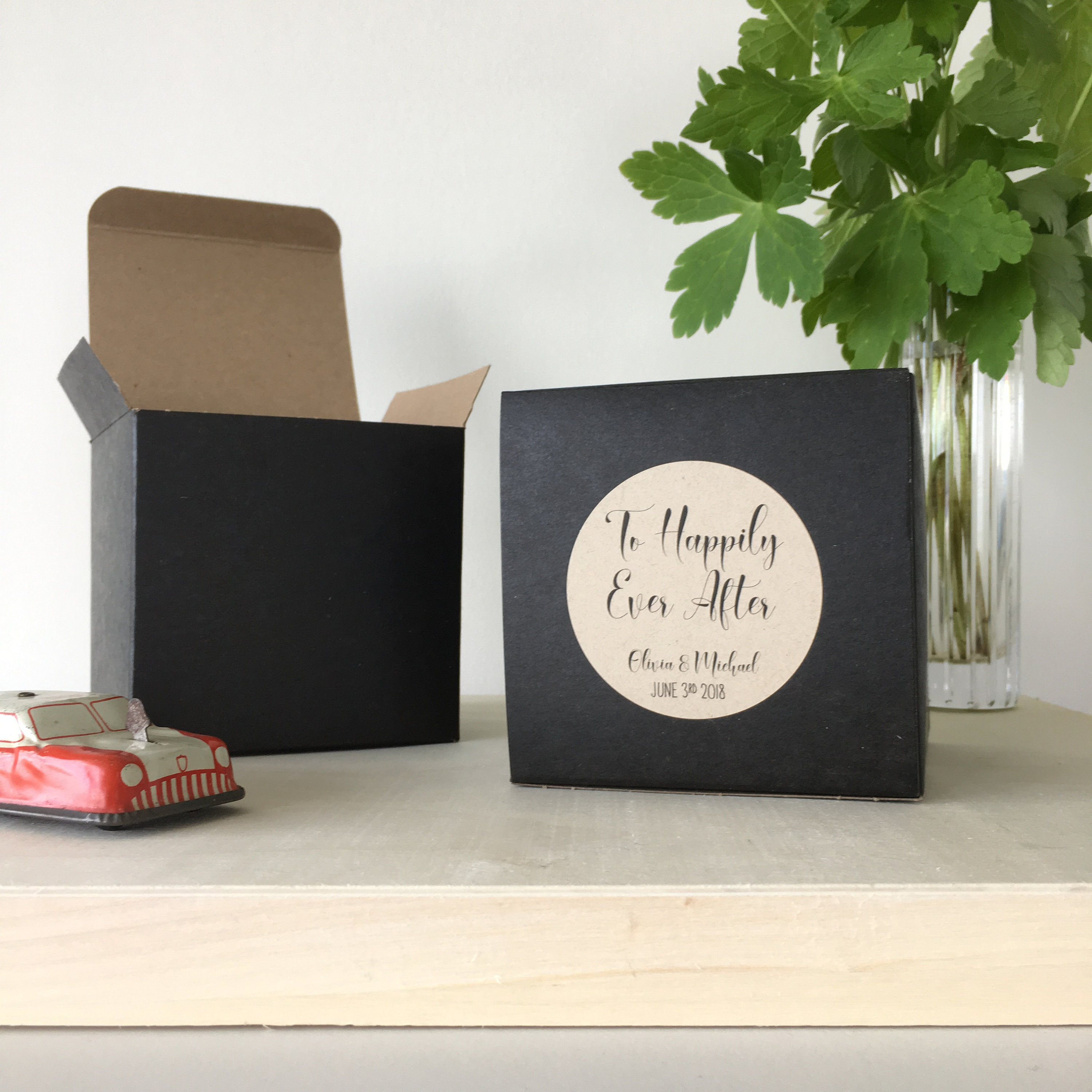 Boxes ship flat with the labels already affixed, they quickly and easily fold together to be filled with treats and be gifted to your guests!
