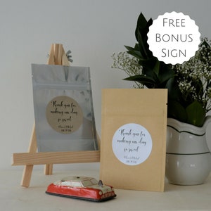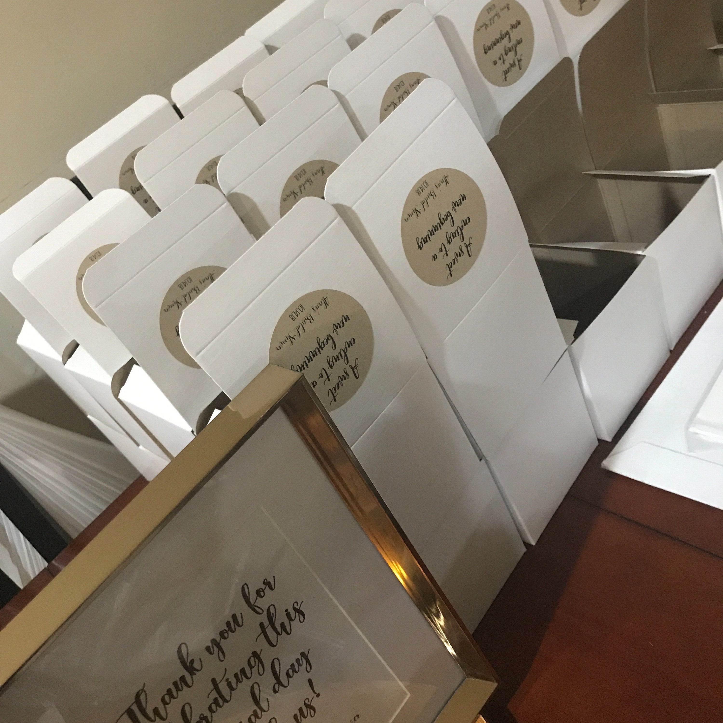 Boxes ship flat with the labels already affixed, they quickly and easily fold together to be filled with treats and be gifted to your guests!