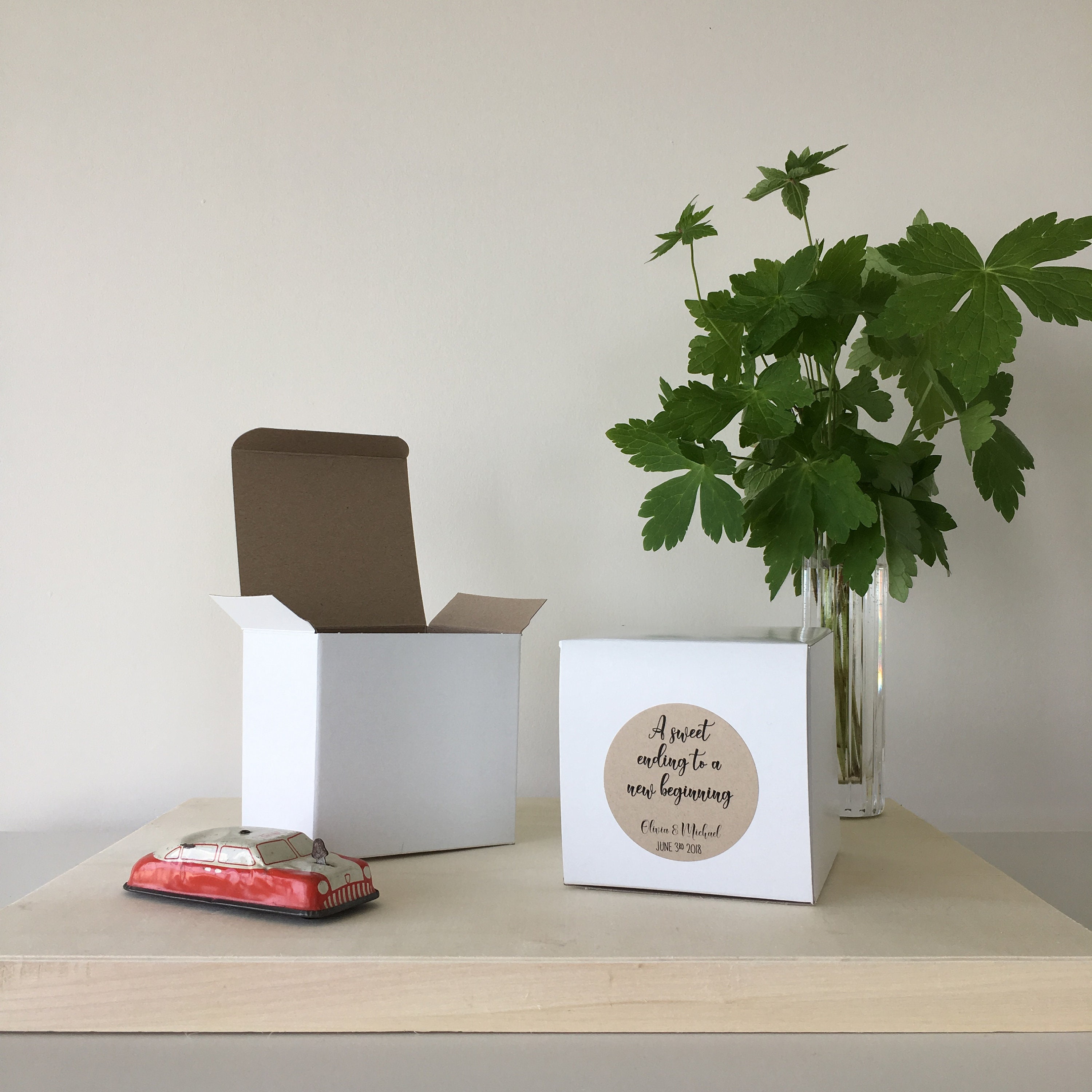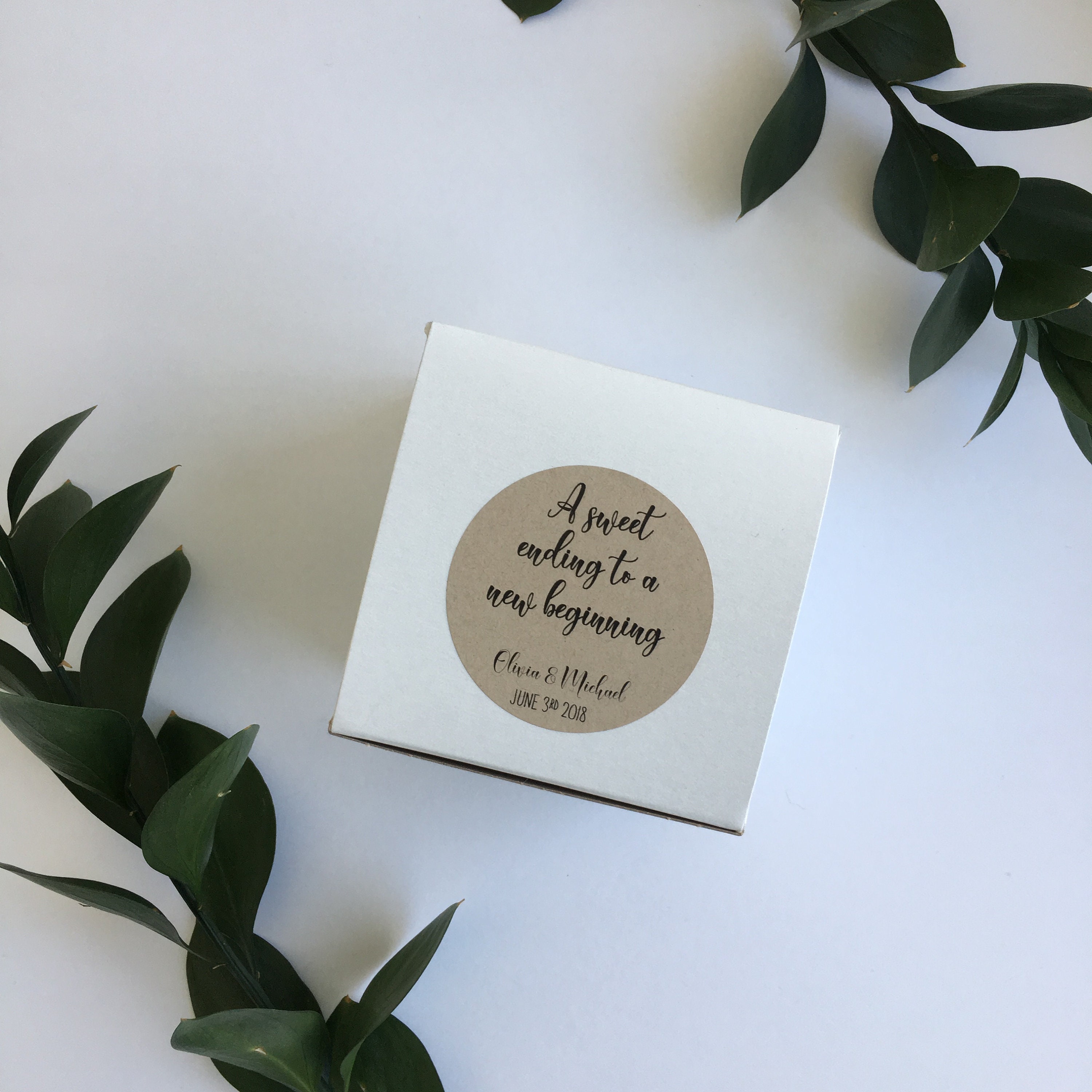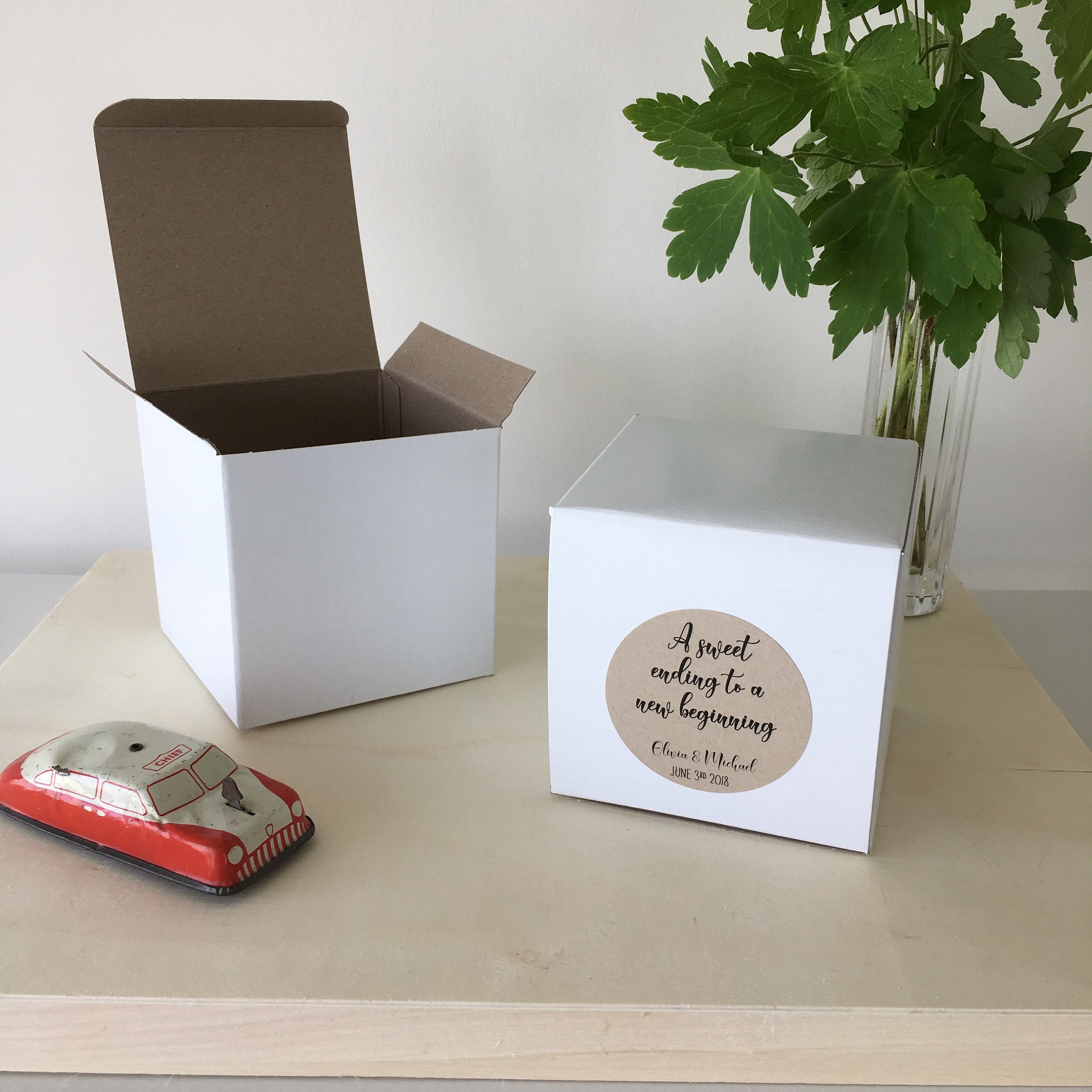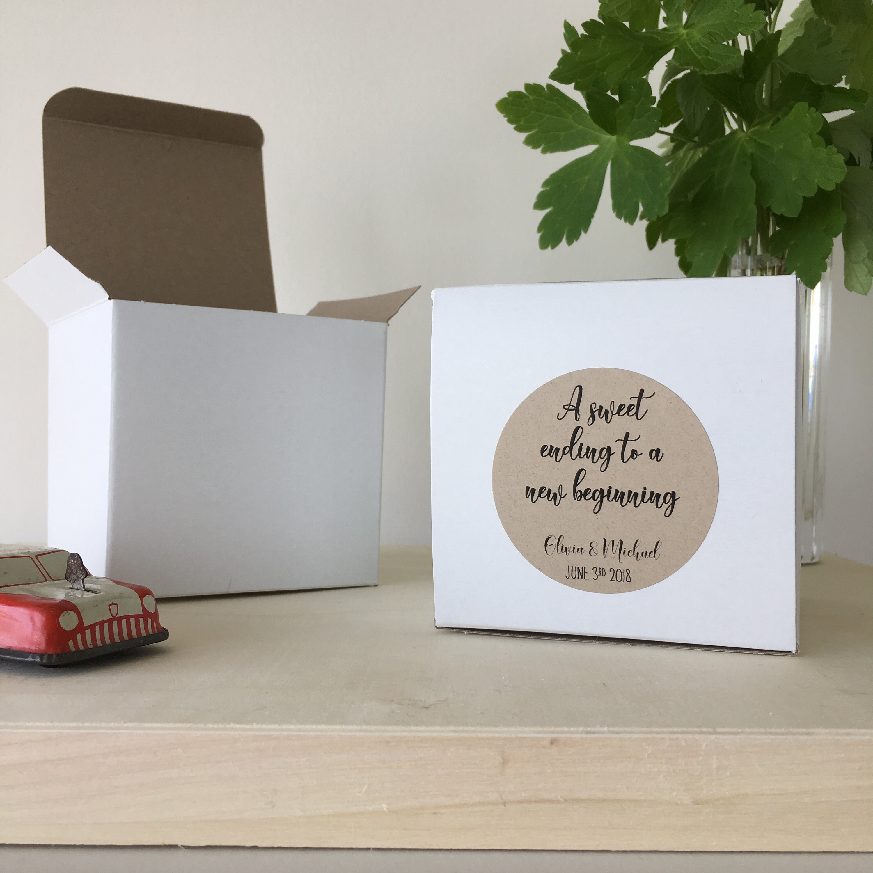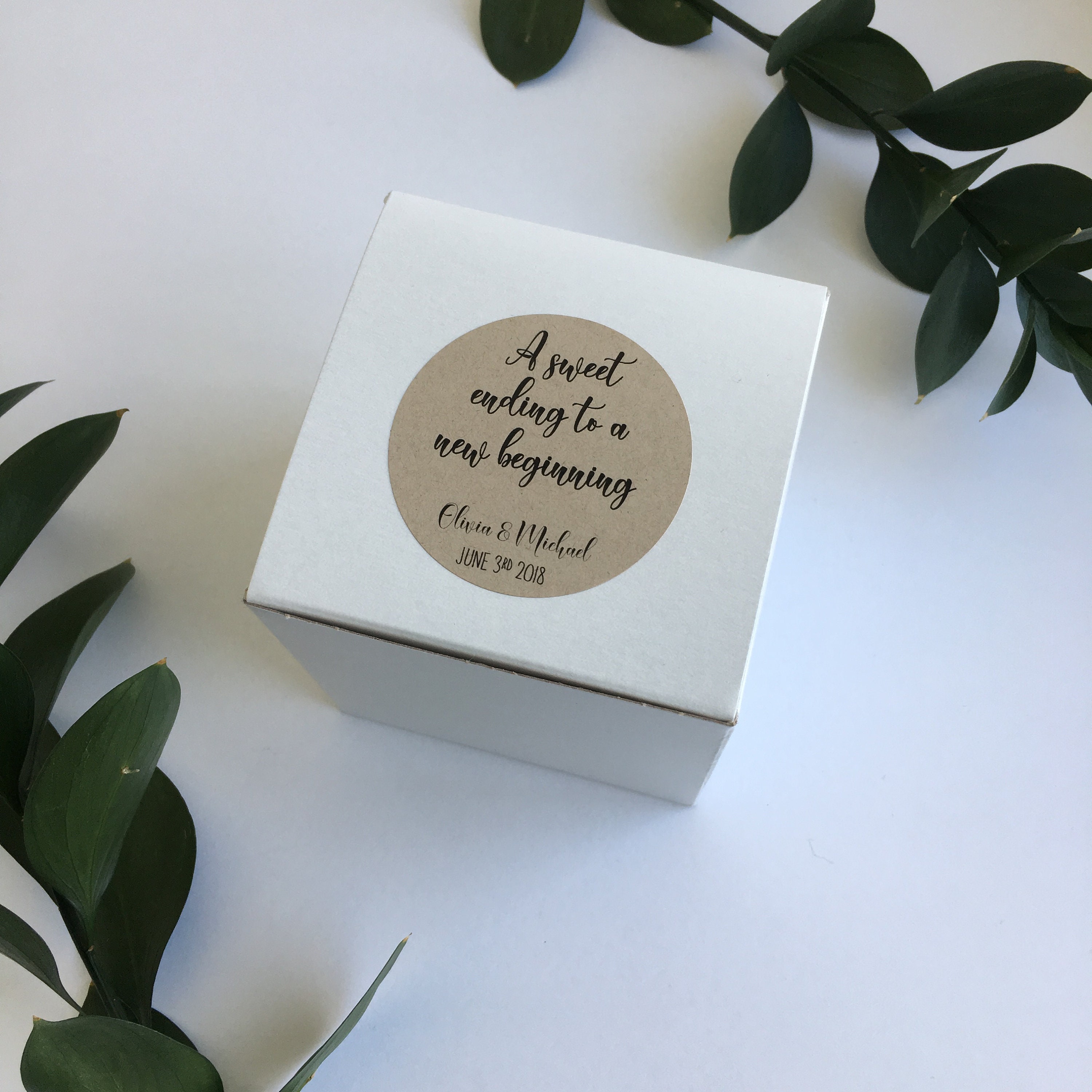 Set of 10 Wedding favor square treat boxes featuring the saying "A sweet ending to a new beginning"