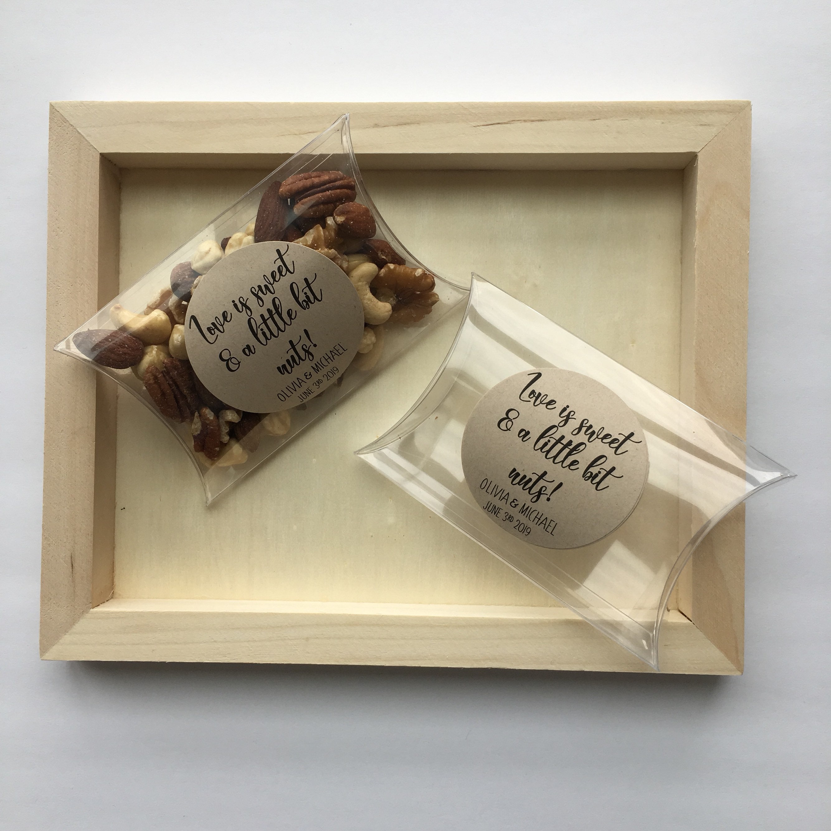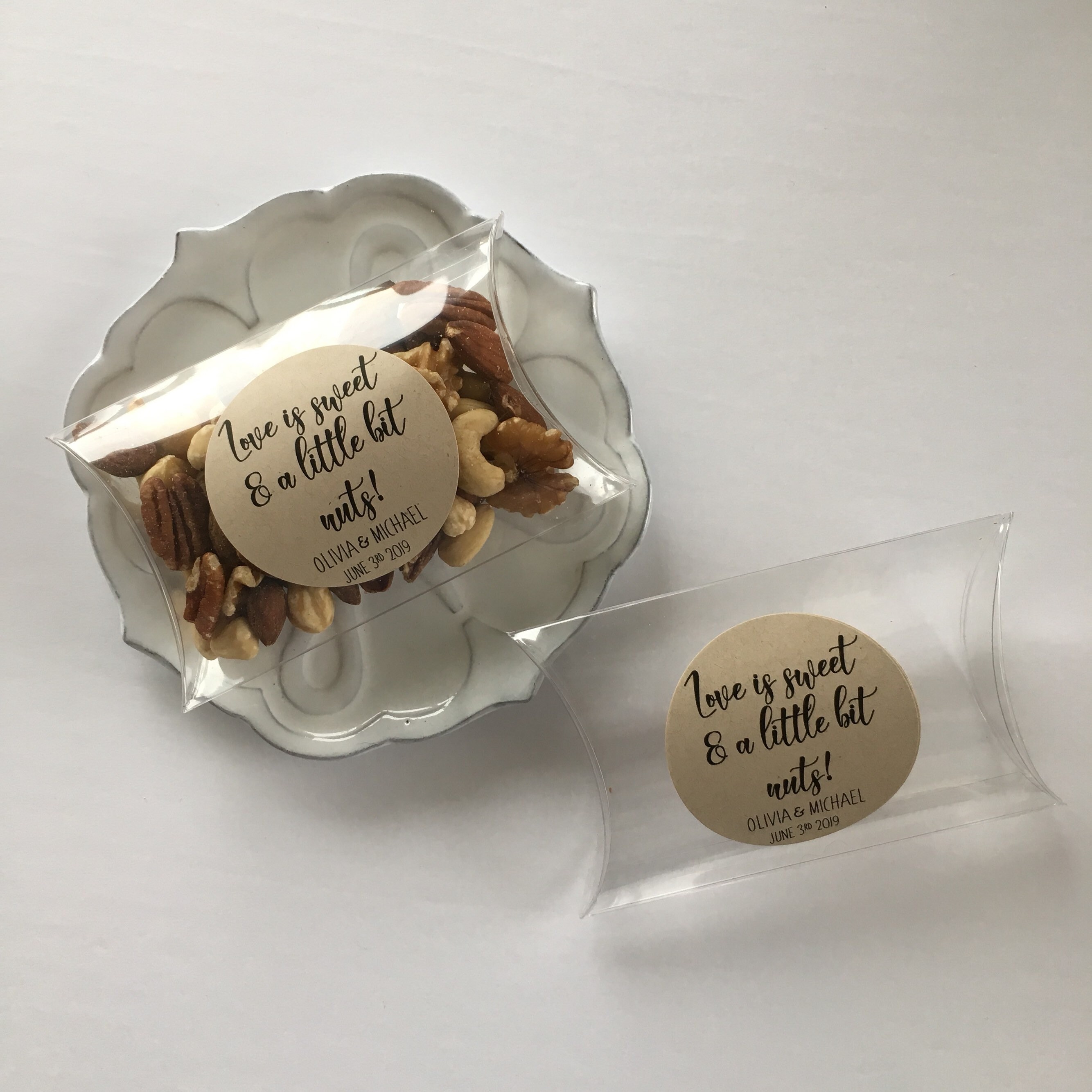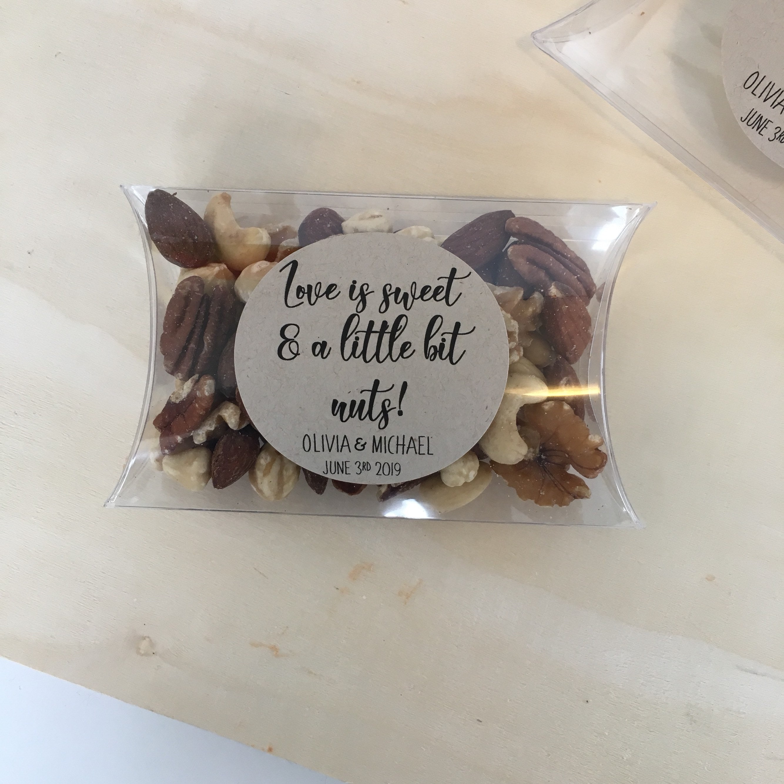 Wedding favor pillow treat boxes featuring the saying "Love is sweet & a little bit nuts"