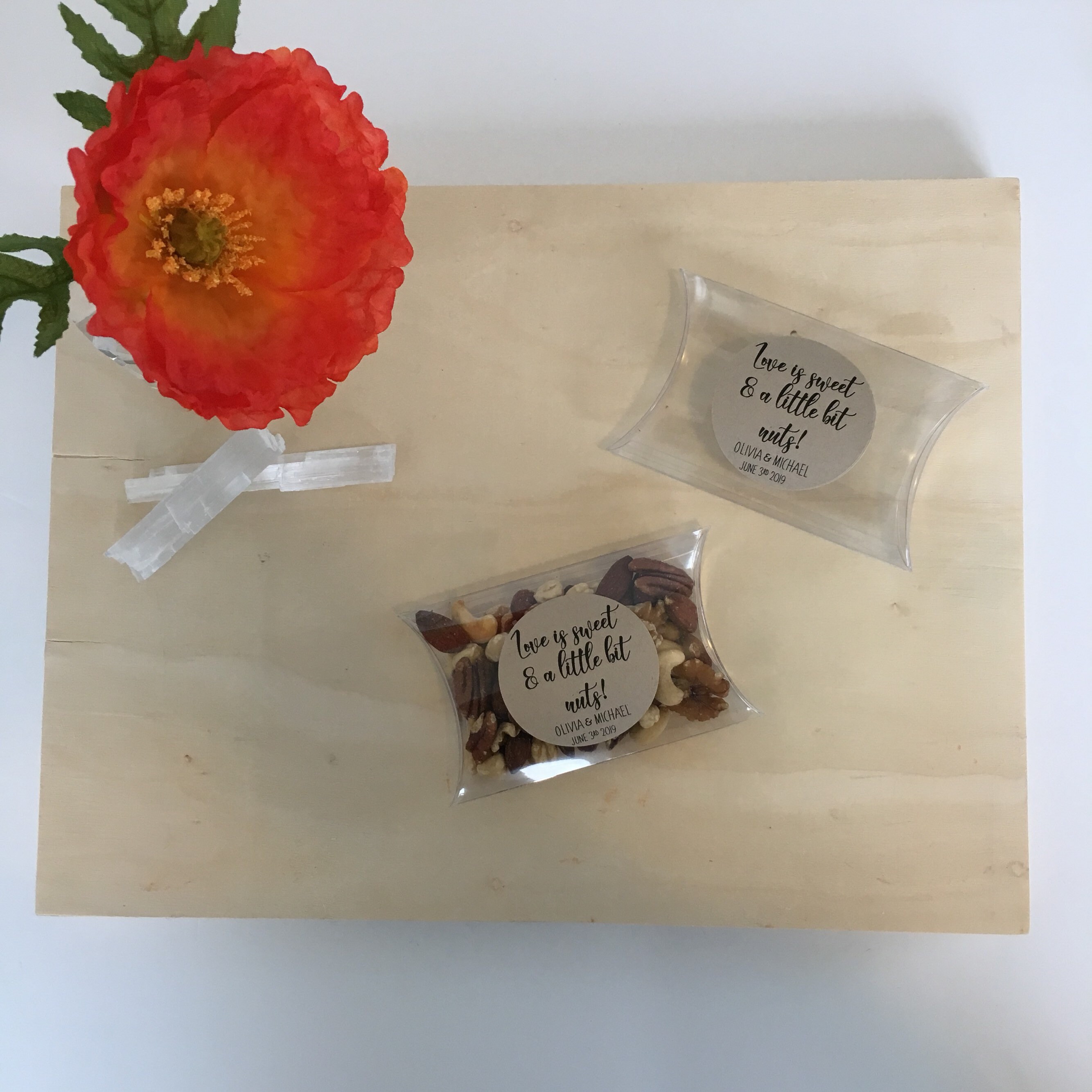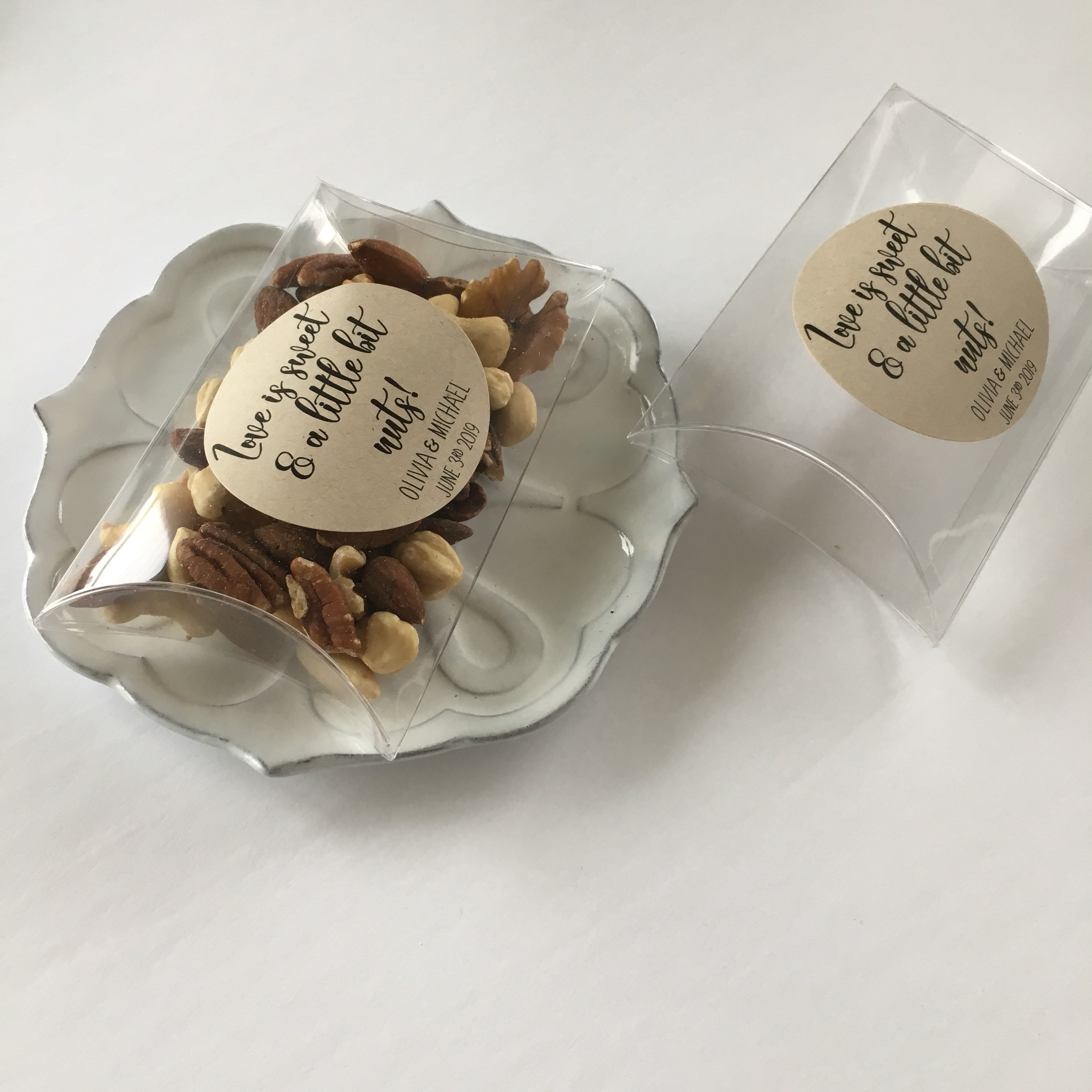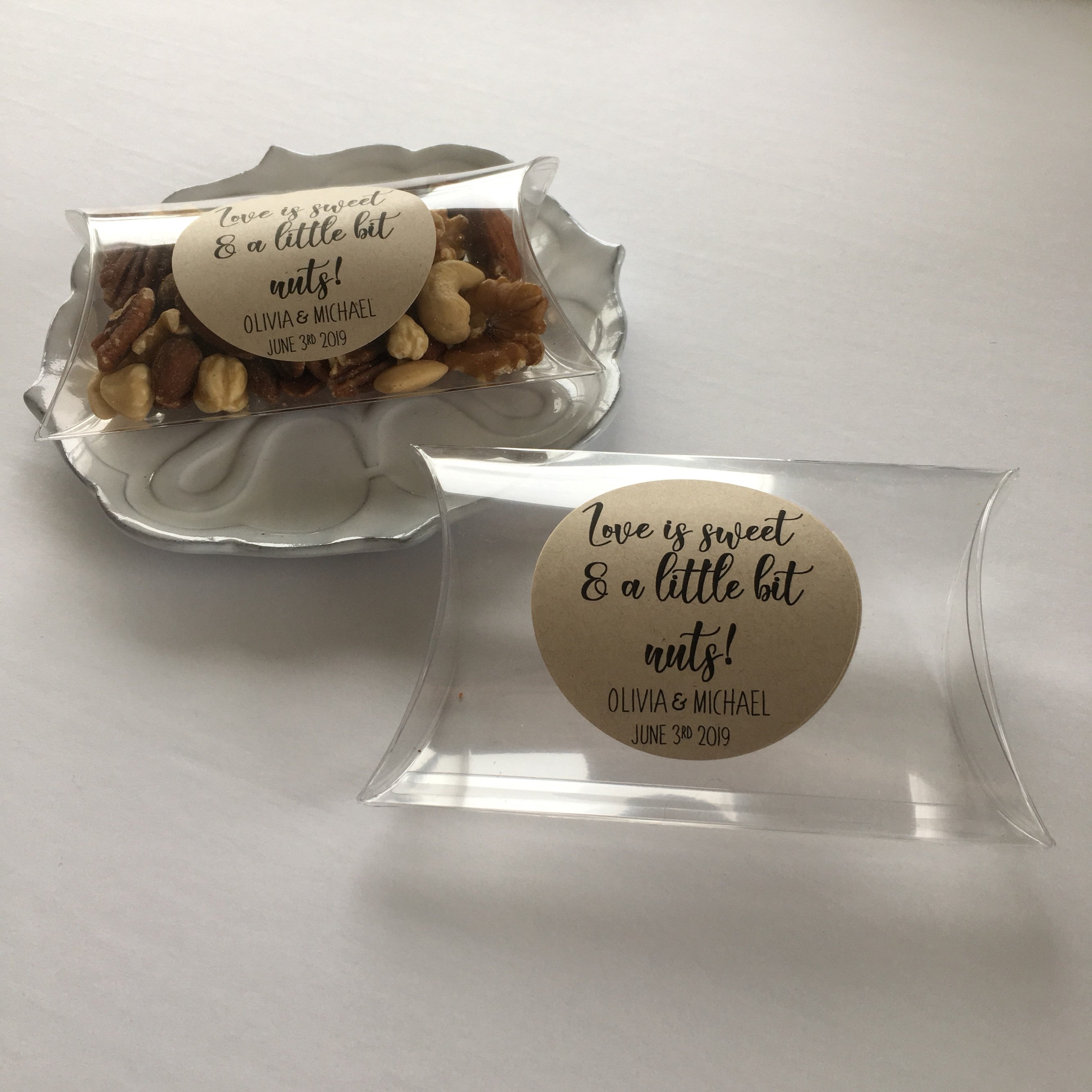 Wedding favor pillow treat boxes featuring the saying "Love is sweet & a little bit nuts"