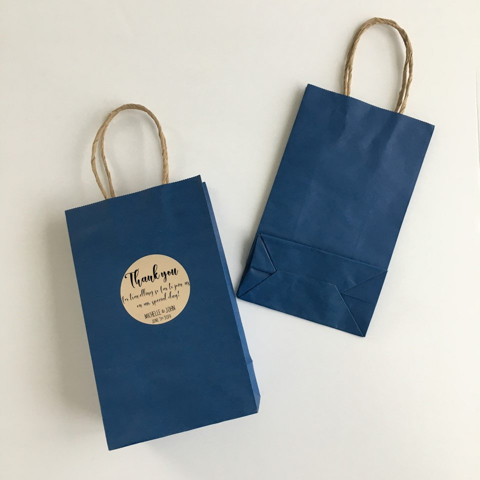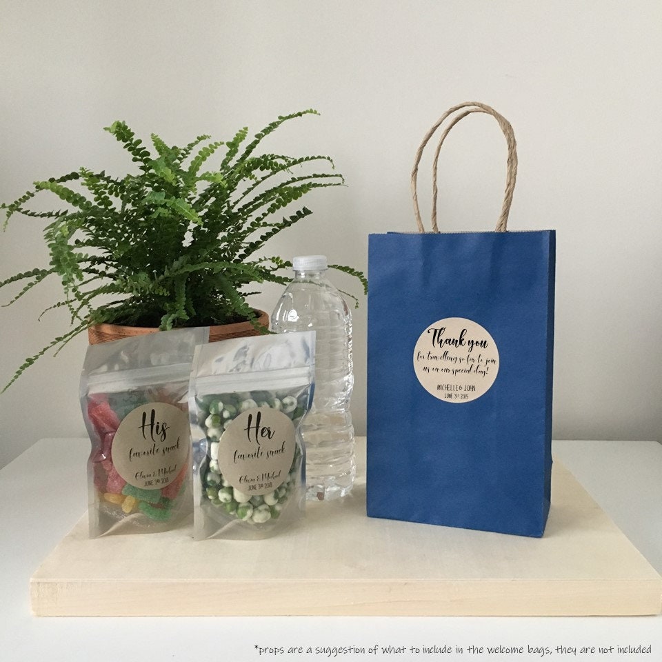 Perfect to fill with drinks and snacks to give your guests as a welcome gift when they arrive for your wedding. Or fill these with snacks and a thank you note to have the hotel put them in guests rooms as a special midnight surprise when they get home from celebrating with you!