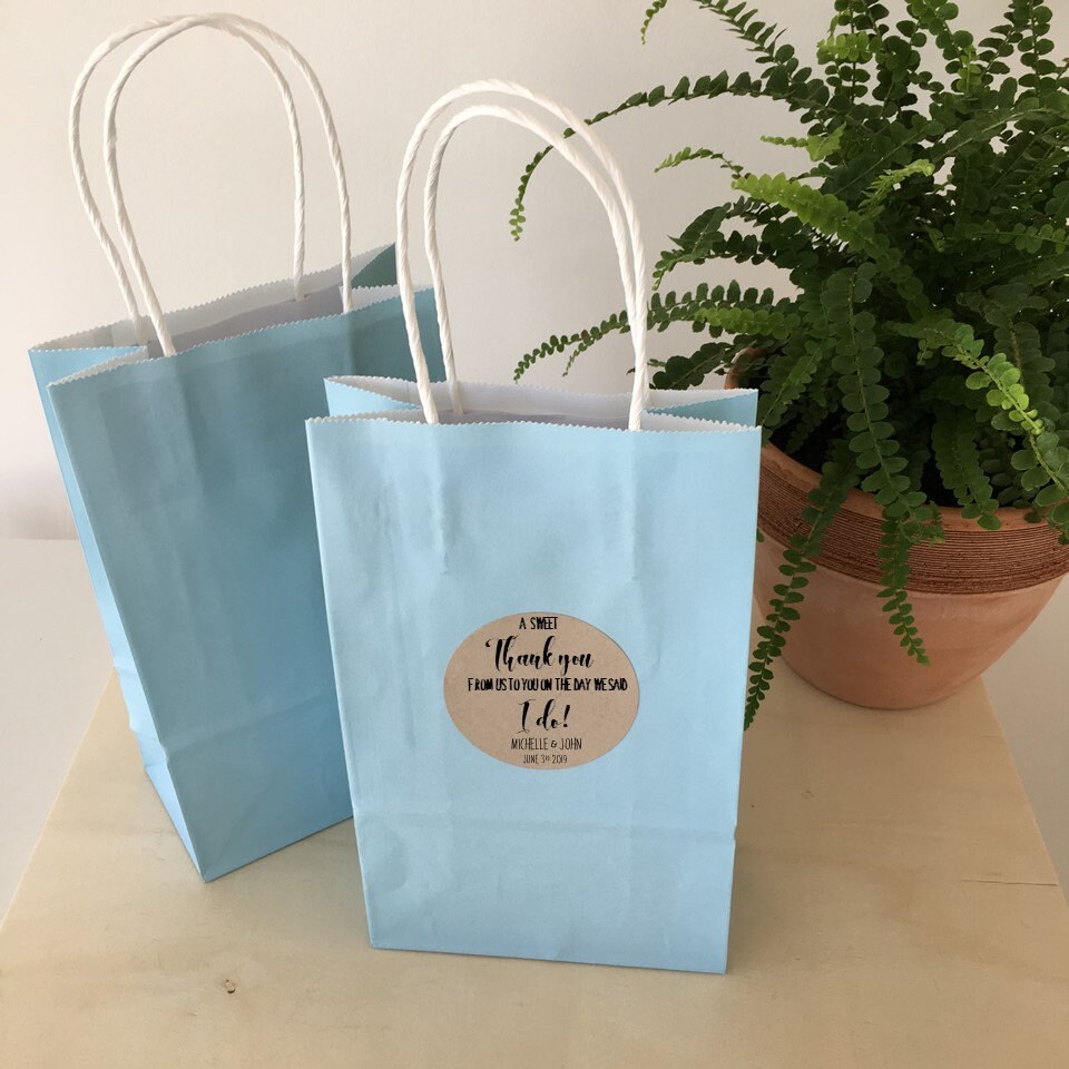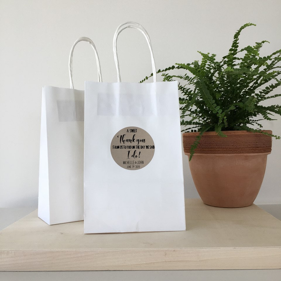Wedding hotel guest welcome bags featuring the saying "A sweet thank you from us to you on the day we said I do!" Personalized along with the names of the couple and the wedding date.