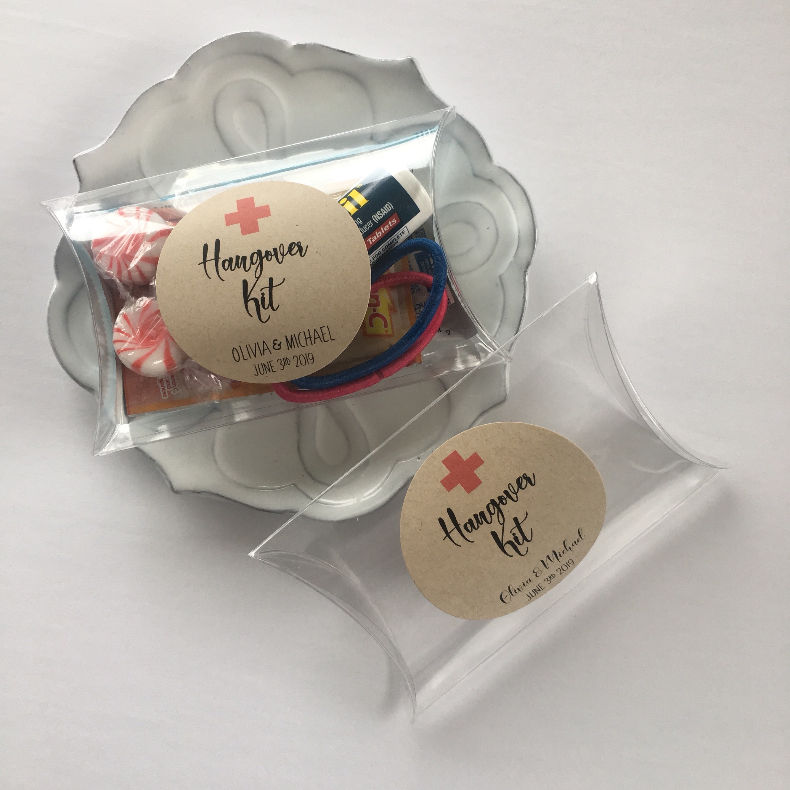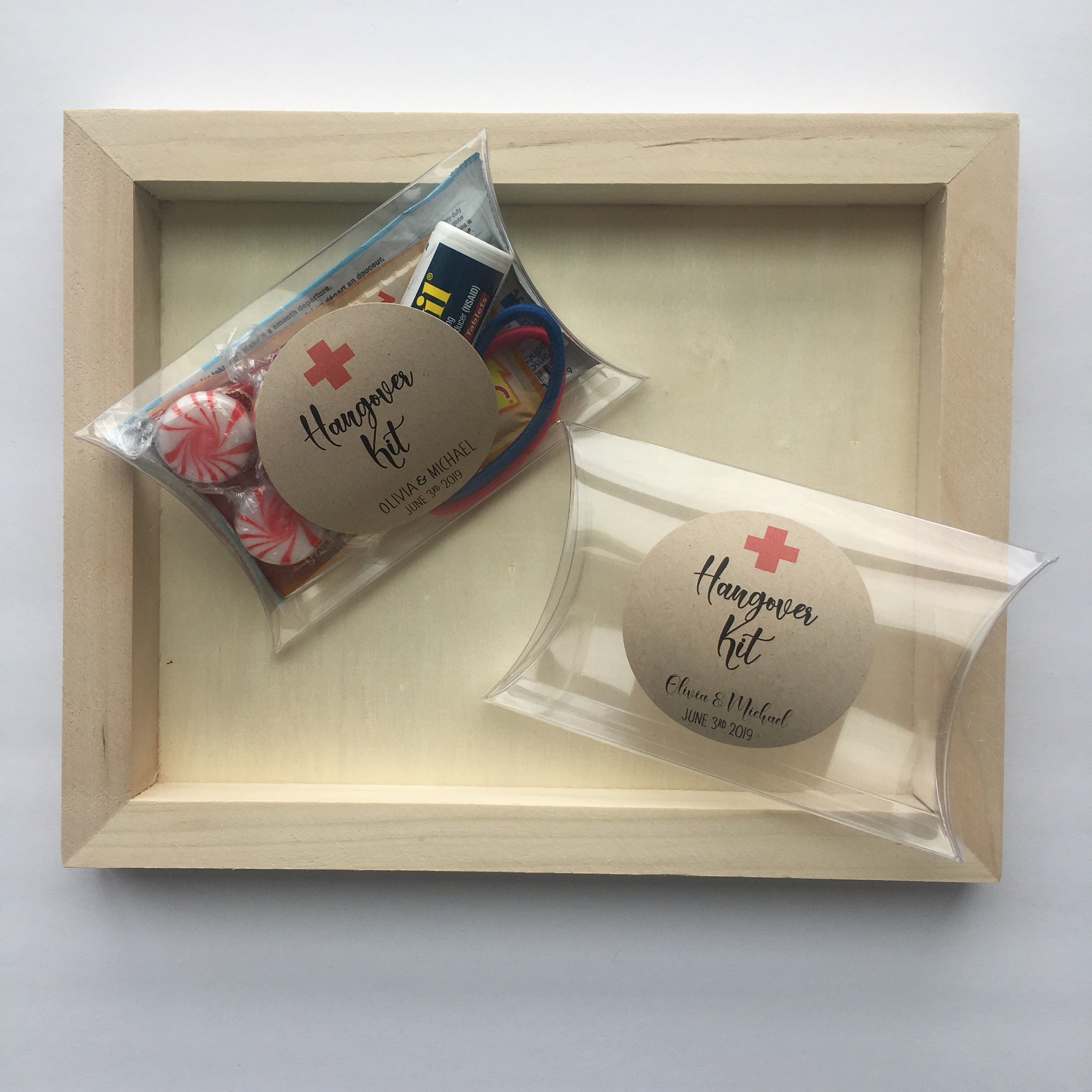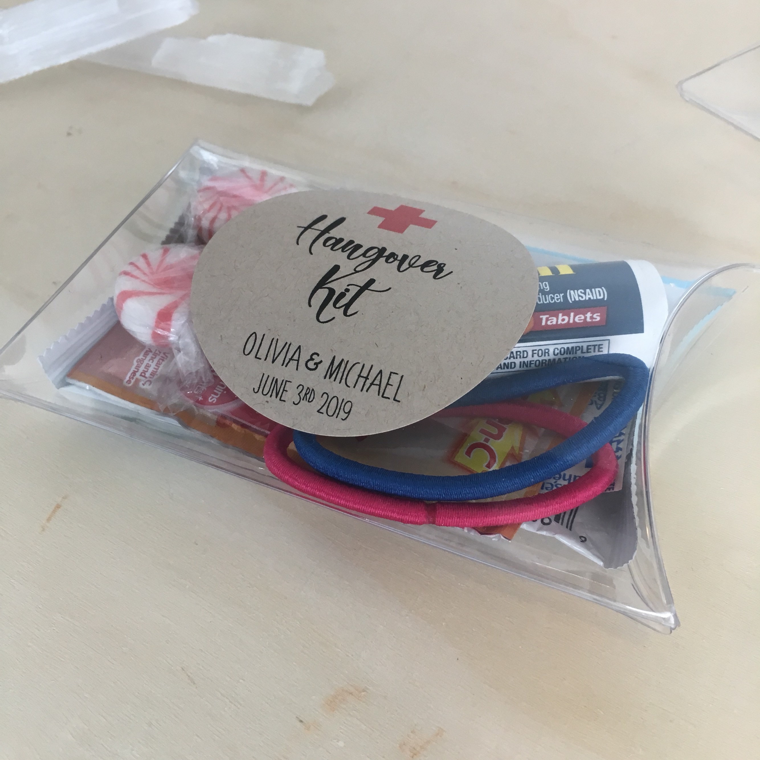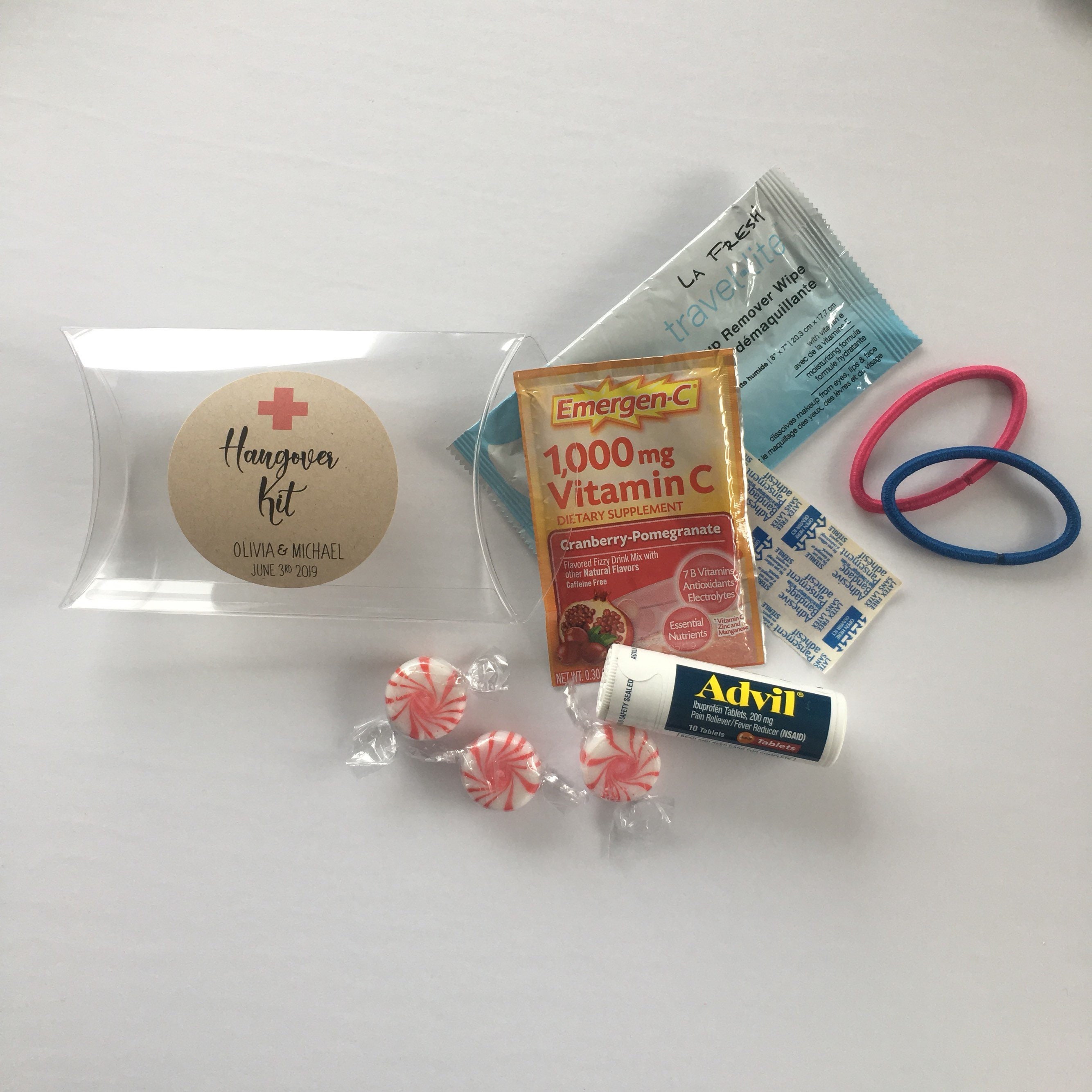 Wedding favor pillow treat boxes featuring the saying "Hangover Kit"