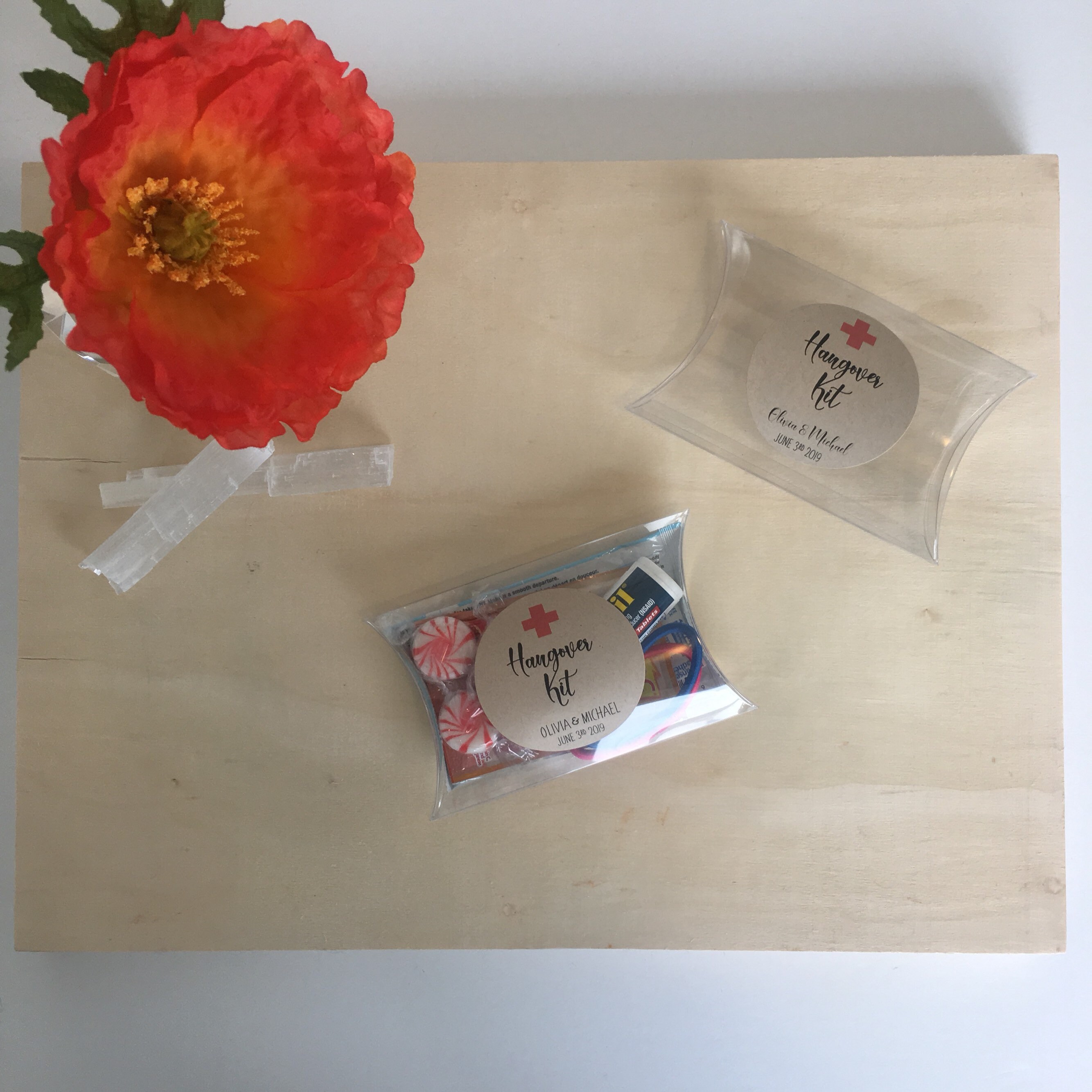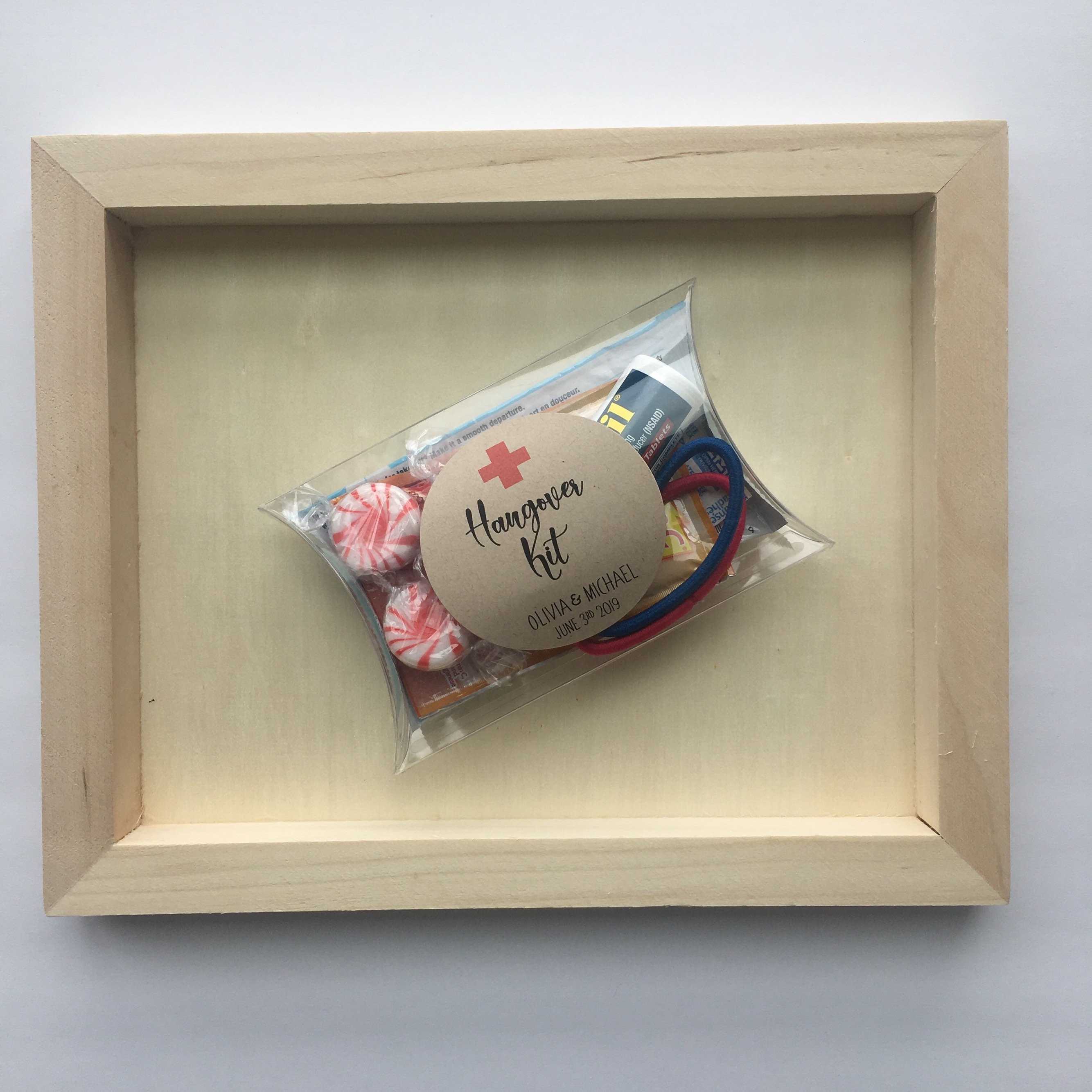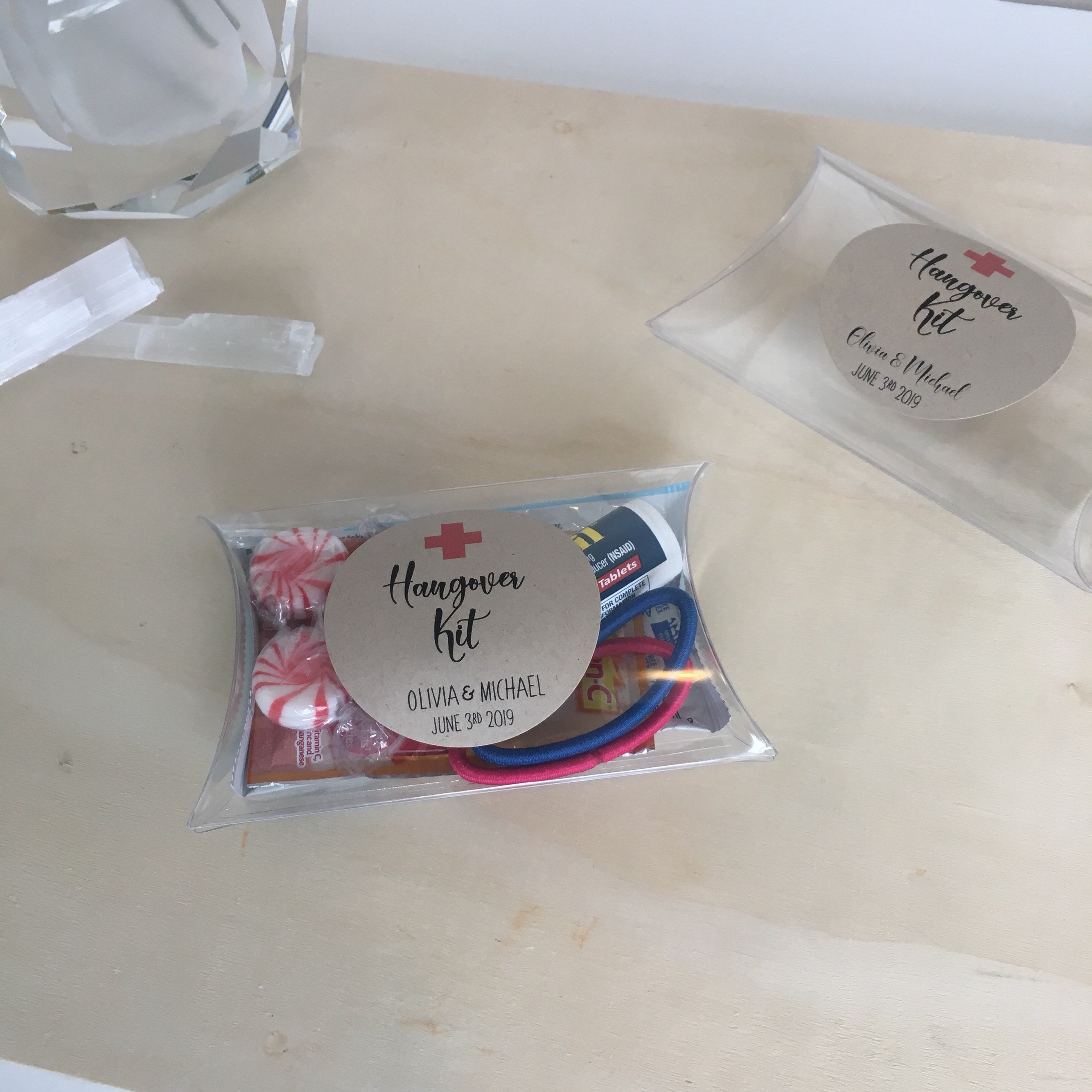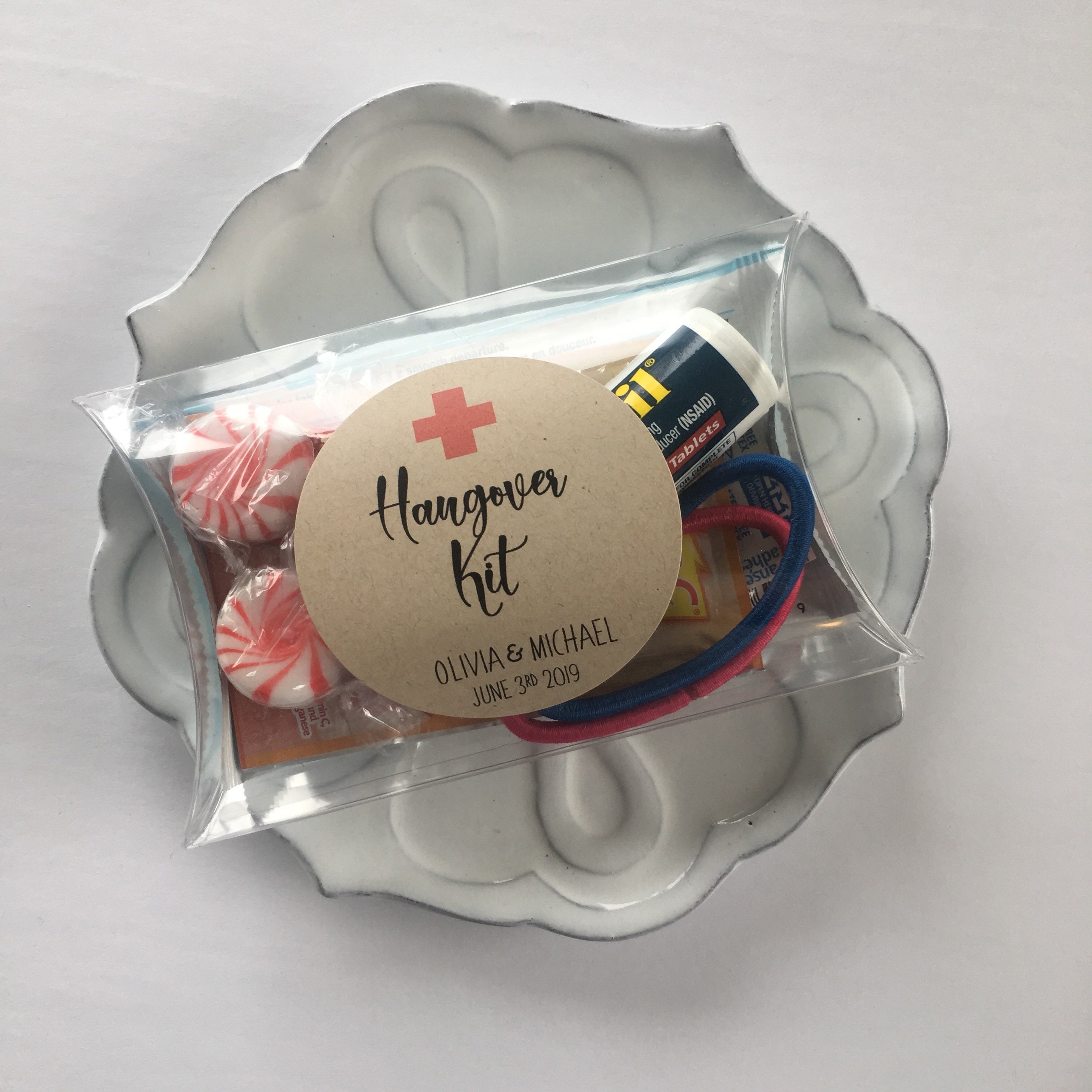 Wedding favor pillow treat boxes featuring the saying "Hangover Kit"