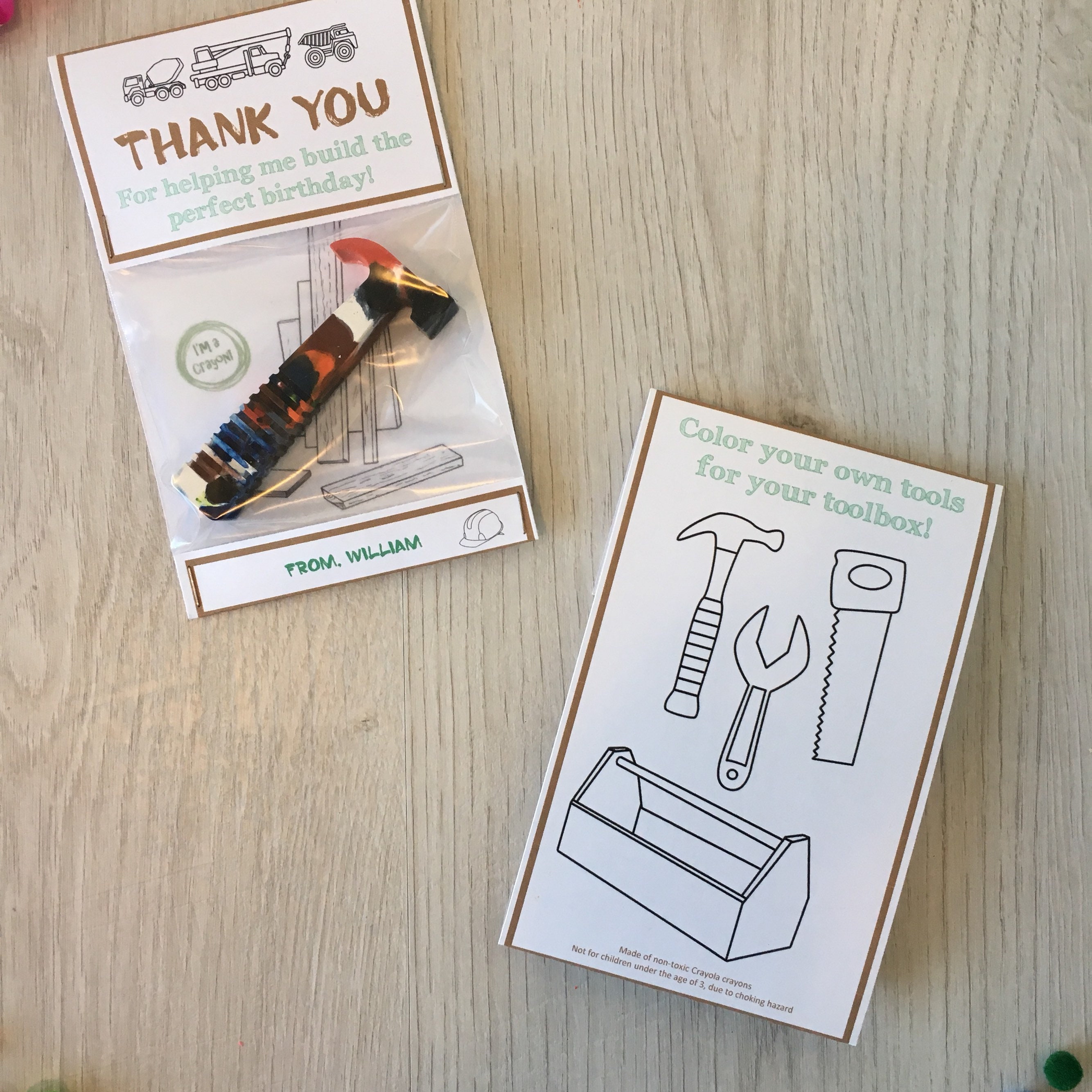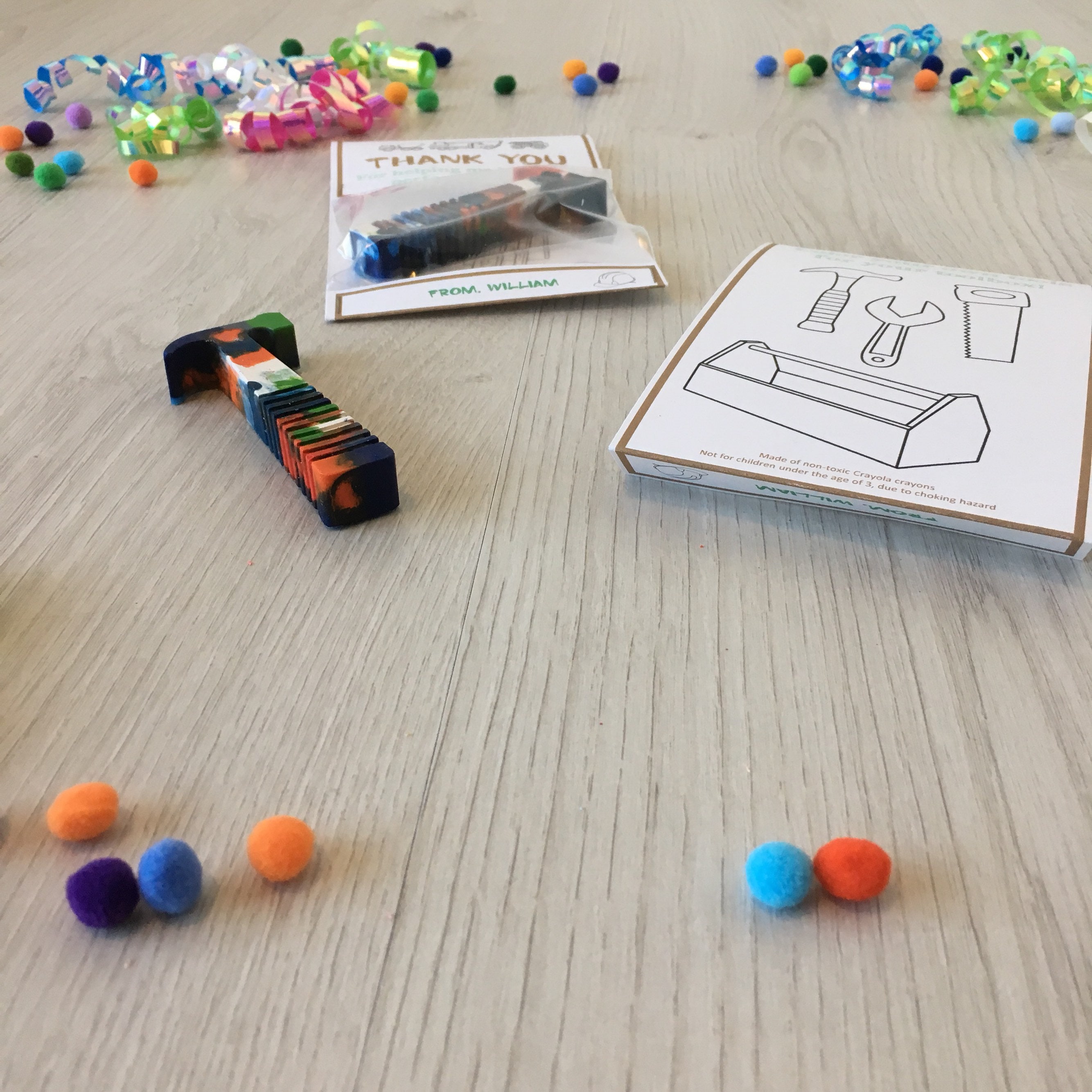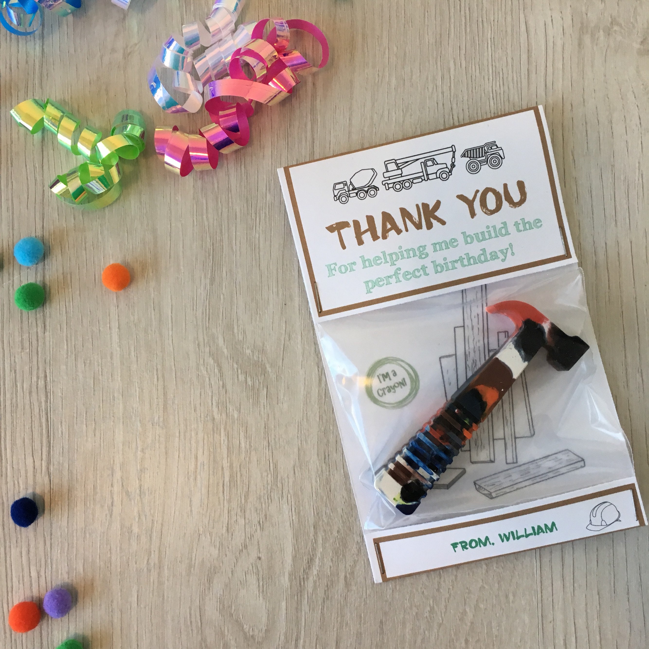 Handmade builder theme birthday party favors featuring a handmade hammer shaped multi-color crayon!