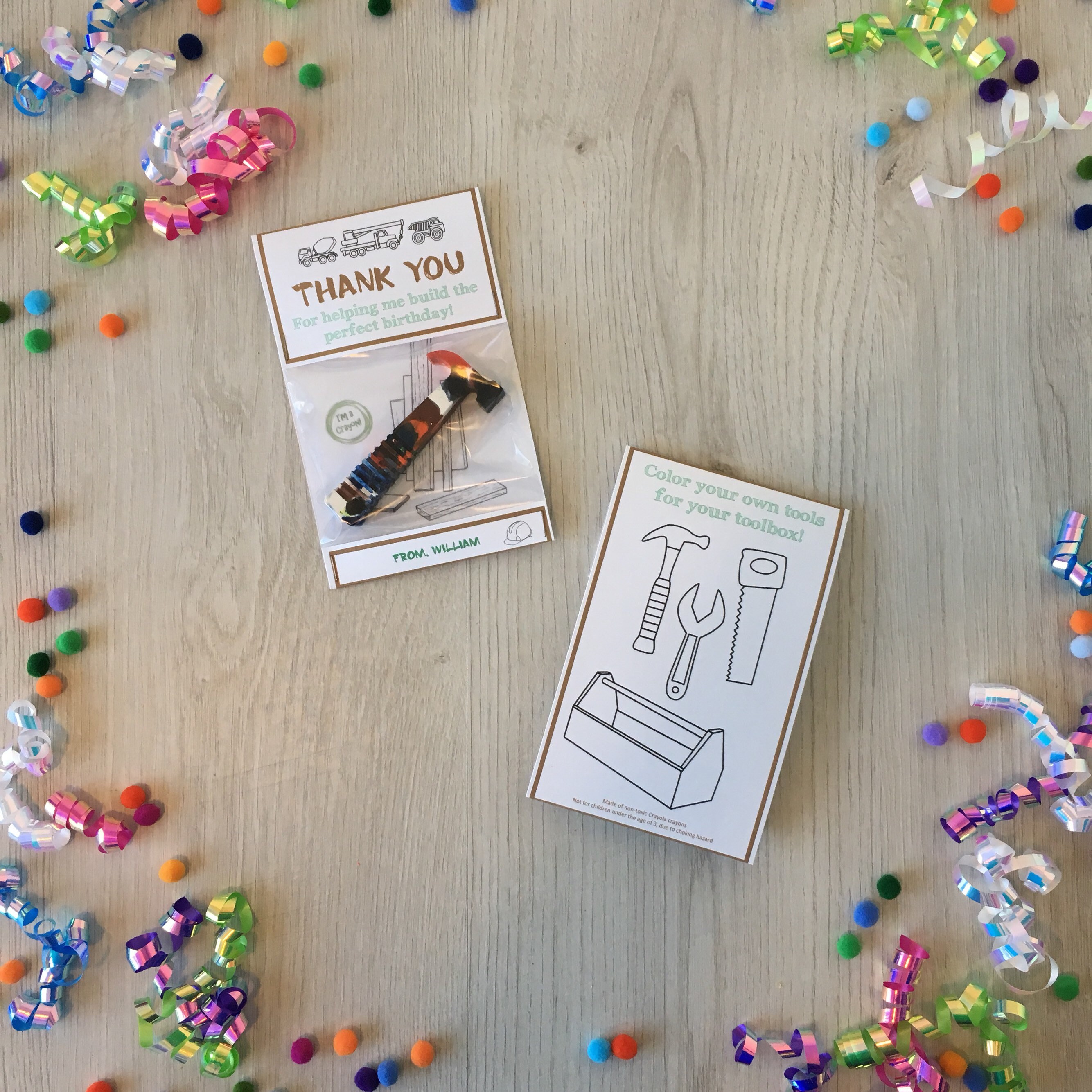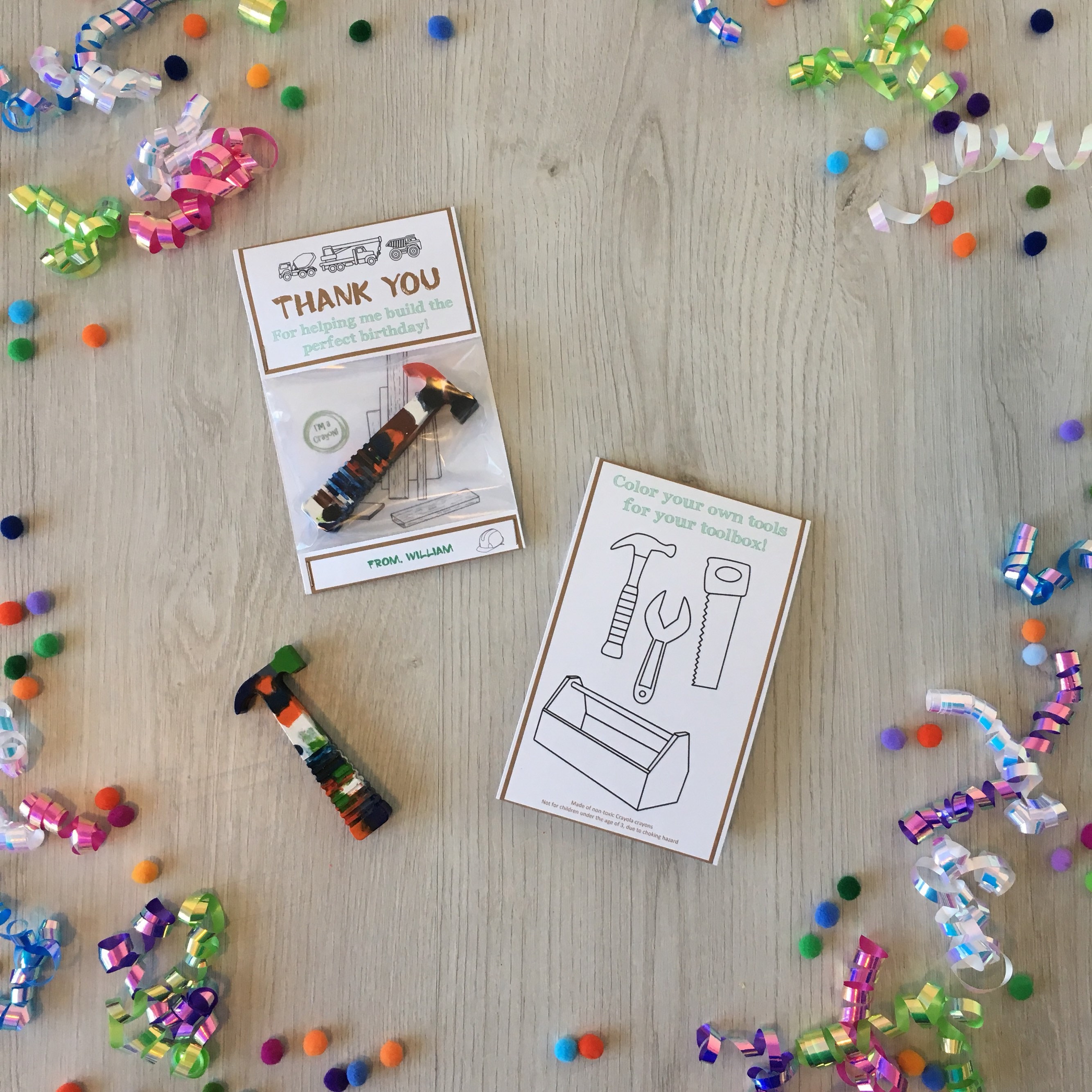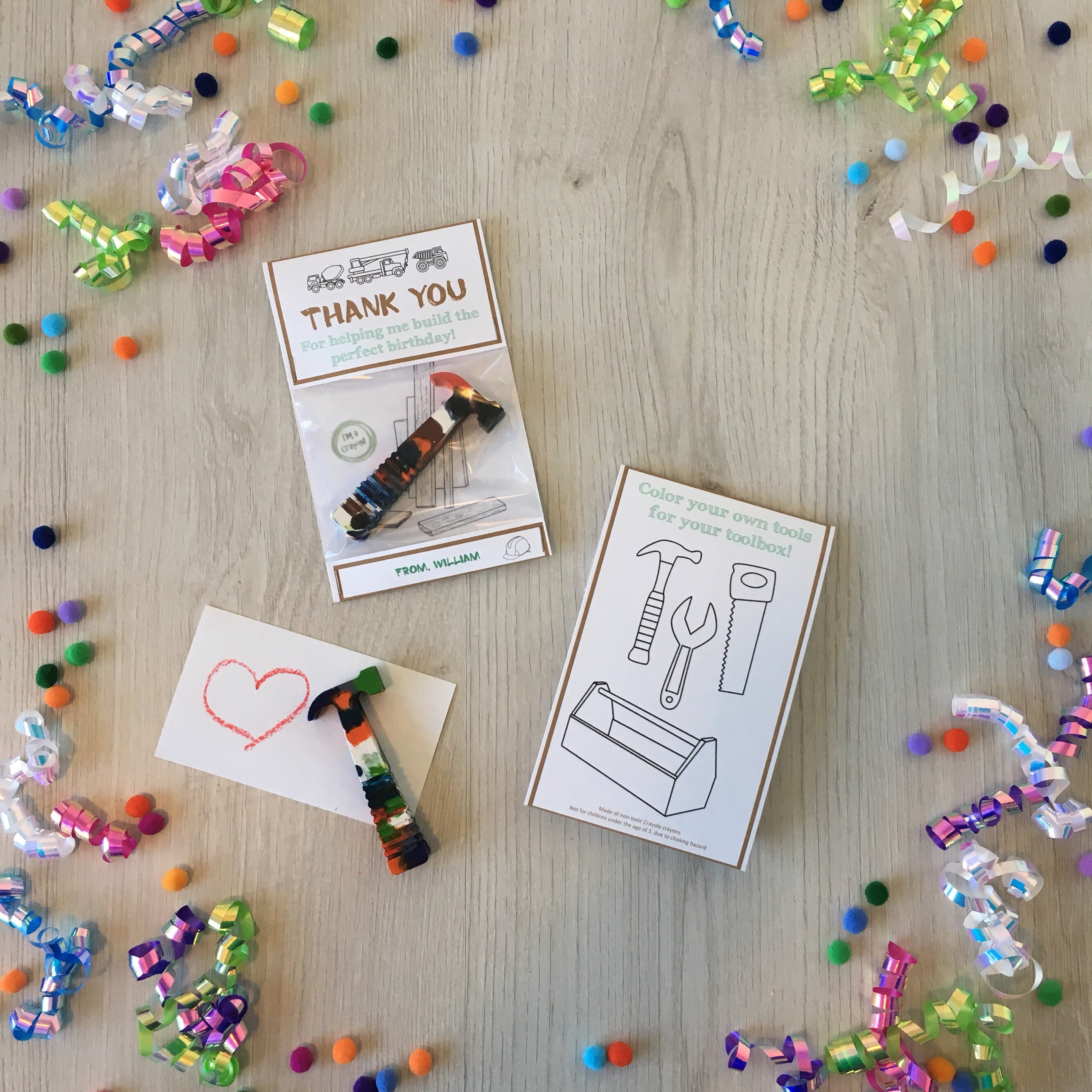 Handmade builder theme birthday party favors featuring a handmade hammer shaped multi-color crayon!