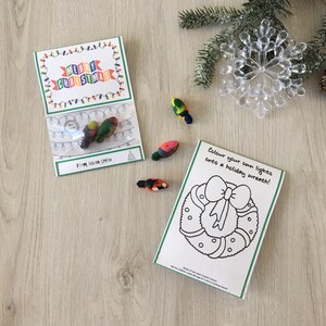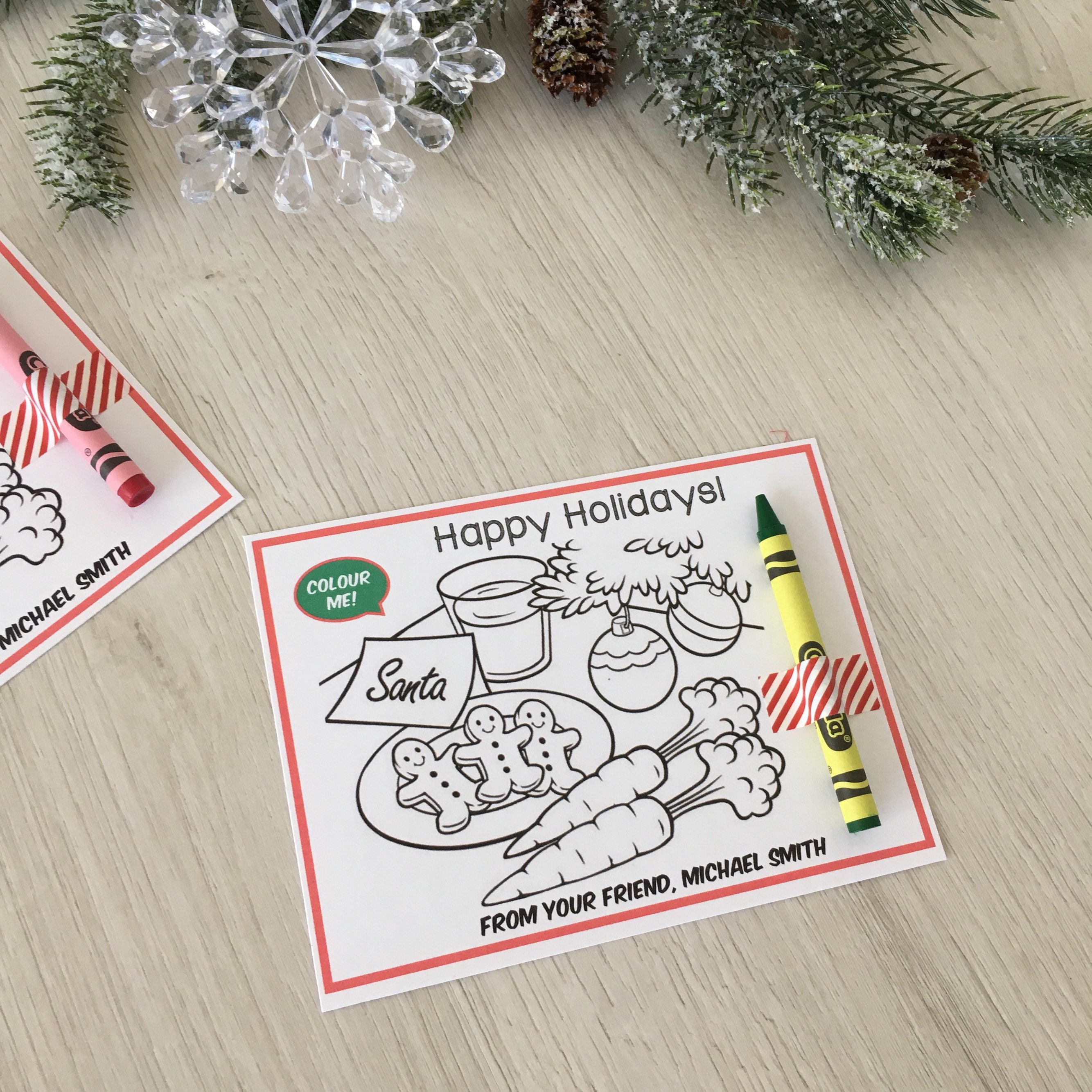 Kids colouring sheet card! Handmade Holiday party favors customized with your childs name, card is a colouring sheet children can take home and colour. Includes a crayon attached to colour with.
