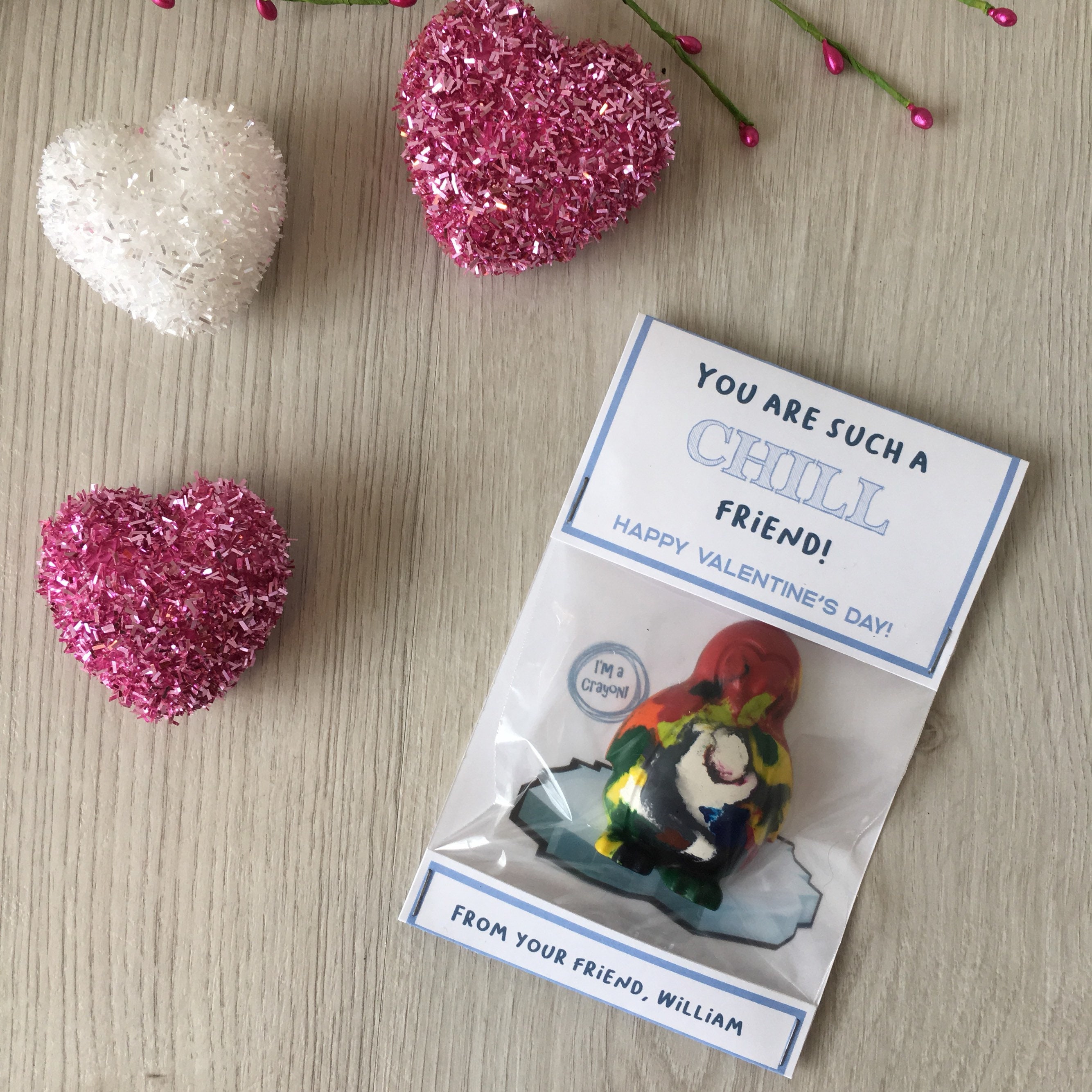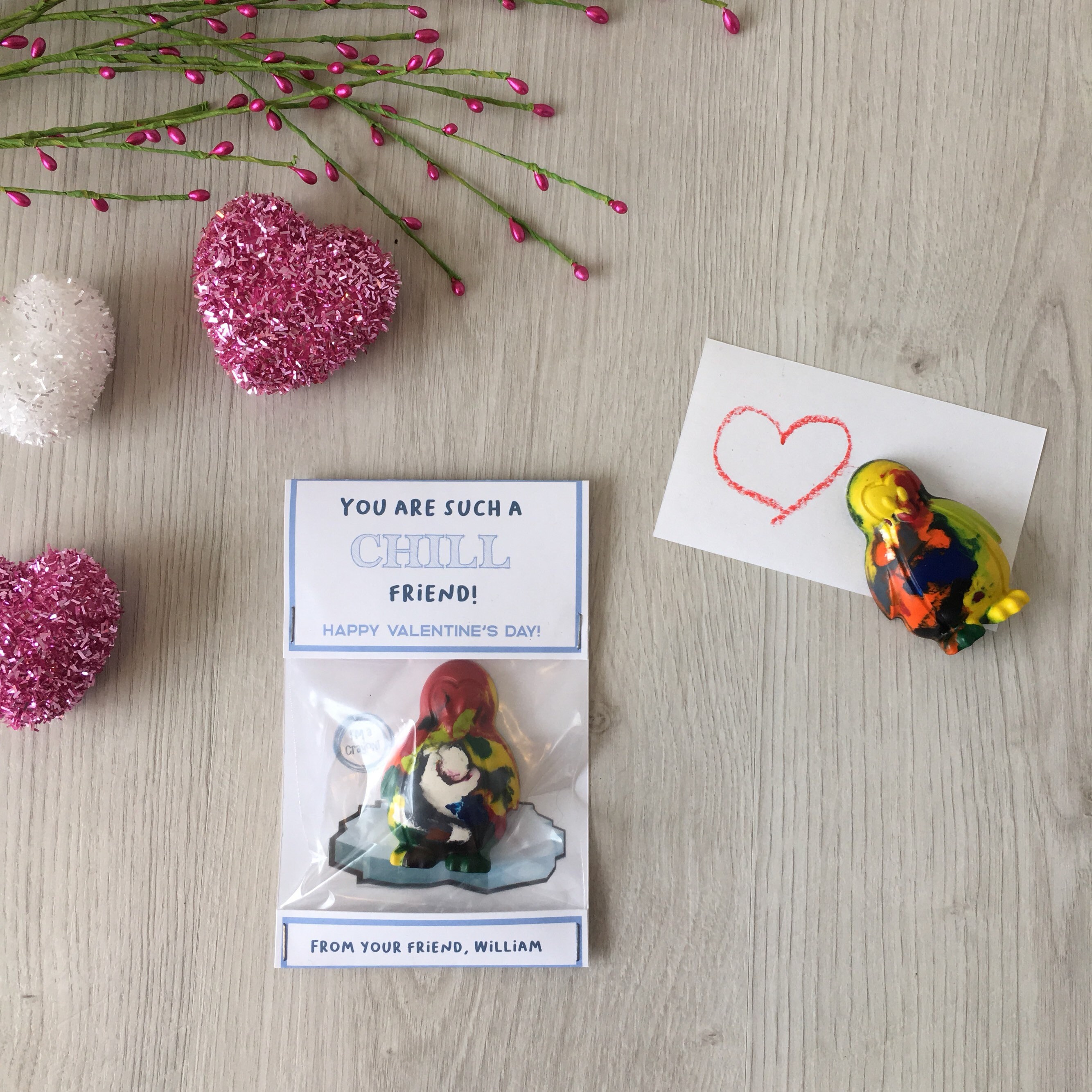 Valentine's Day Kids Cards - Valentines Day School Cards - Valentine's Day toy valentines - No Candy Valentines Day Cards - Valentines School Treats -β valentines classroom treats β kids classroom cards β kids thank you cards β kids school cards - craft Party favors - Valentines - unplugged activity kits β non candy valentines options - penguin shaped crayons - handmade crayons - multicolor crayon - color your own - crayon valentines