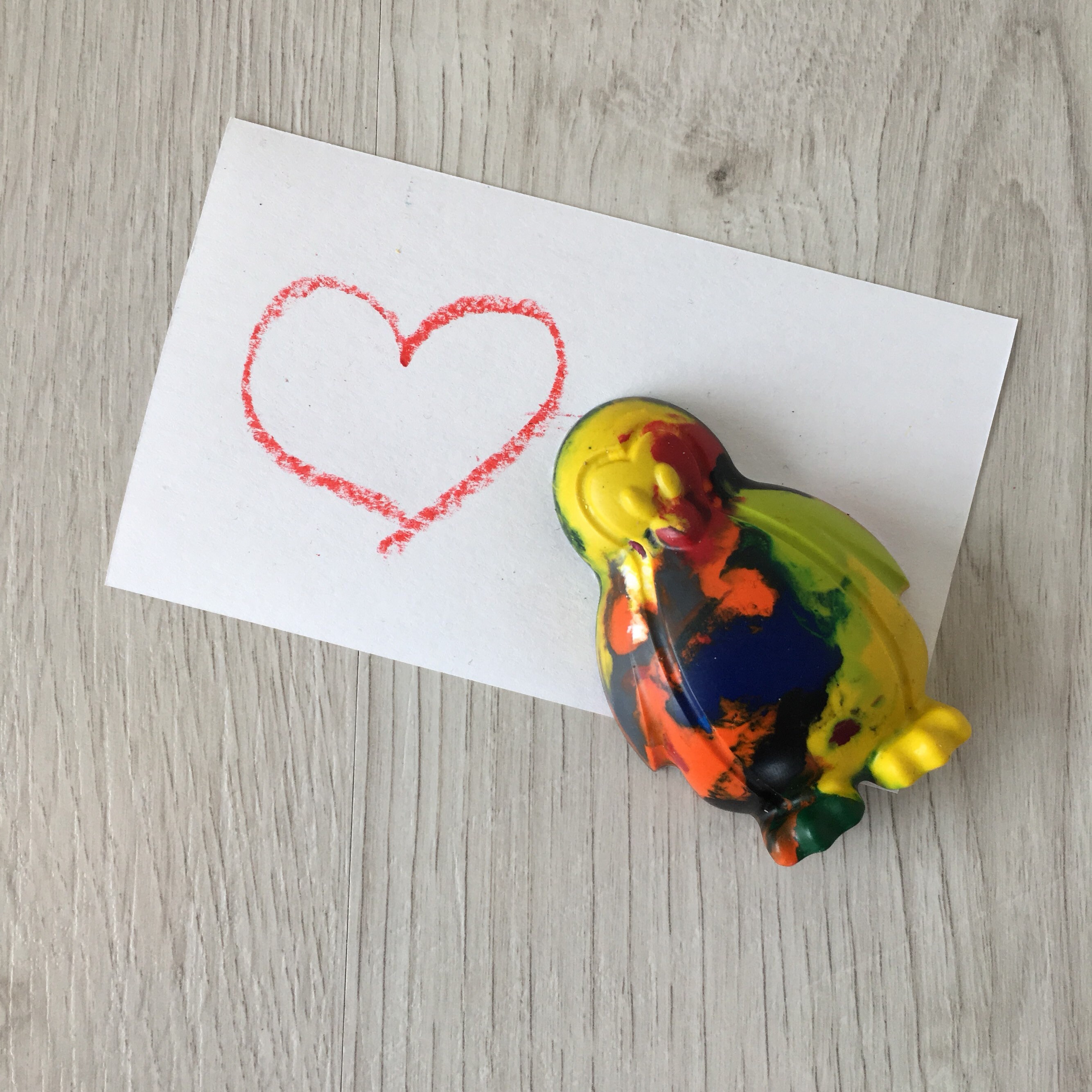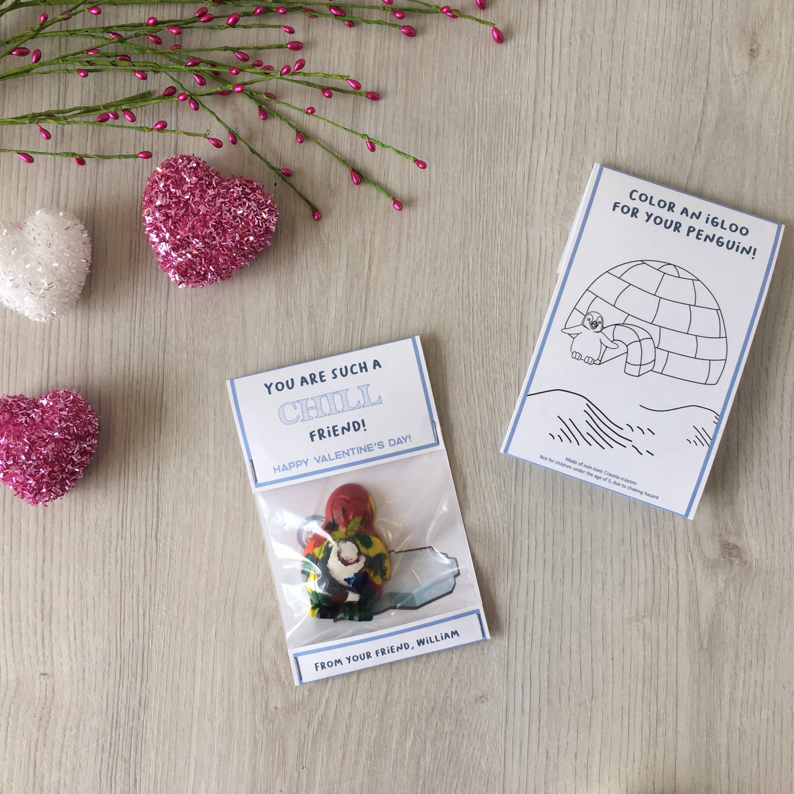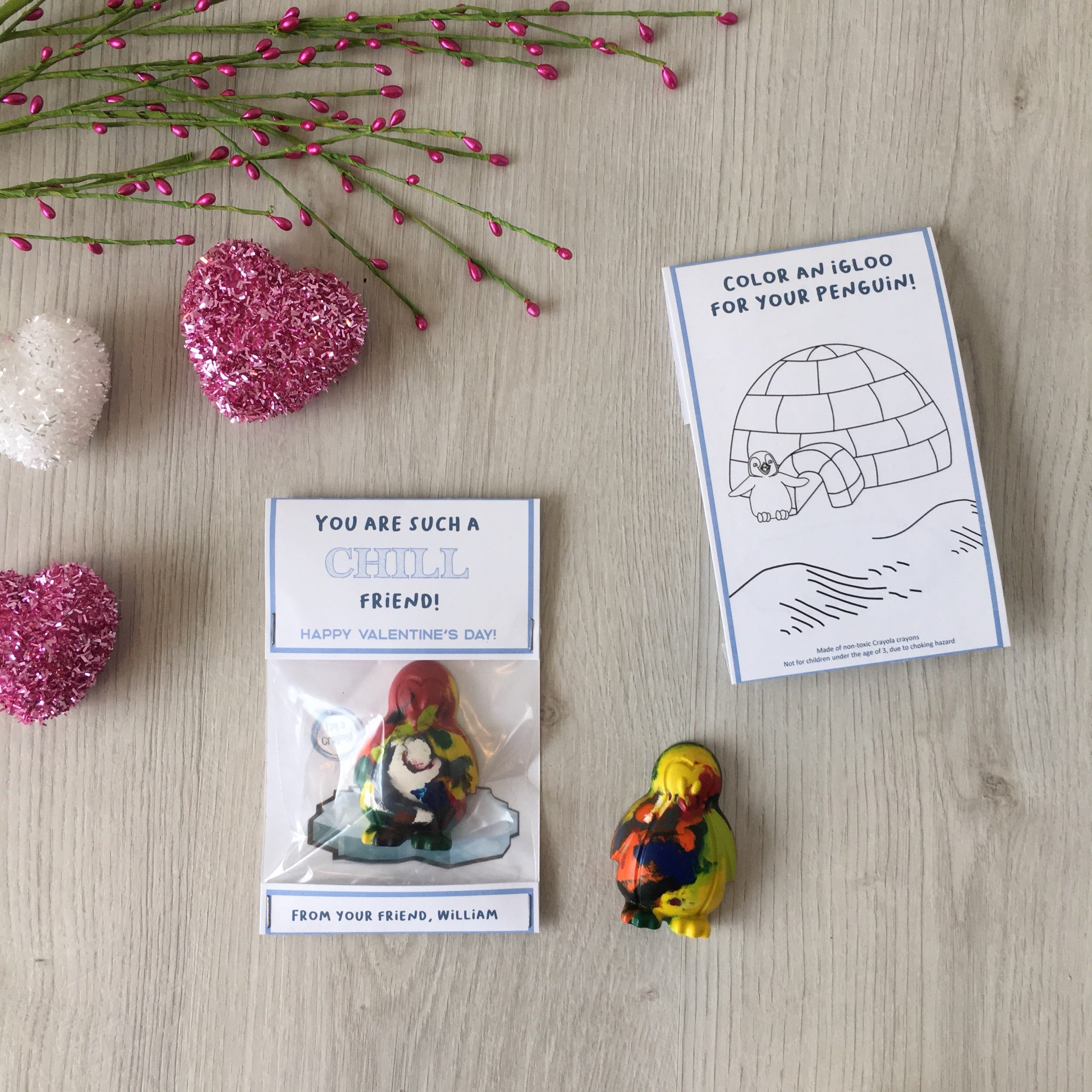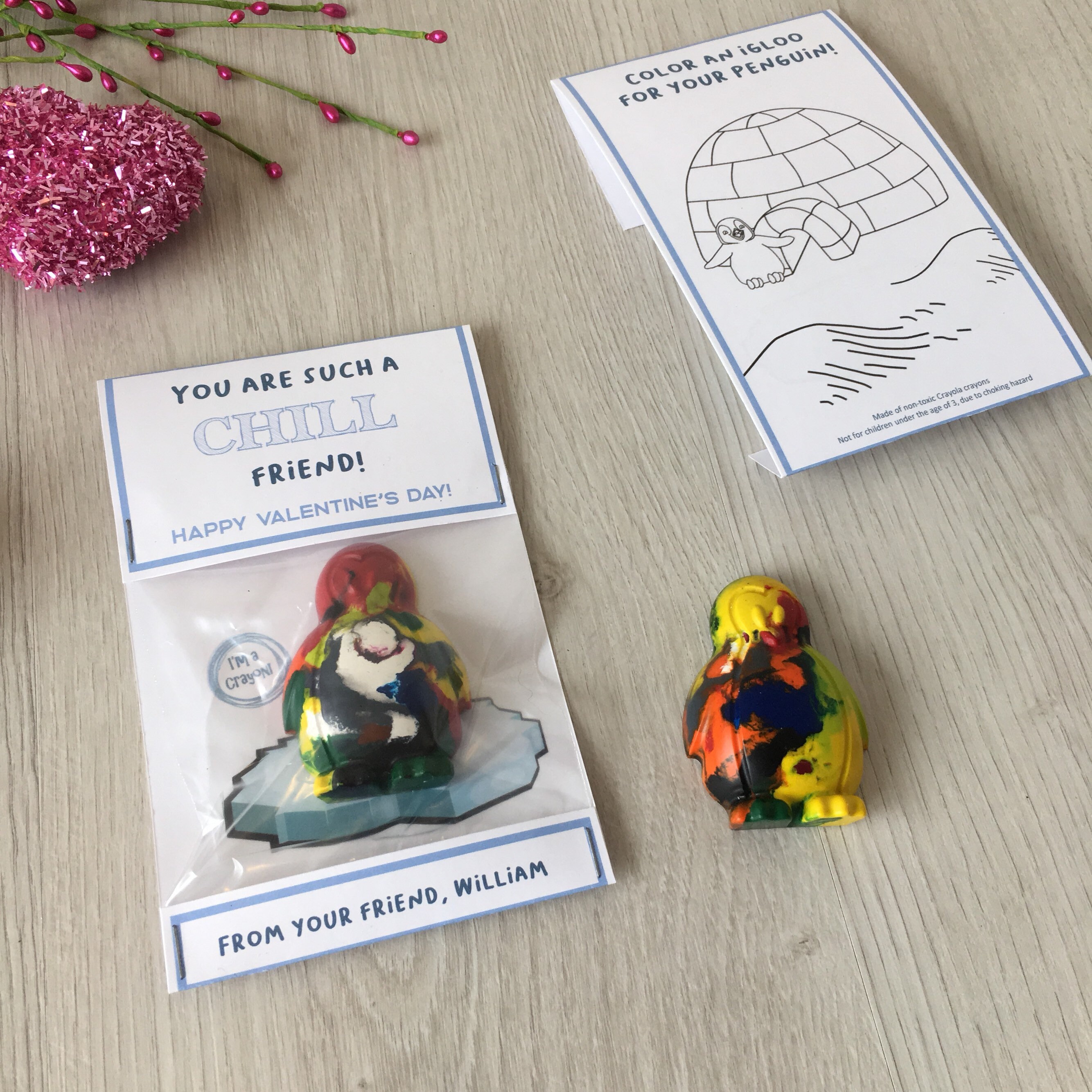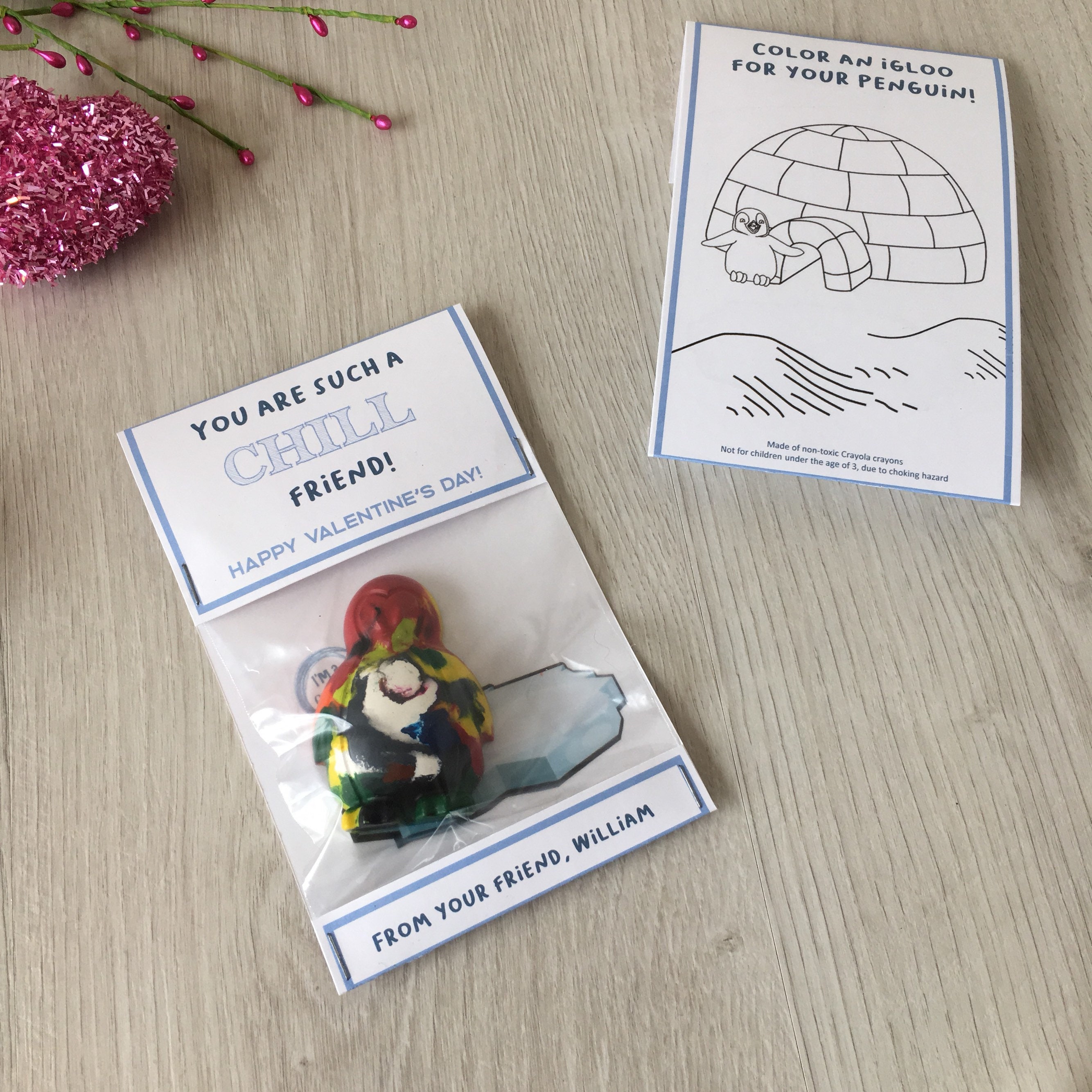 Featuring a handmade penguin shaped crayons that children can colour with