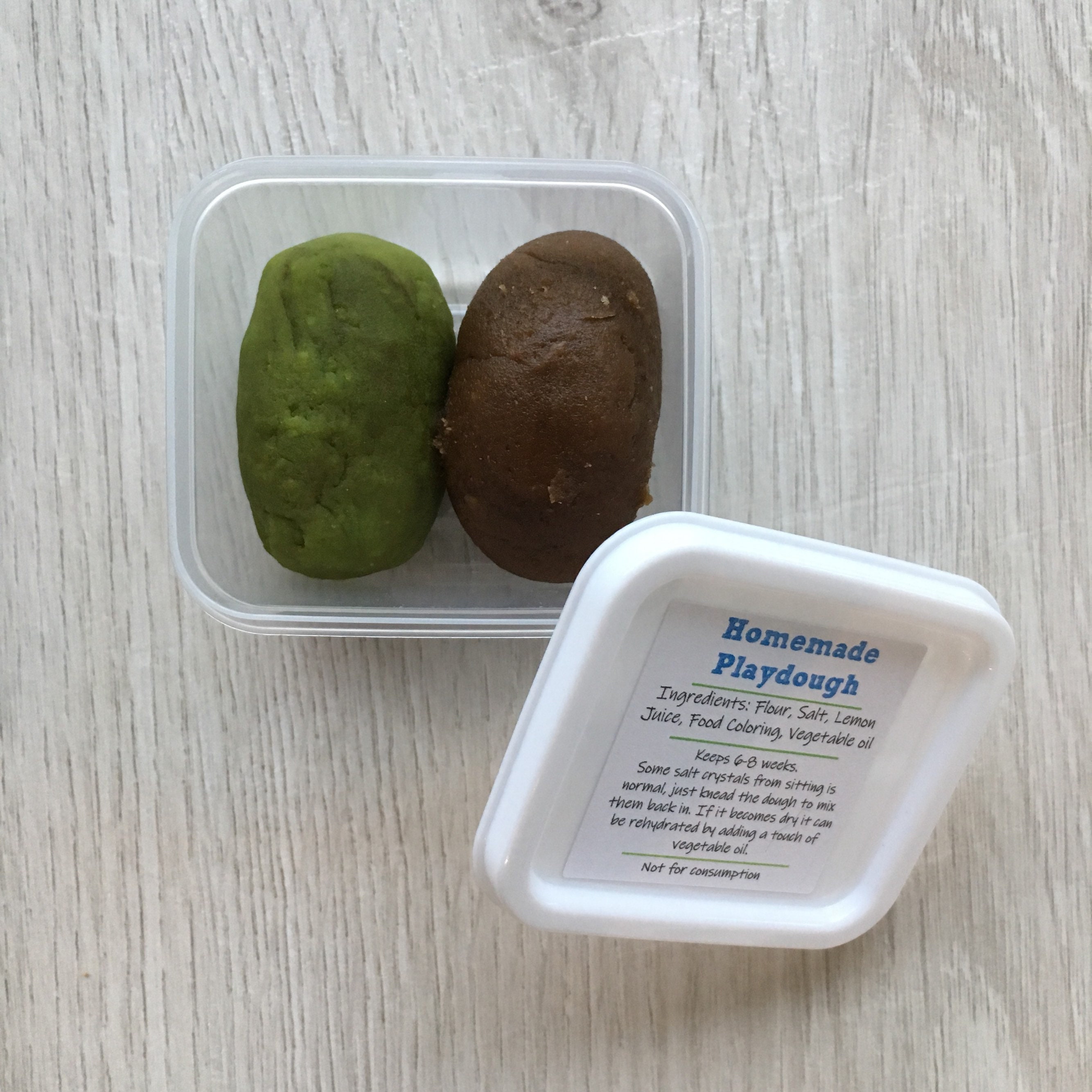 Playdough includes flour, salt, lemon juice, vegetable oil and food colouring.