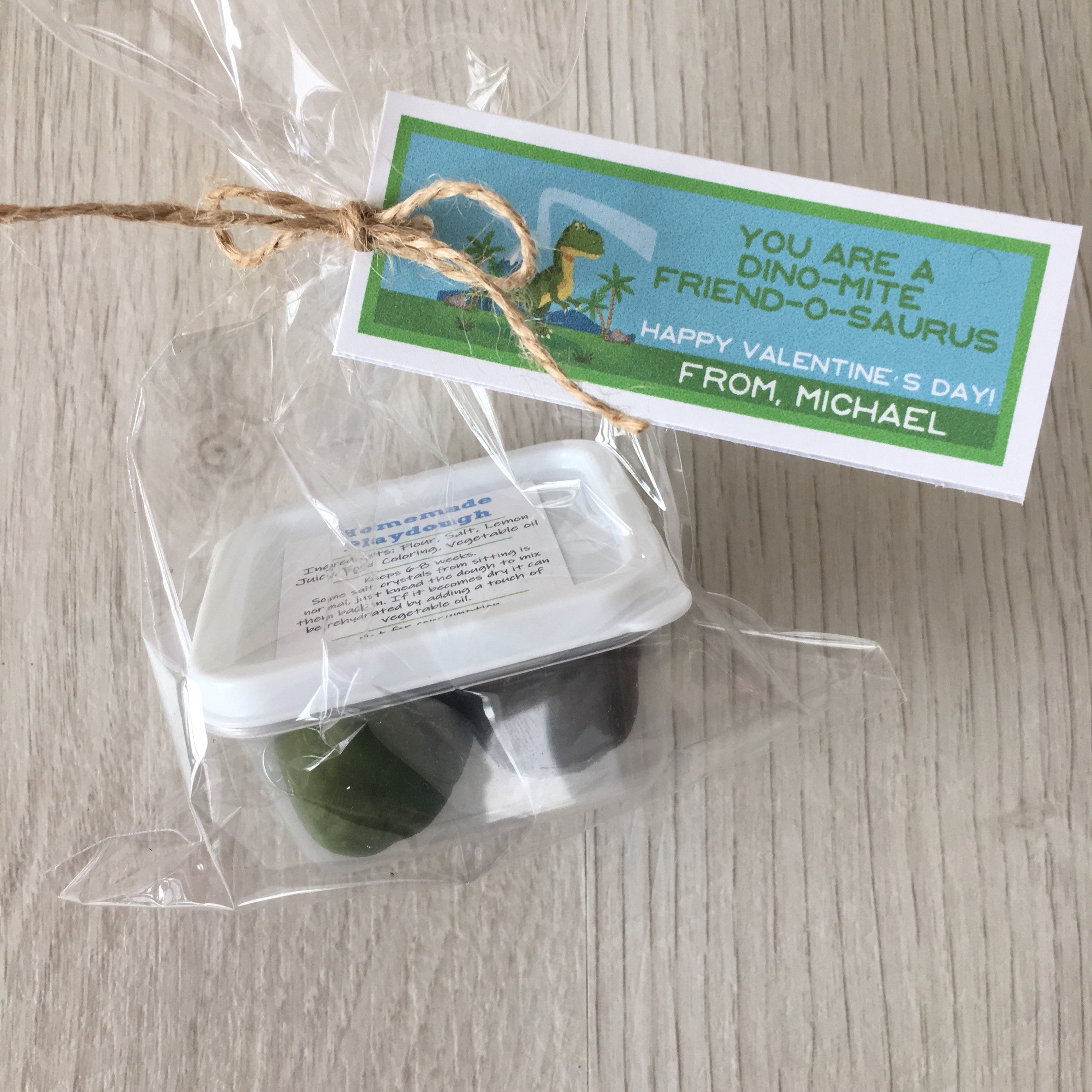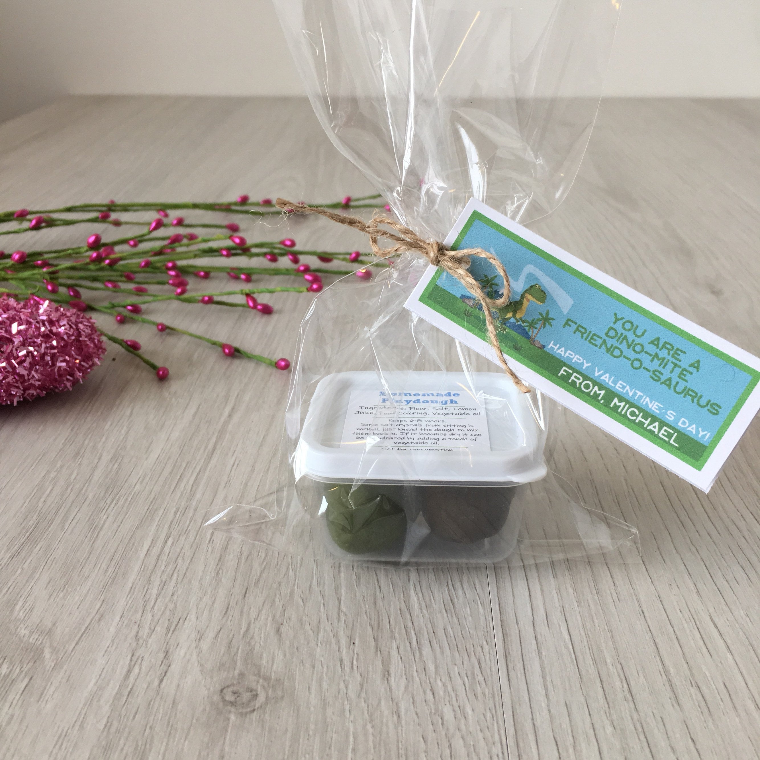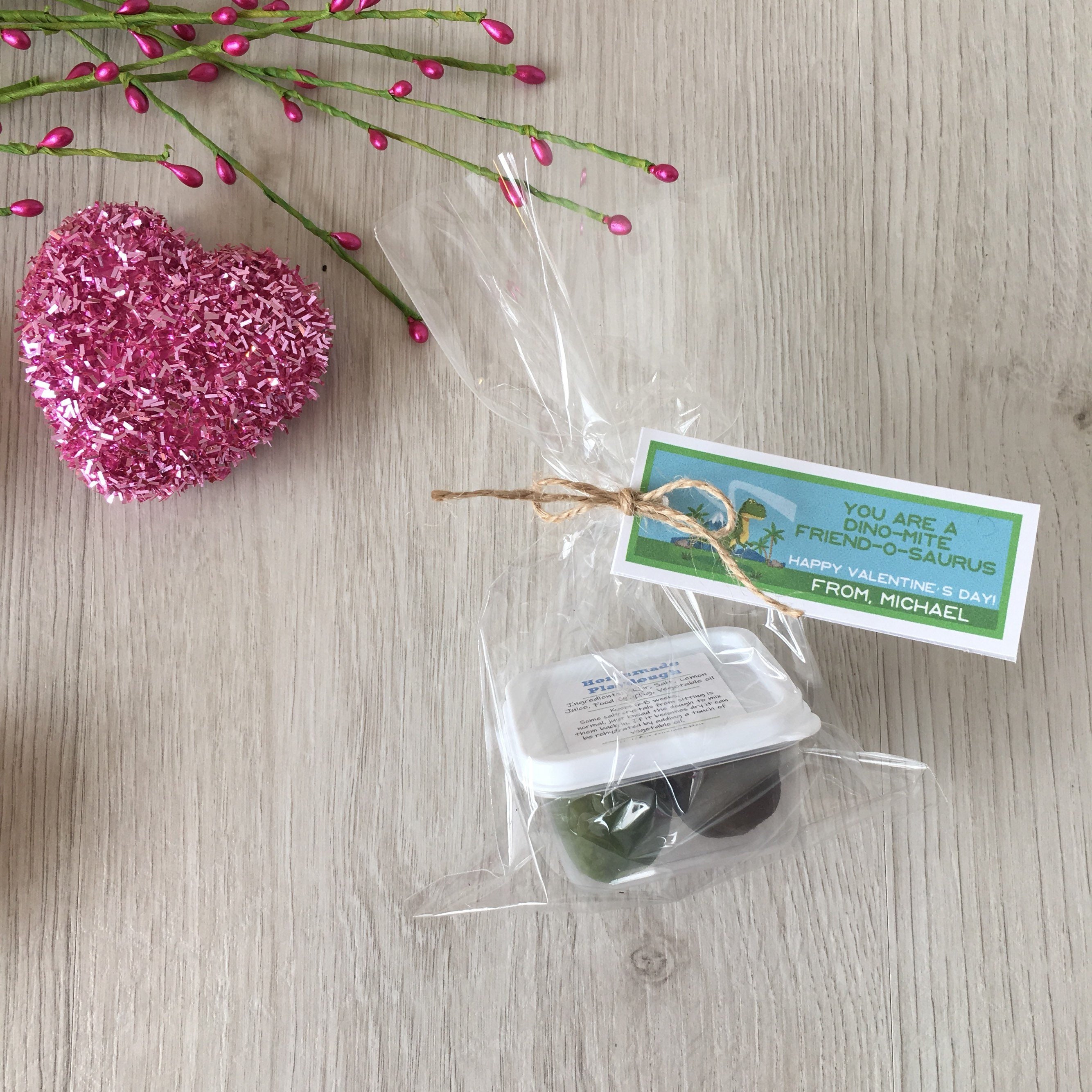 Handmade Valentine's dinosaur theme play dough activity set, includes a container of handmade play dough in (2) colors and a customized tag with your child's name!