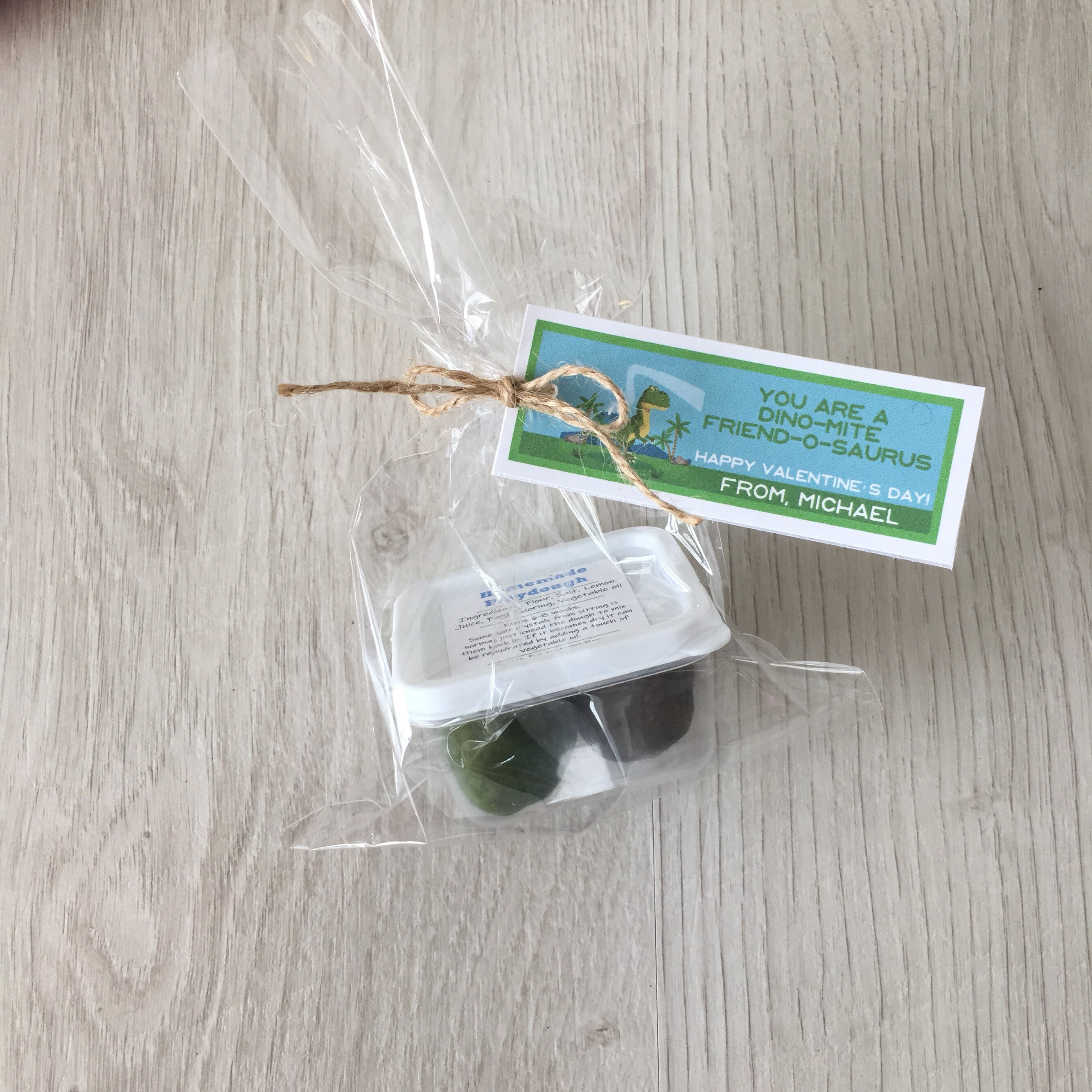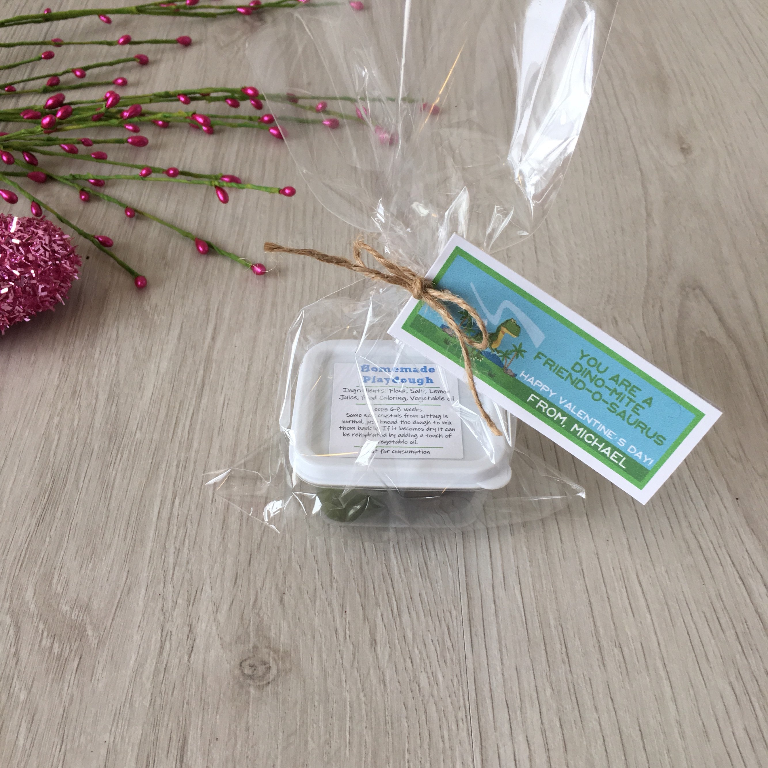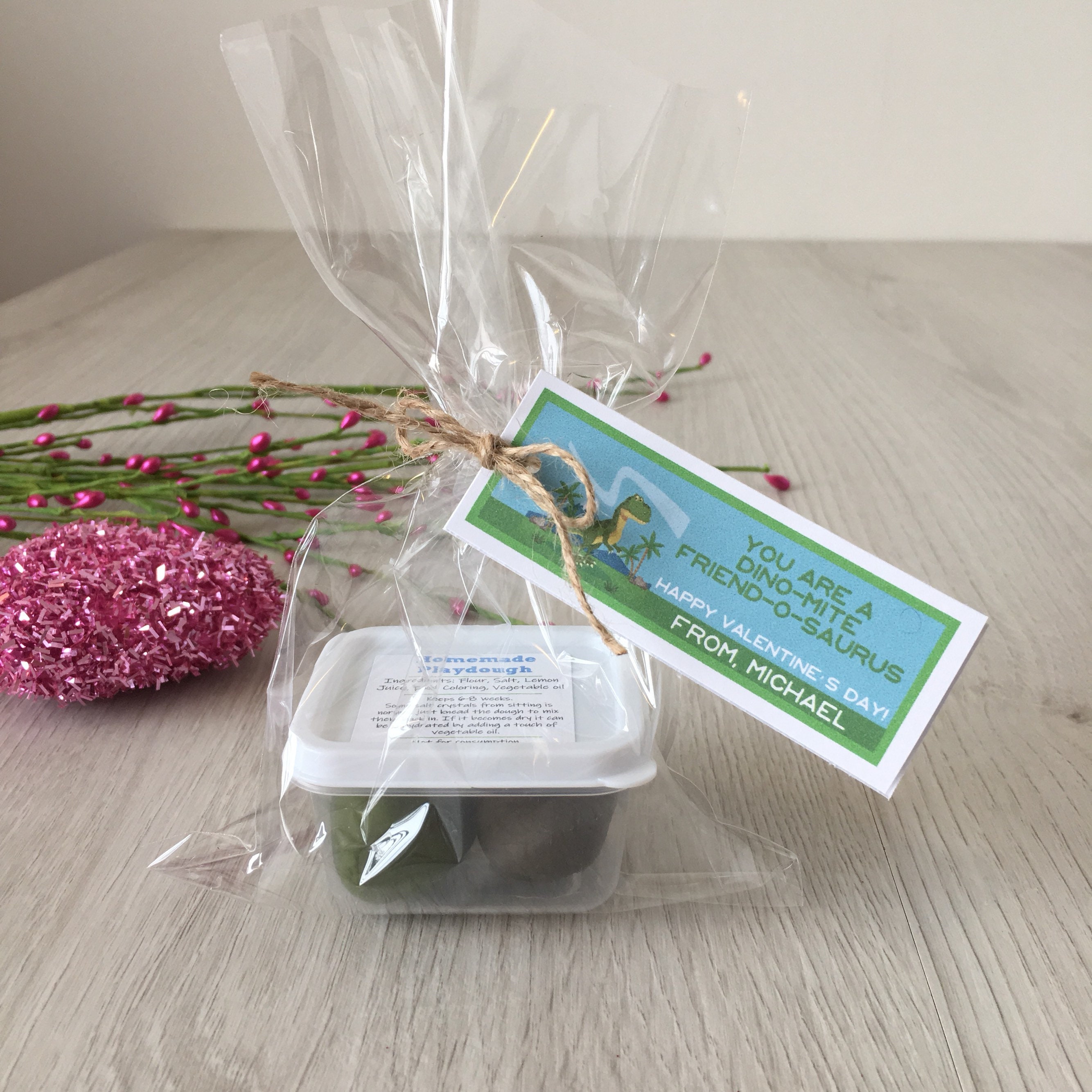 Handmade Valentine's dinosaur theme play dough activity set, includes a container of handmade play dough in (2) colors and a customized tag with your child's name!