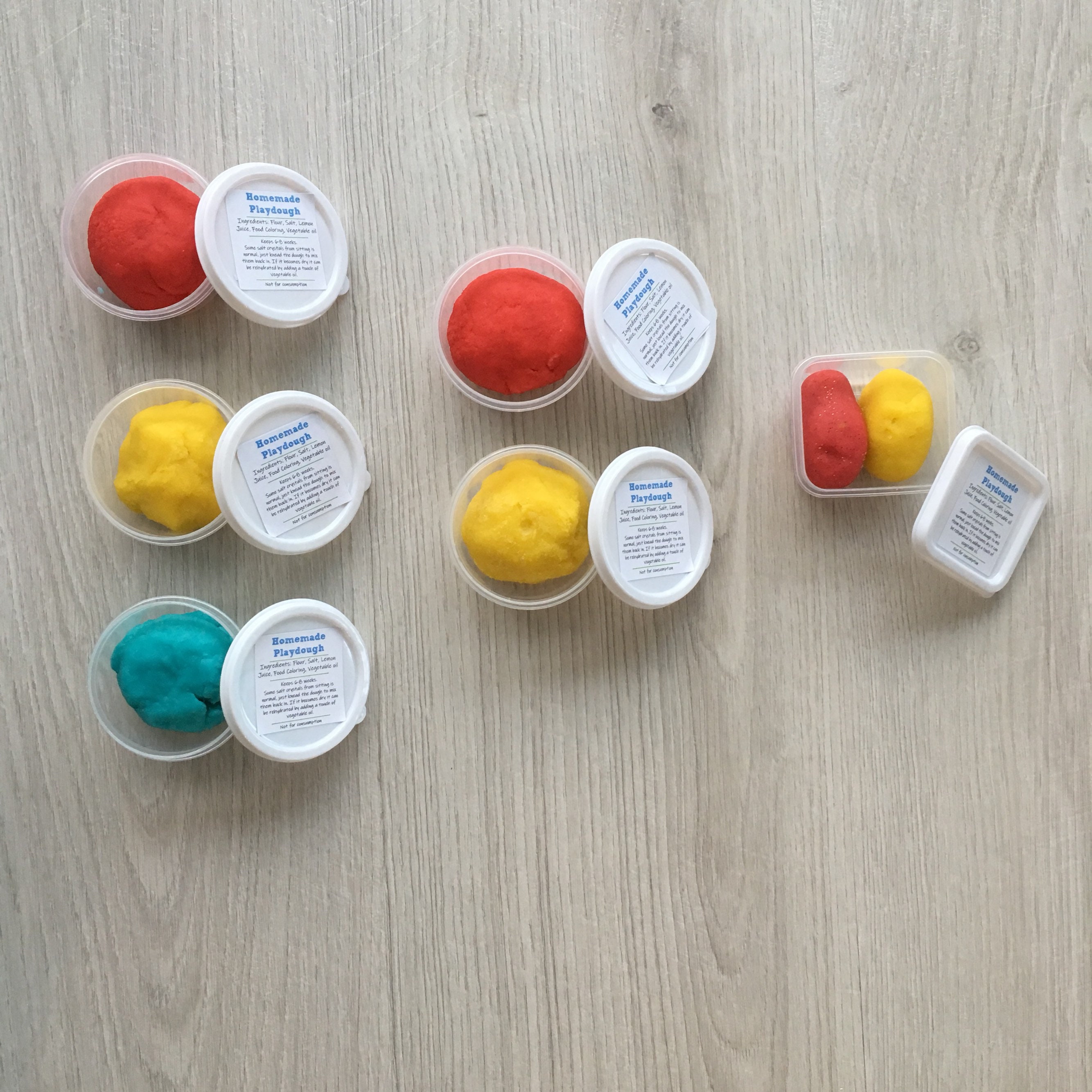 3 options available. The first incudes (3) containers of homemade play dough (blue, yellow and red). The second includes (2) containers of homemade play dough (yellow and red). The third includes (1) small container with both yellow and red.