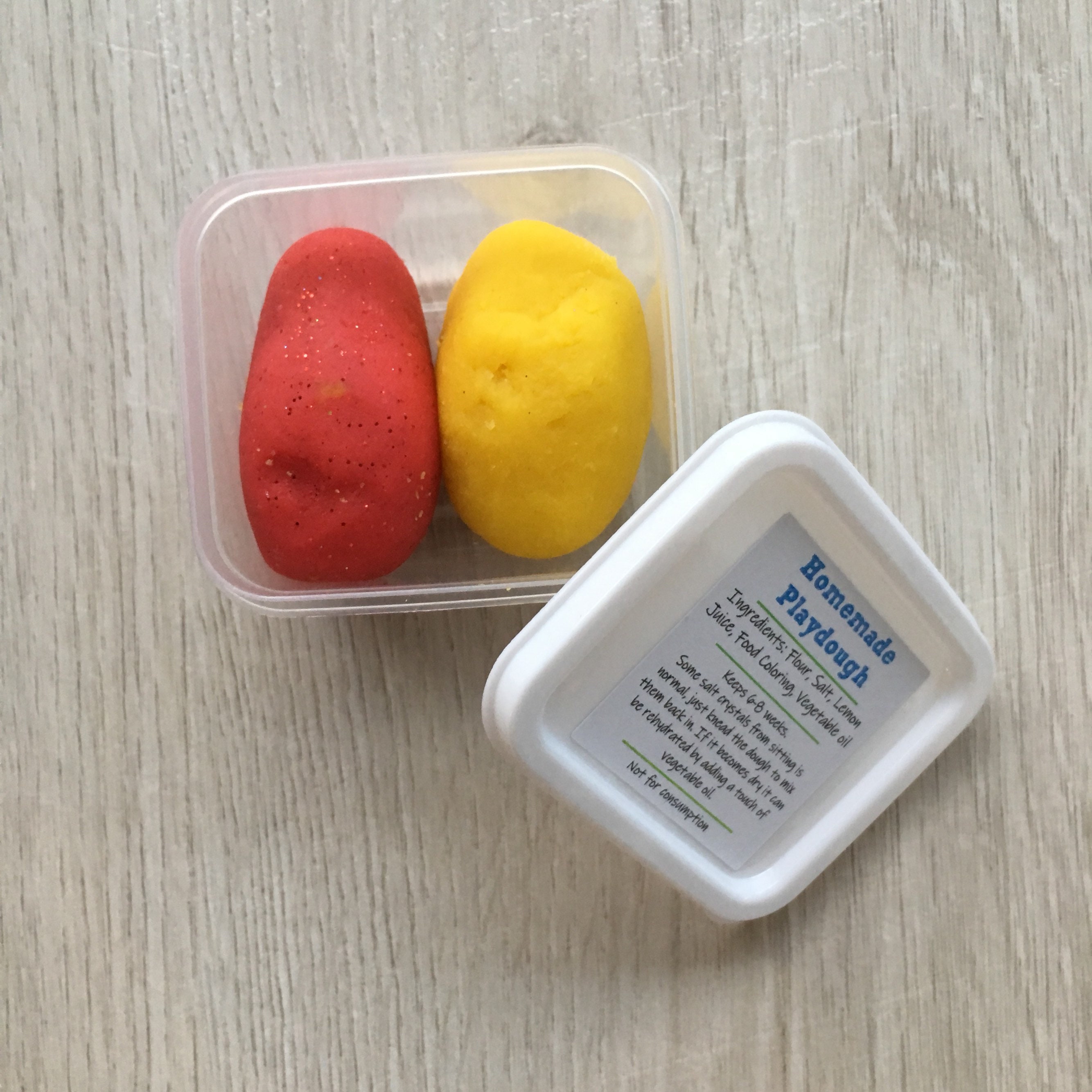 Standard playdough includes flour, salt, lemon juice, vegetable oil and food colouring.