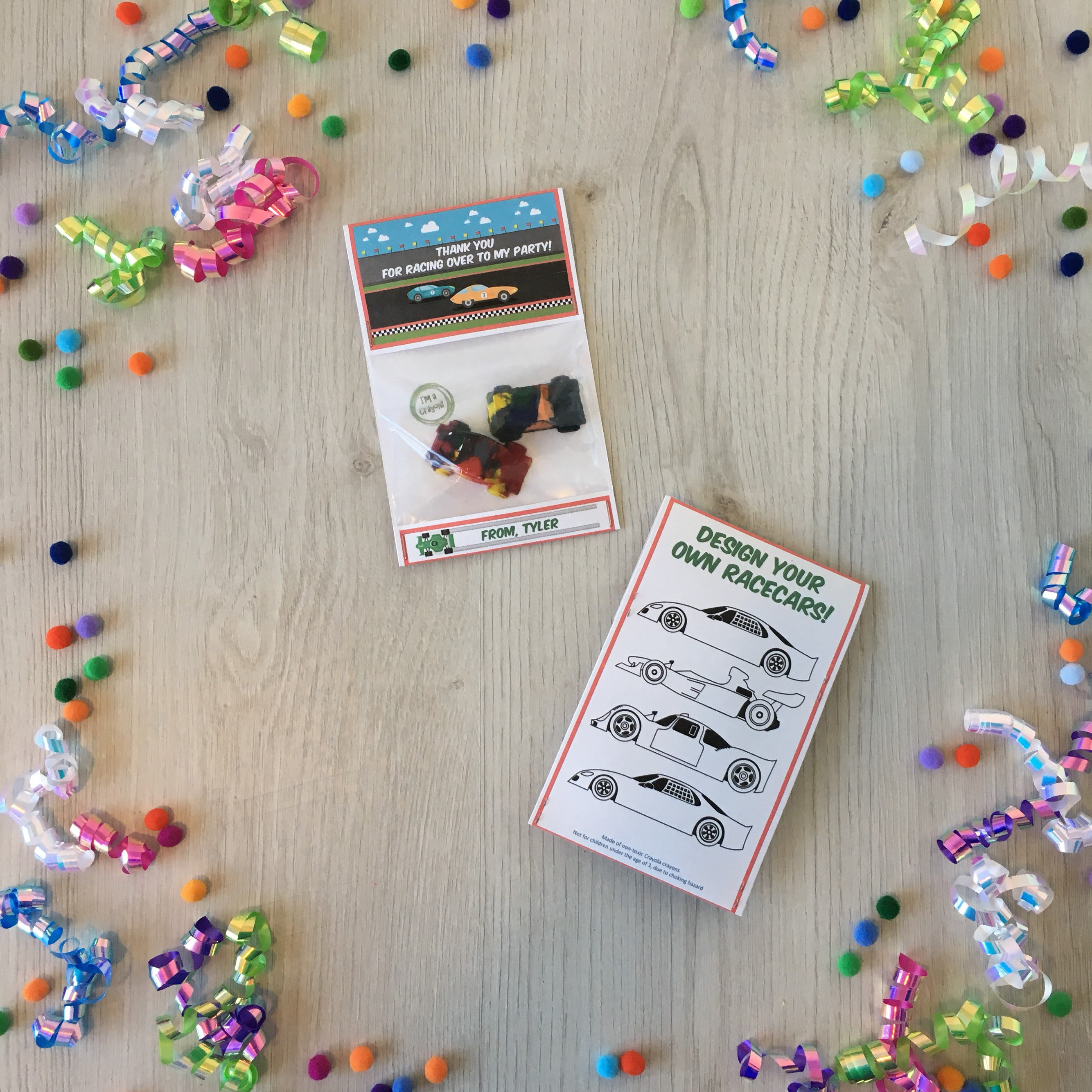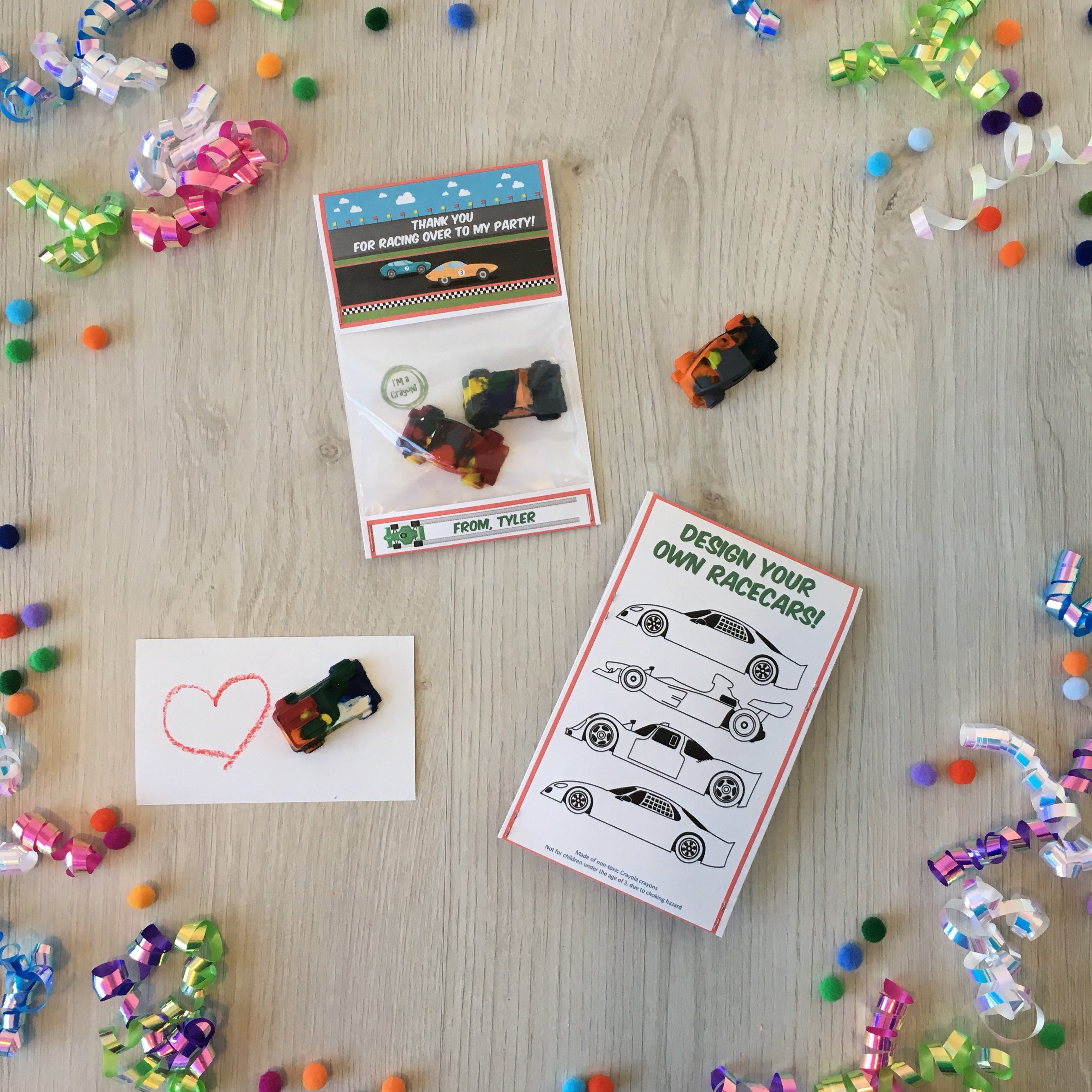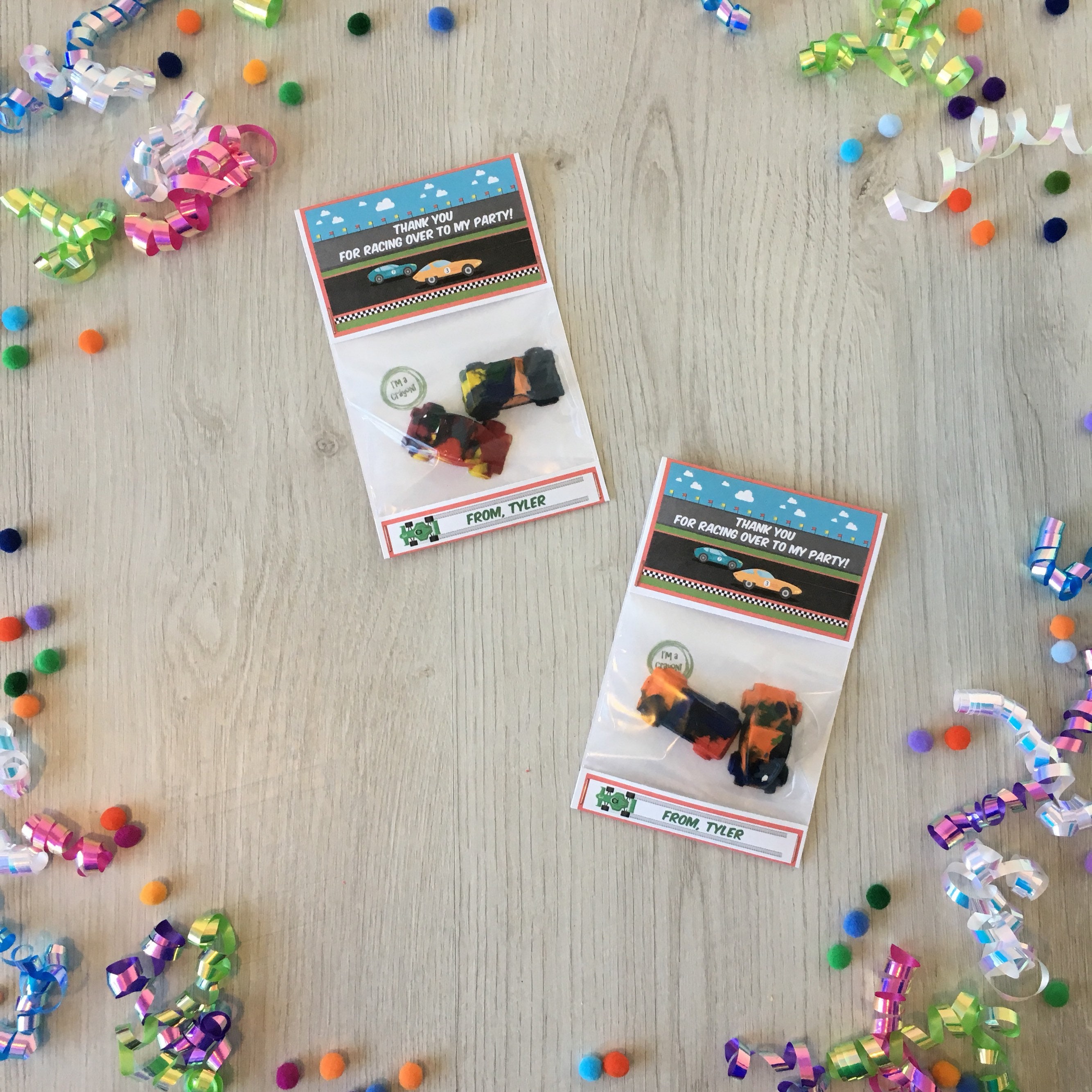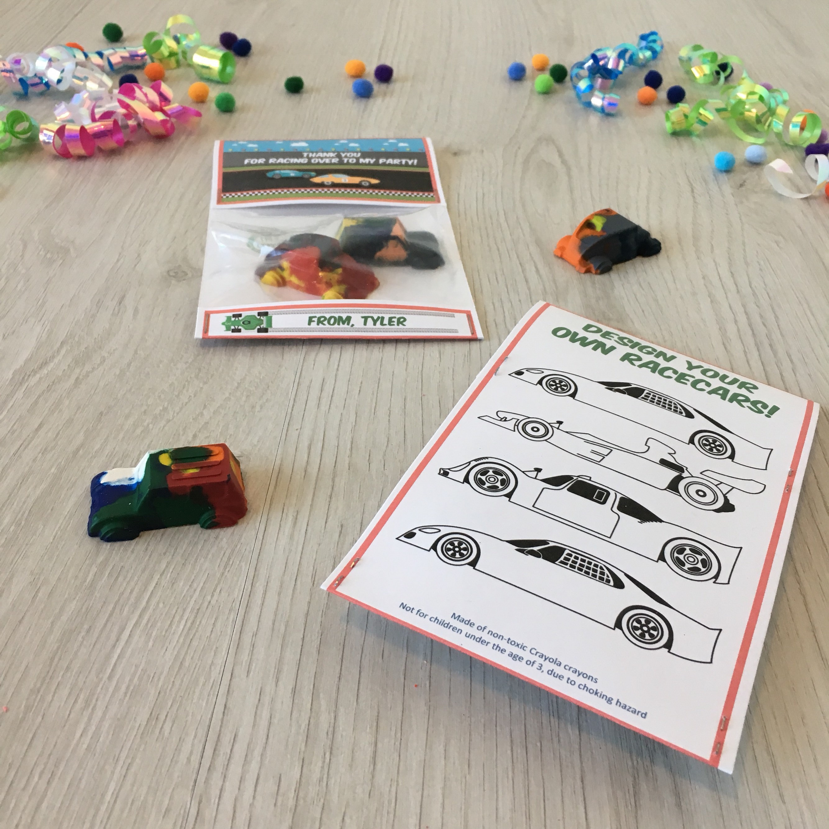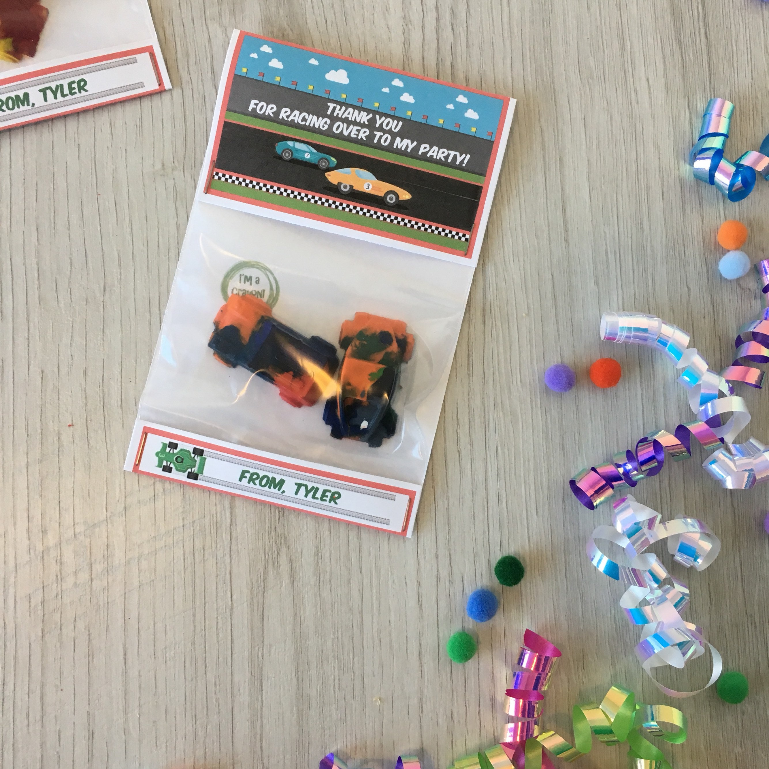 Handmade race car theme birthday party favors featuring a handmade car shaped multi-color crayon!
