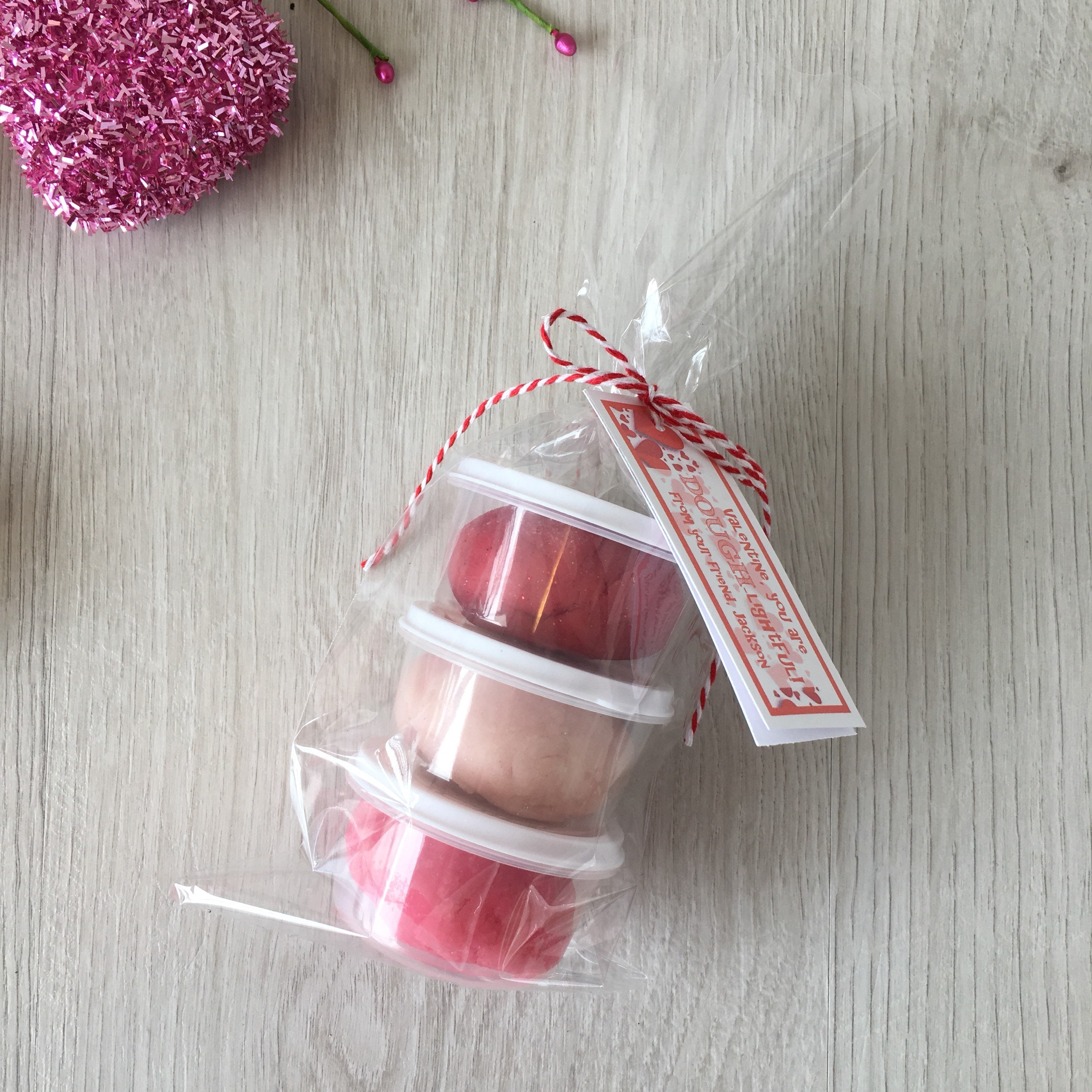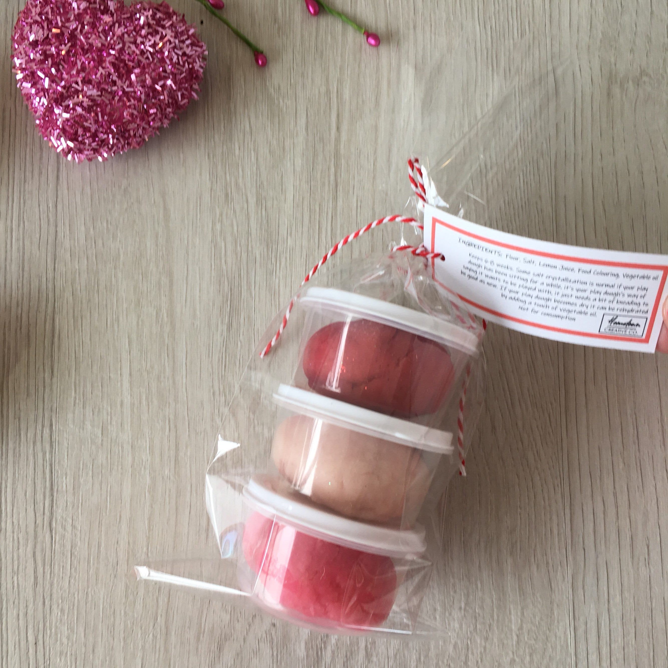 Includes (3) containers of handmade non-toxic play dough in (3) colors; pink, red and white with sparkles in the dough.