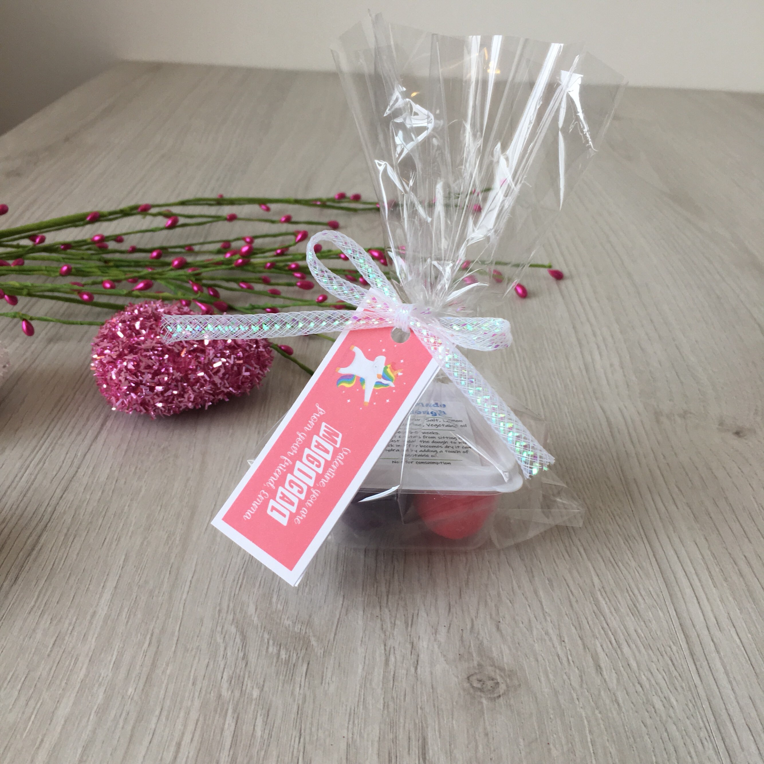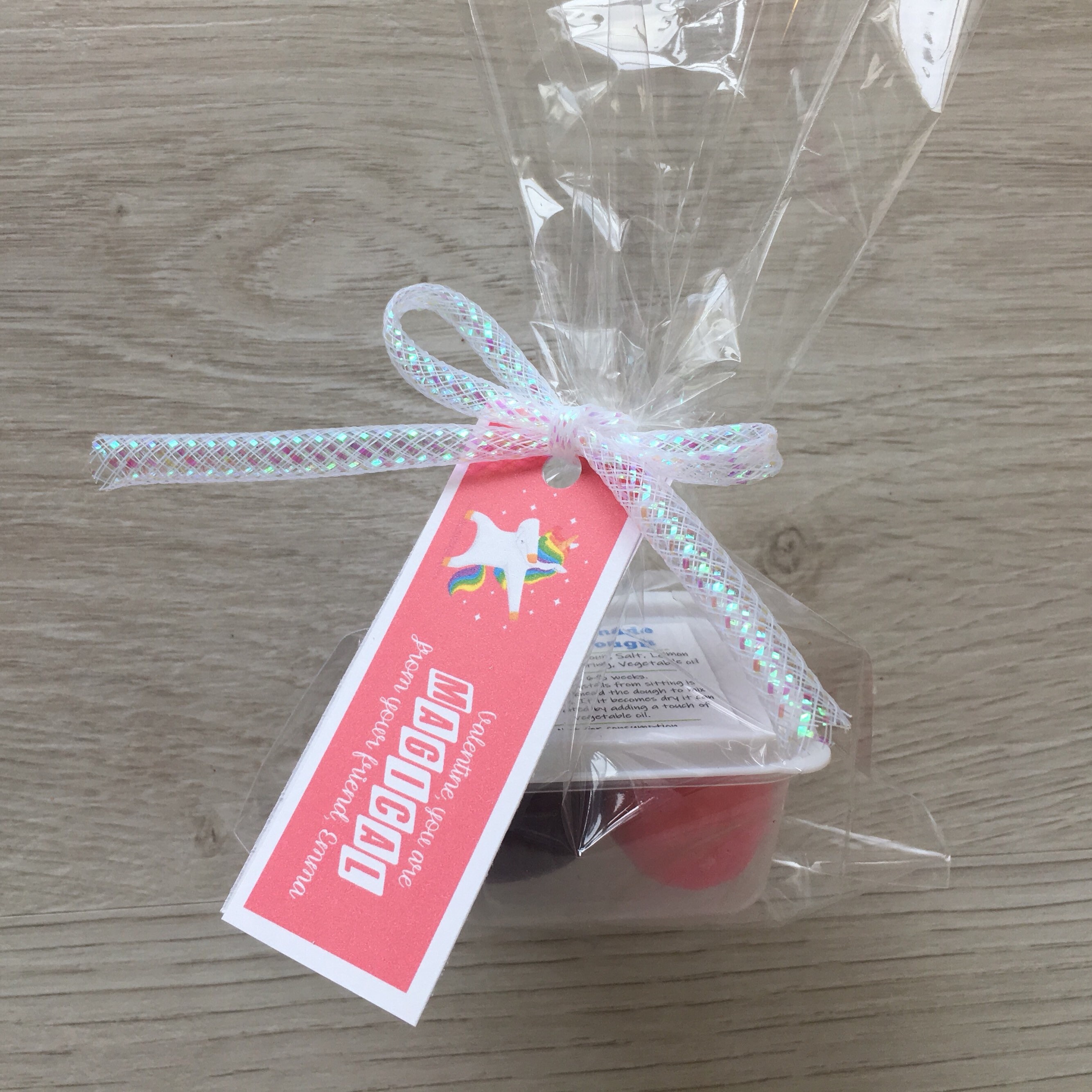 Handmade Valentine's Unicorn theme play dough activity set, includes a container of handmade play dough in (2) colors and a customized tag with your child's name!