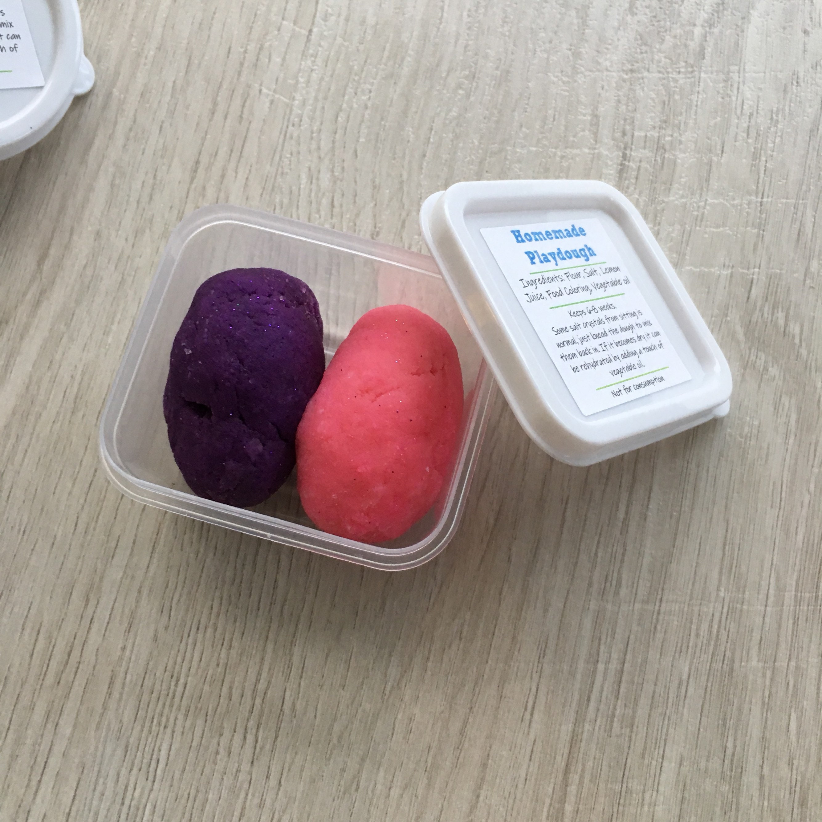 Each container of handmade play dough includes a portion in pink and a portion in purple both with sparkles mixed into the dough