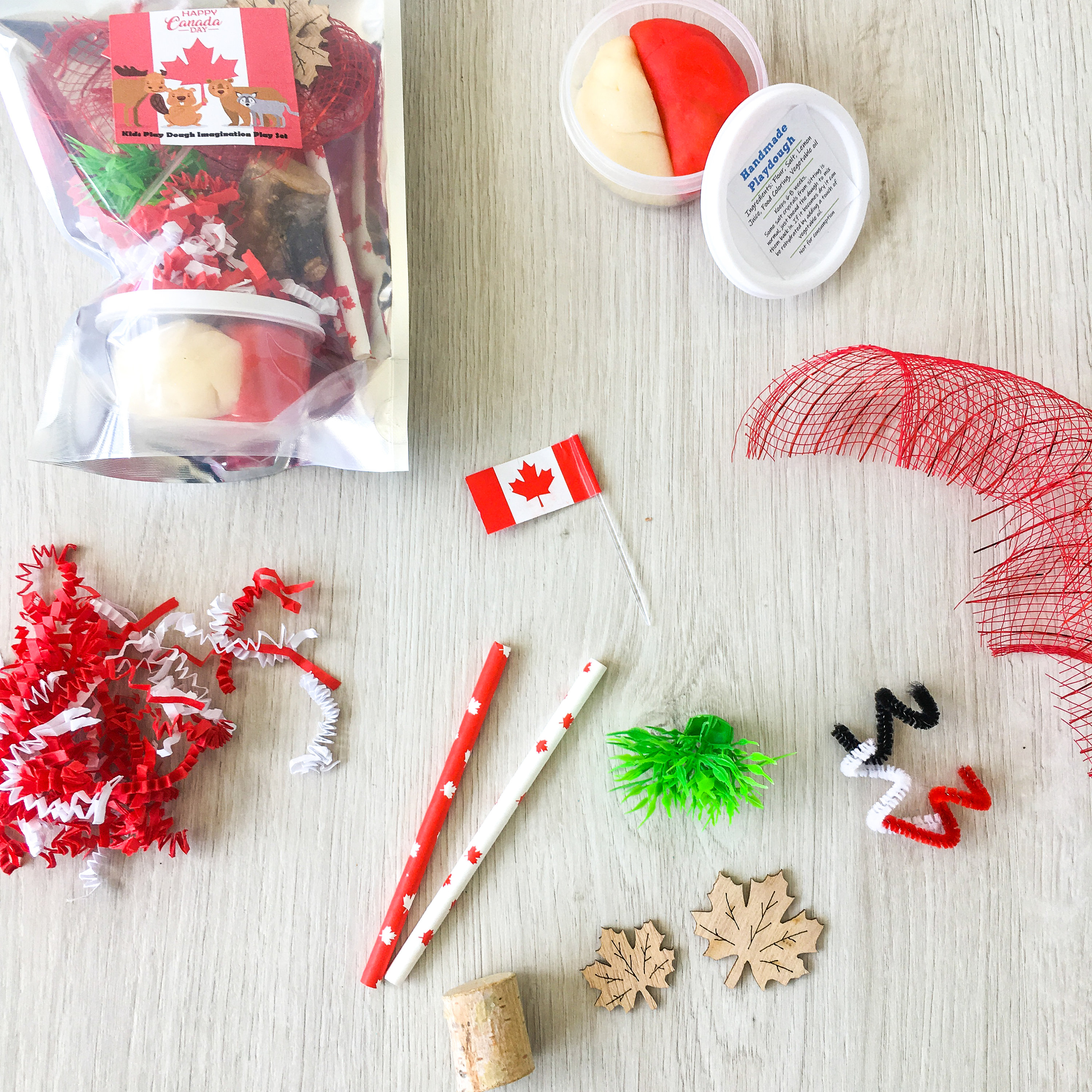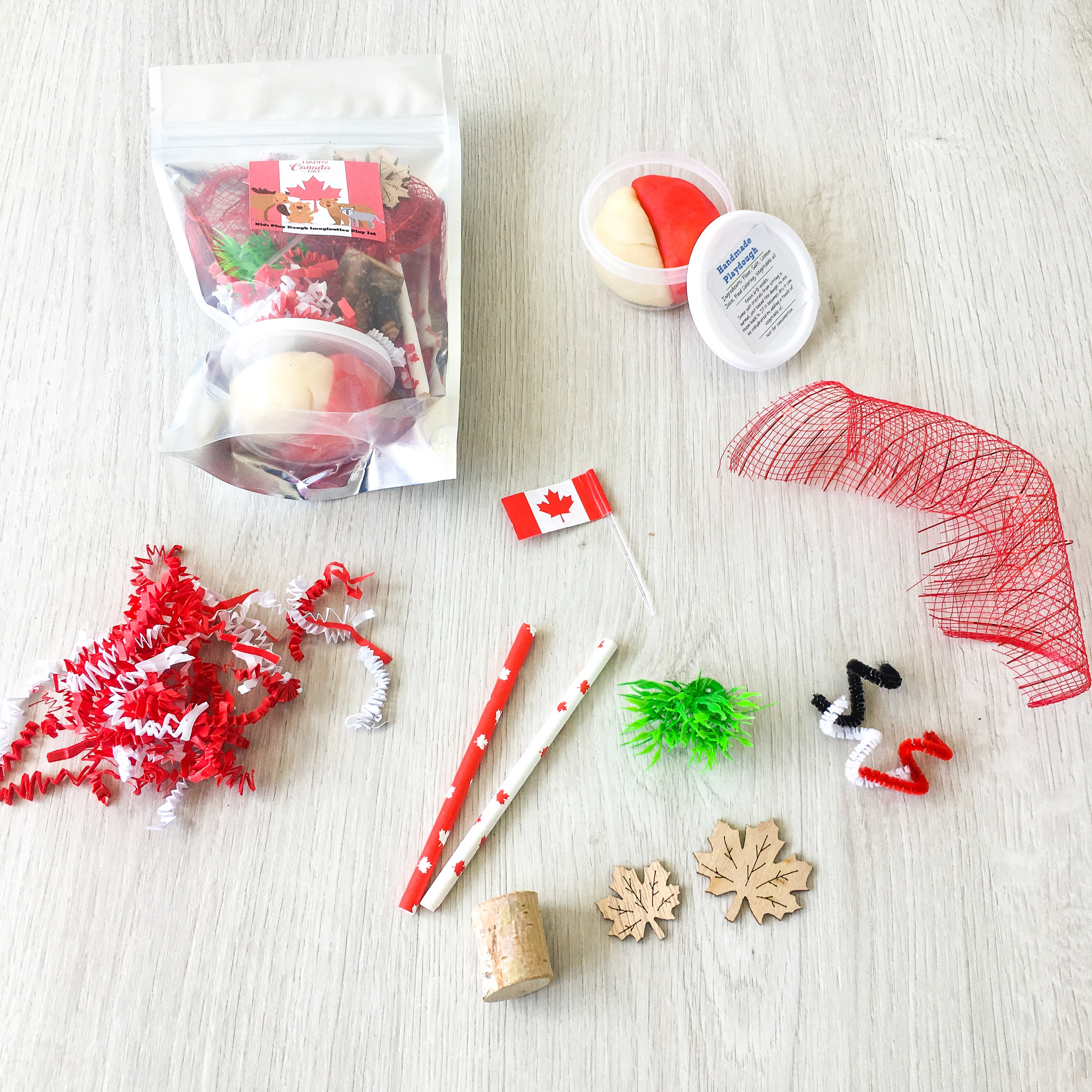 Handmade Canada Day theme play dough activity set, includes a container of handmade play dough as well as sensory play items to use with the play dough.