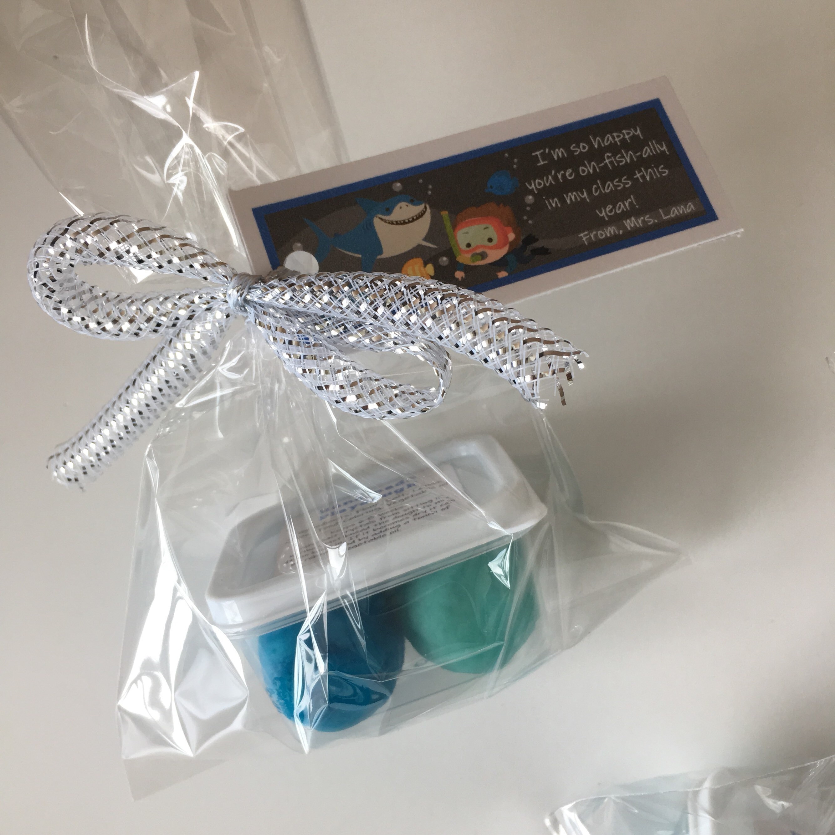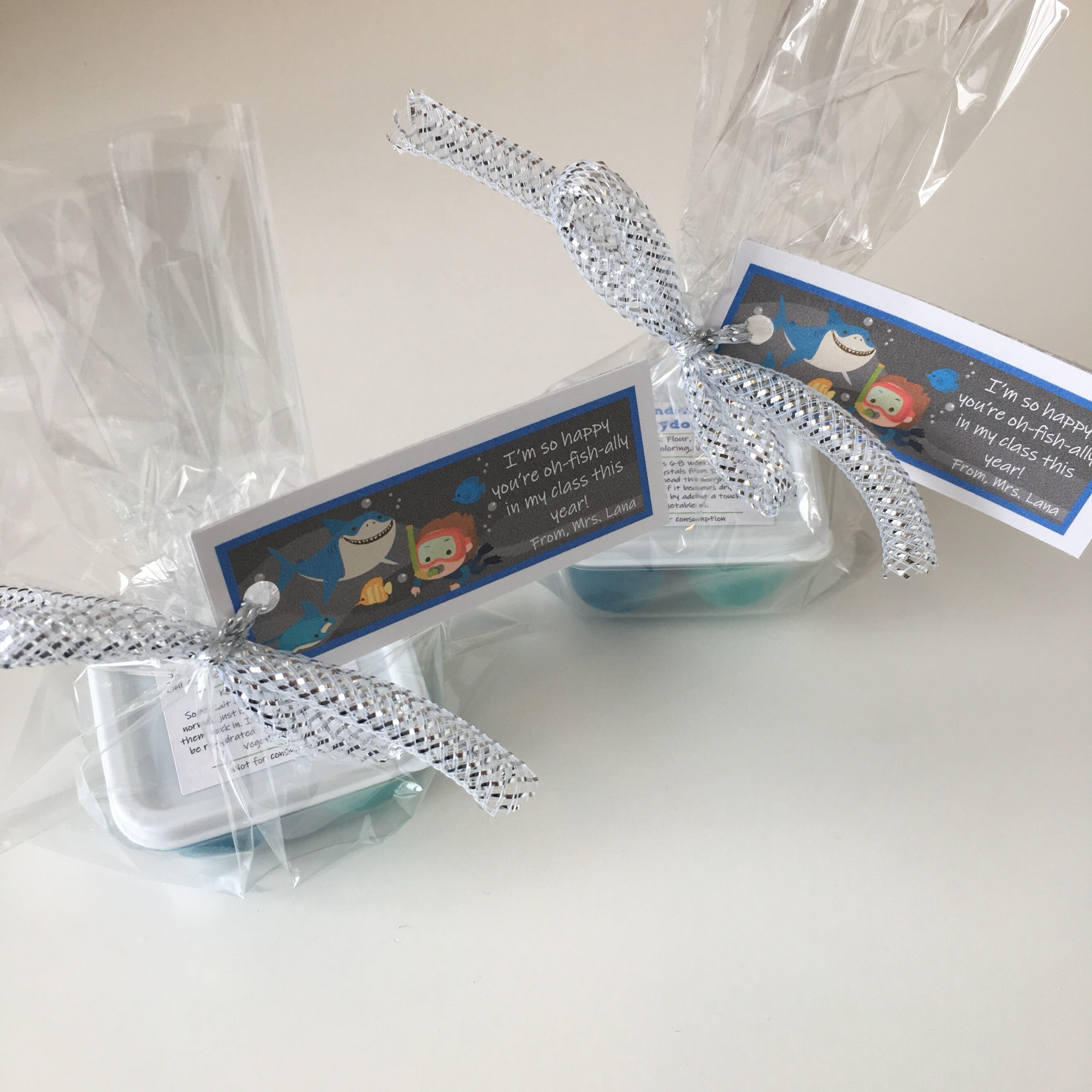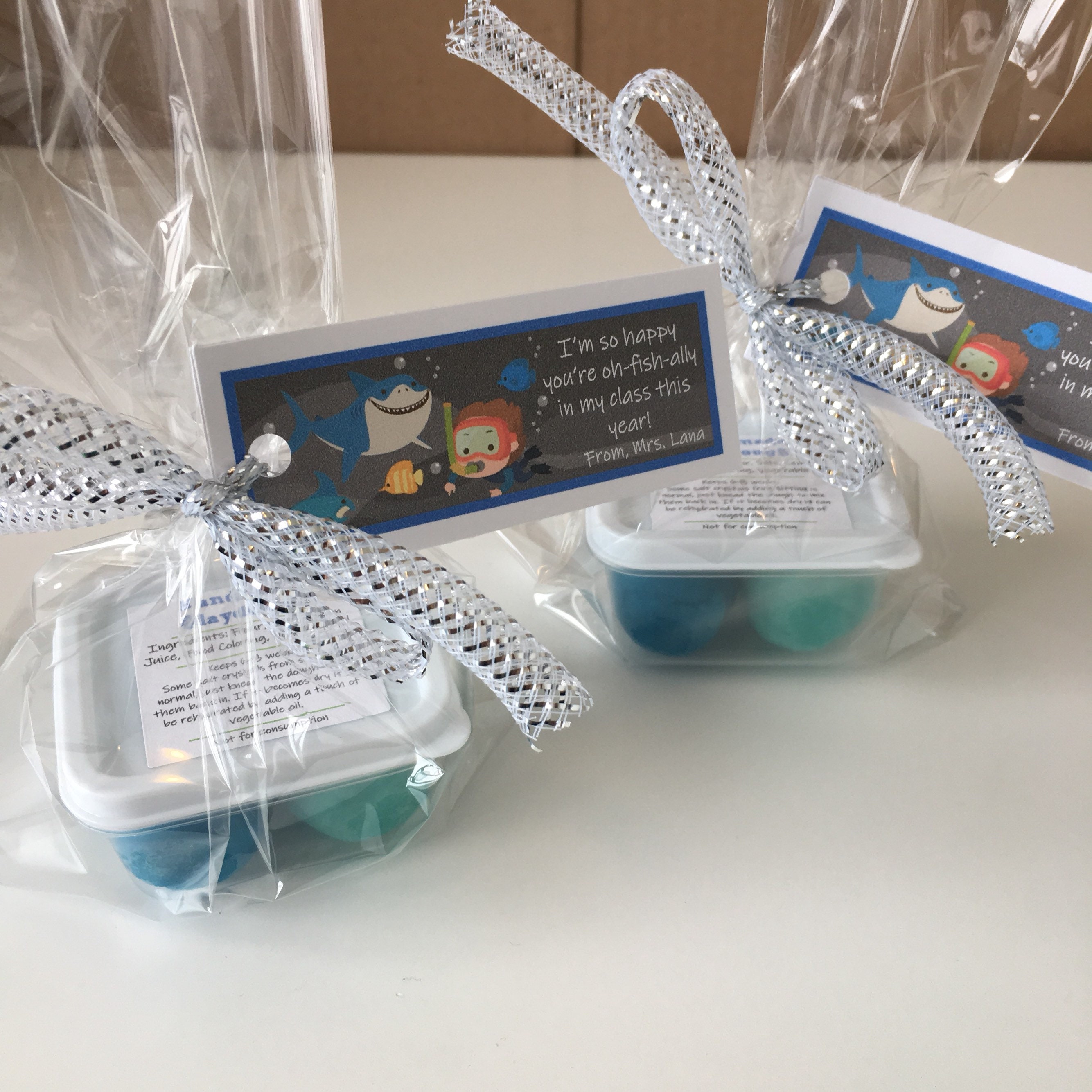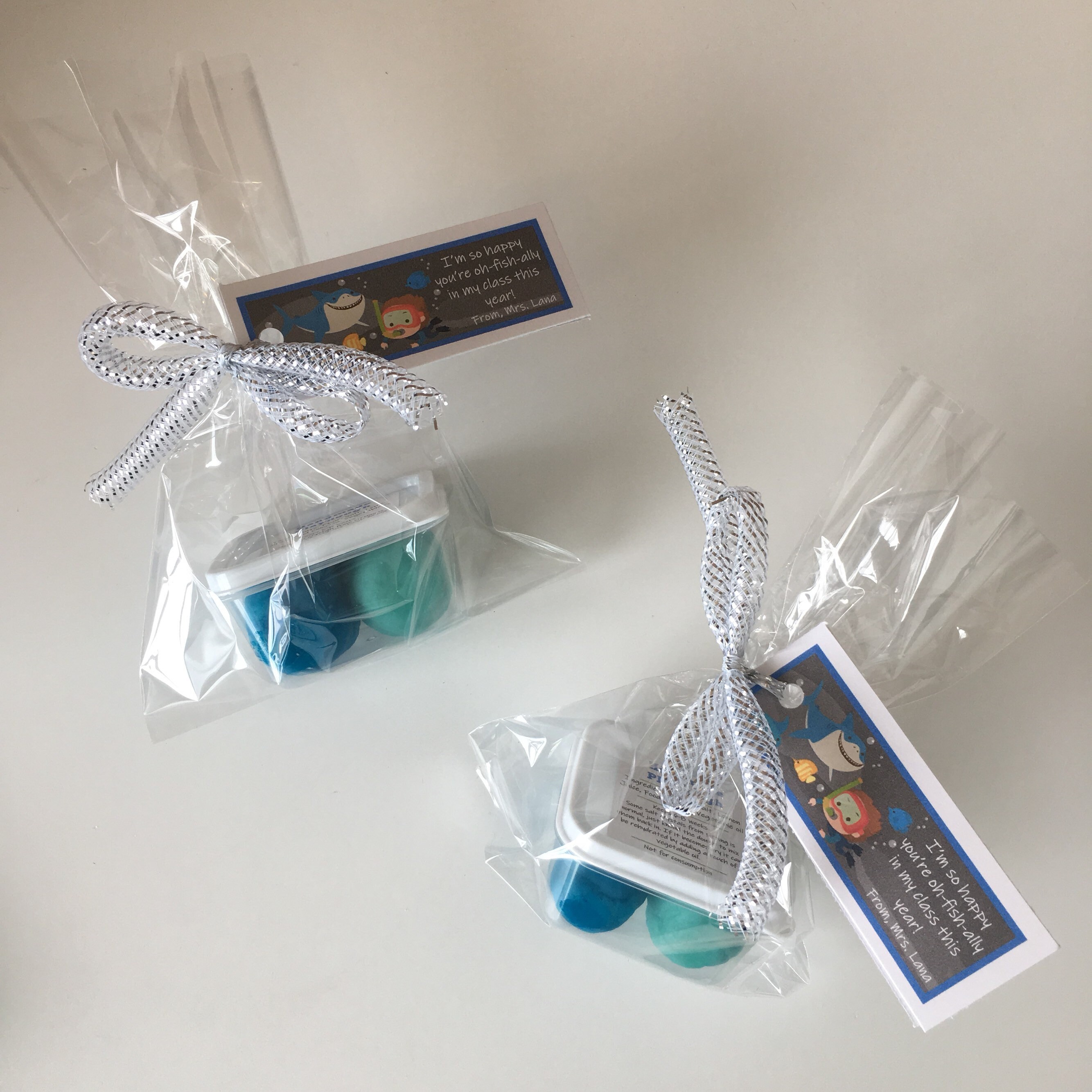 Handmade Under the Sea Back to School theme play dough favor, includes a container of handmade play dough in two ocean blue colours.