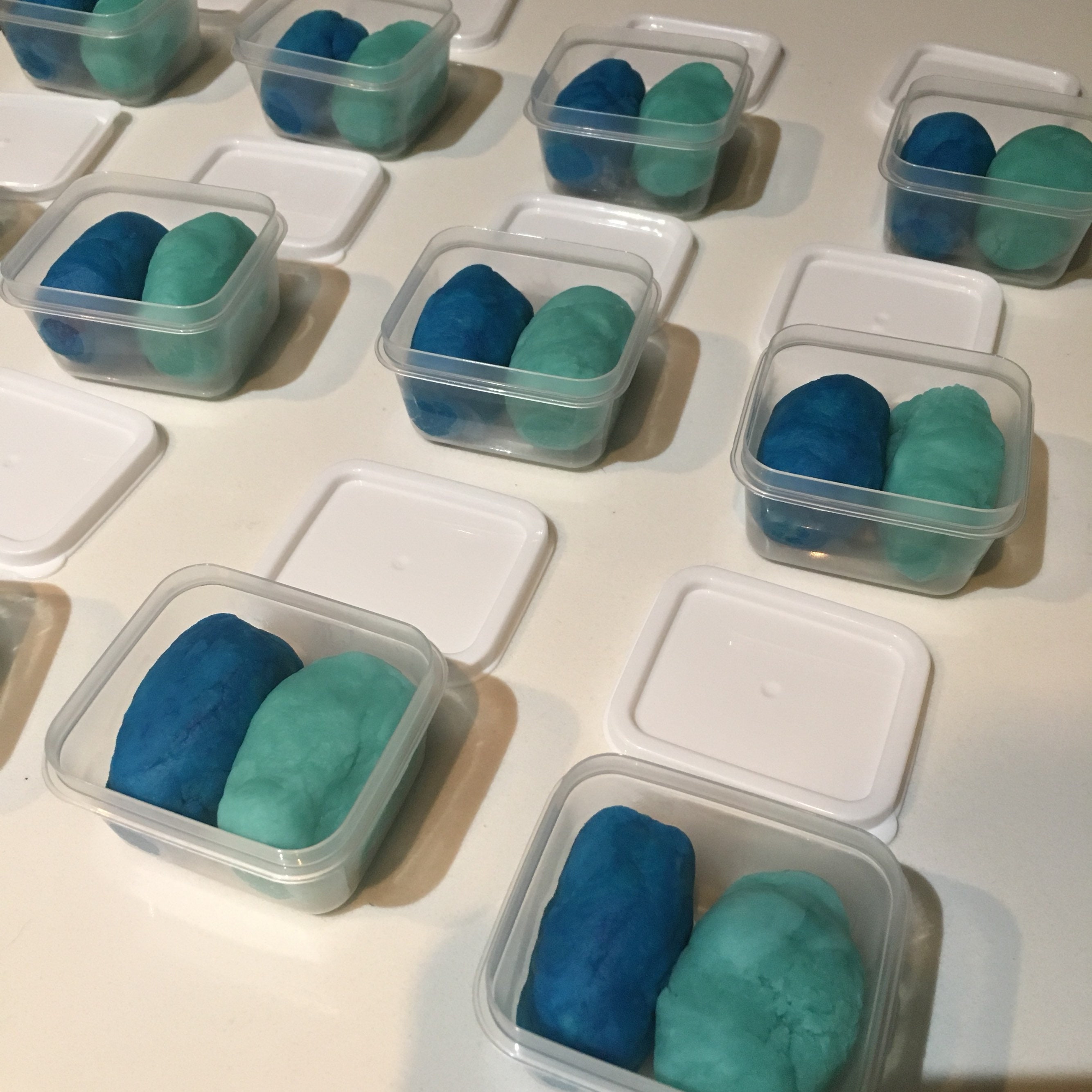 Each container of handmade play dough includes a portion in dark blue and a portion in light blue
