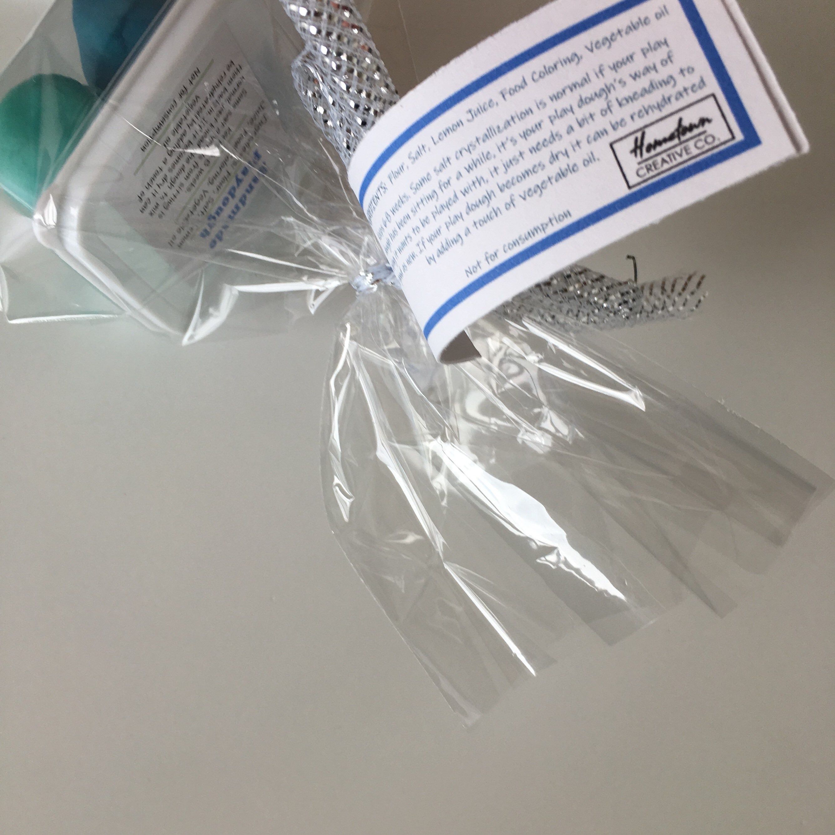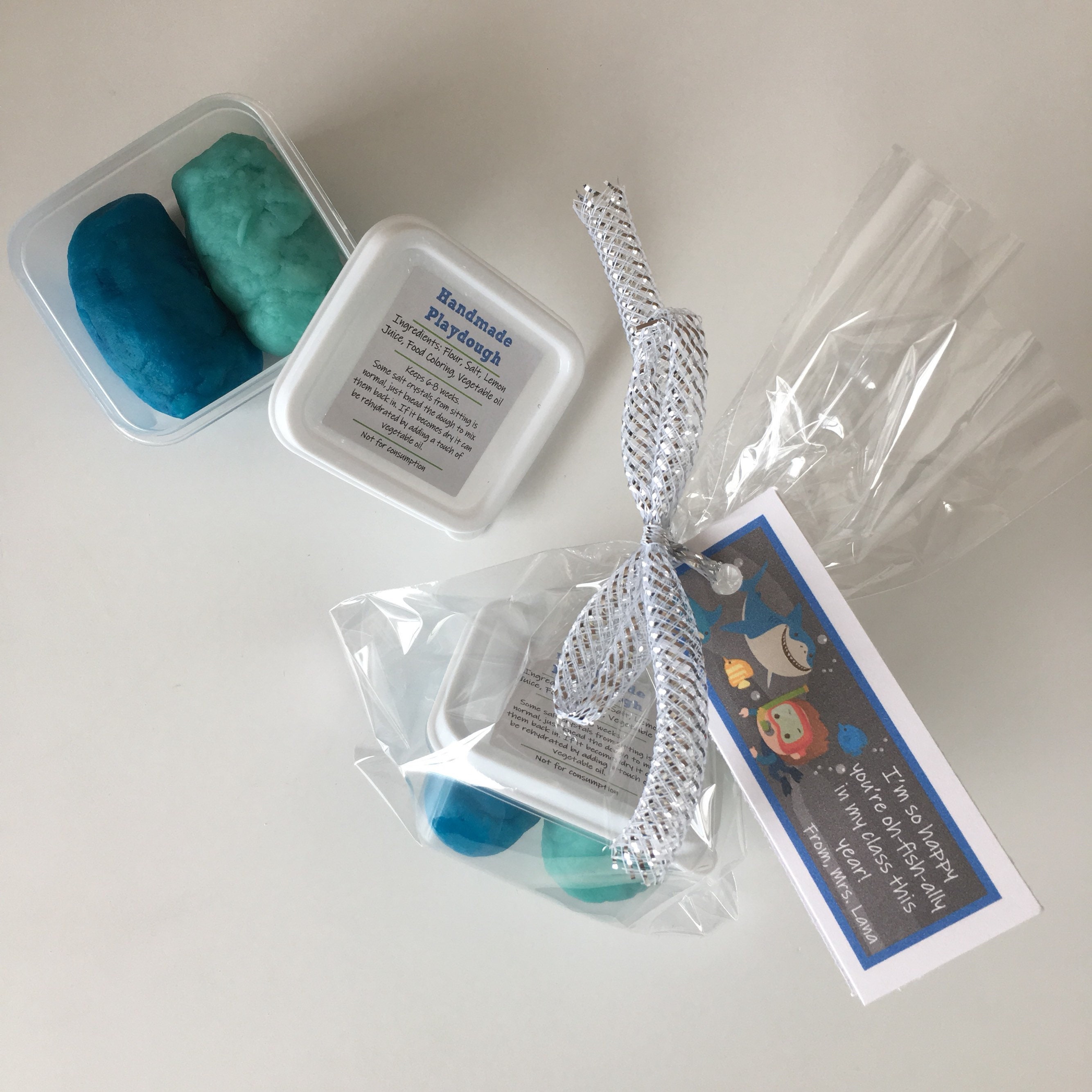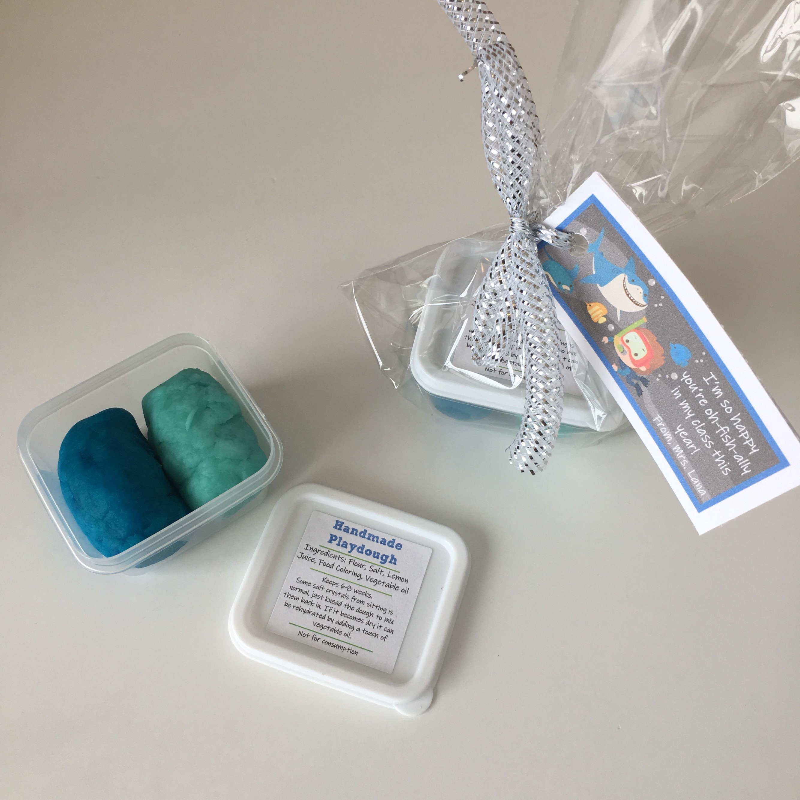 Includes a container of handmade non-toxic play dough in 2 colors; dark blue and light blue. If you'd like other colors or another theme for the tag please let me know, each batch of play dough is made fresh for each order so I'm happy to customize the colors if requested.