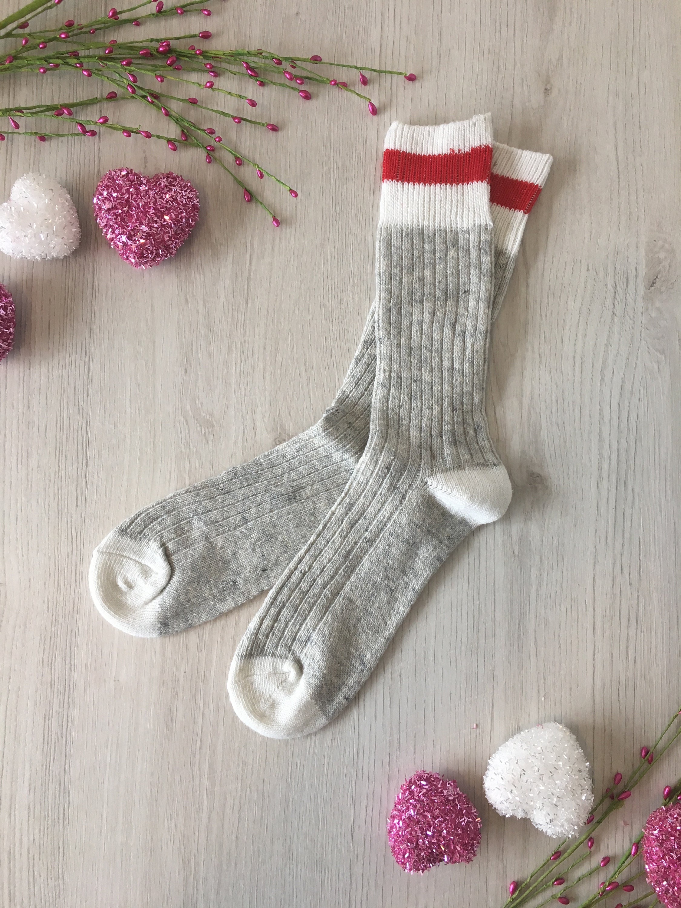 Socks are a men's universal size in a classic grey, red and white style.