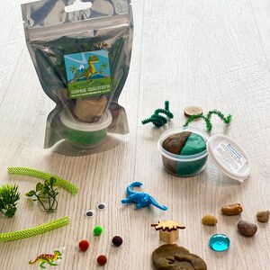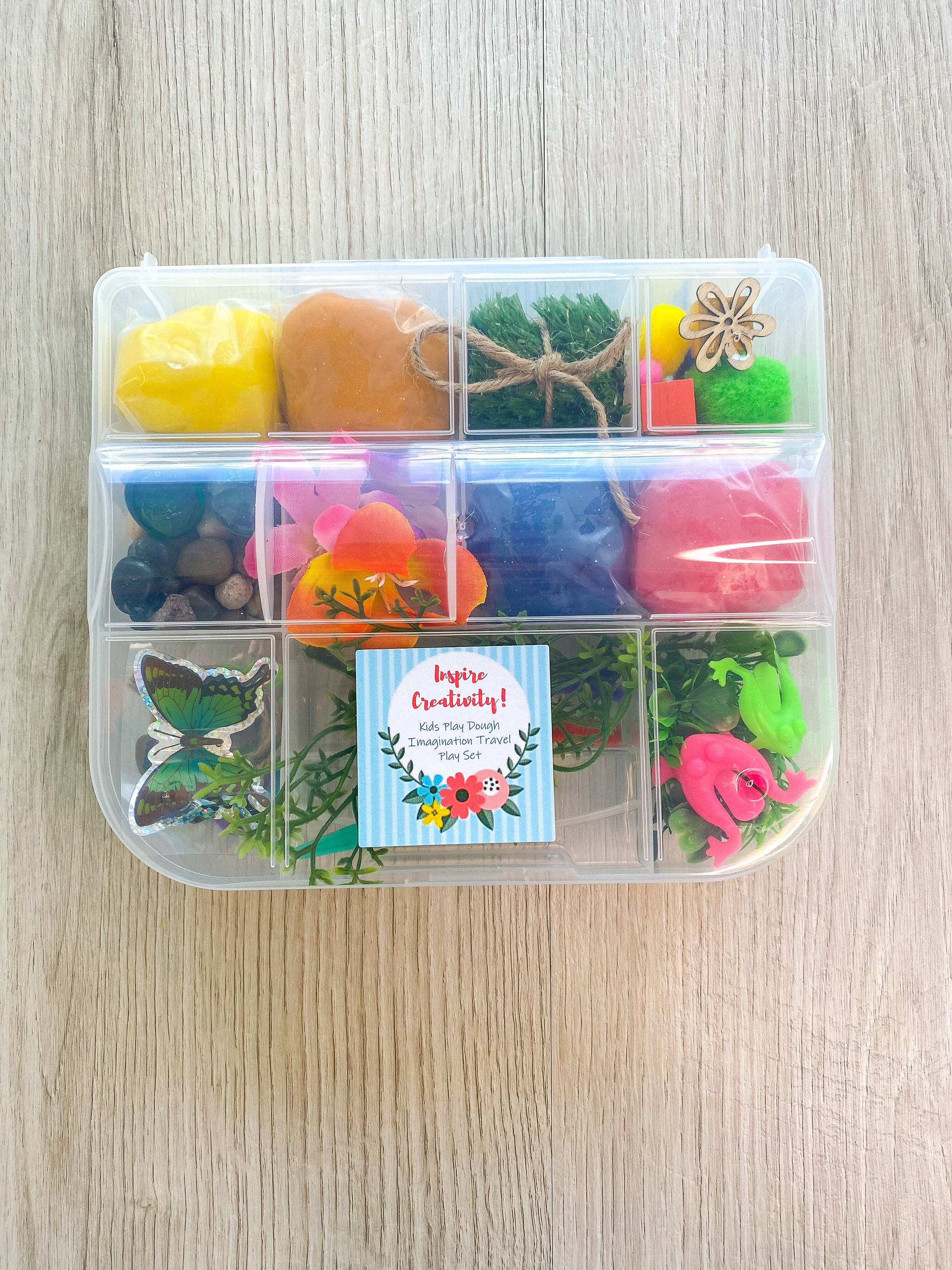 Kit includes everything you need to let your child’s imagination run wild including (4) Colors of handmade non-toxic play dough, a custom made play dough stamp to match the theme of the set, pom poms, googly eyes and various other decorations for kids to explore with.