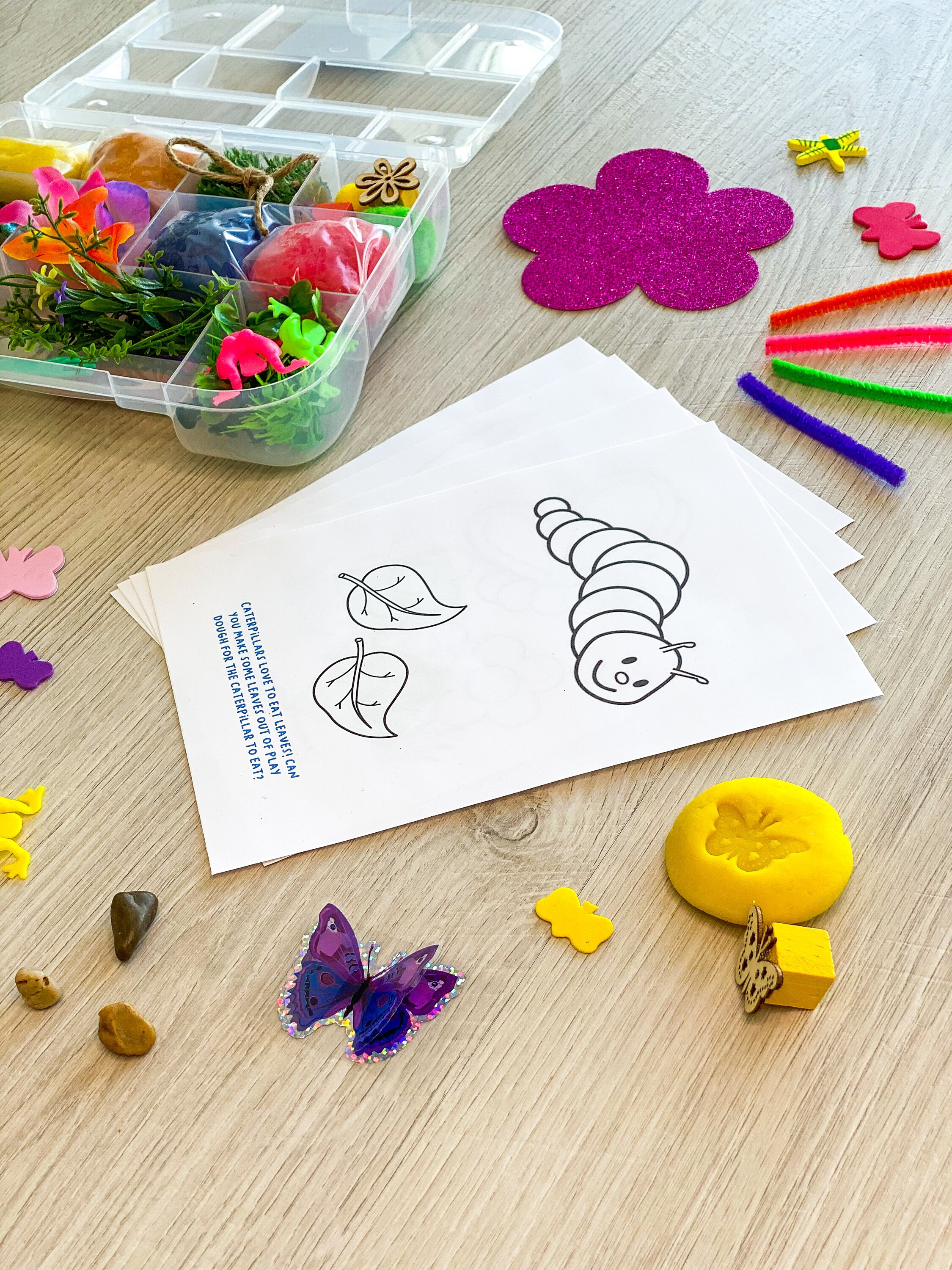Included with each set are (4) activity sheets tailored to each theme that provide kids with a jumping off point of what to create using their play dough, with basic prompts such as "Caterpillars love to eat leaves, can you use your play dough to make some leaves?" I find these are great to get kids imaginations started with what types of things they can make then let their imaginations take over from there!