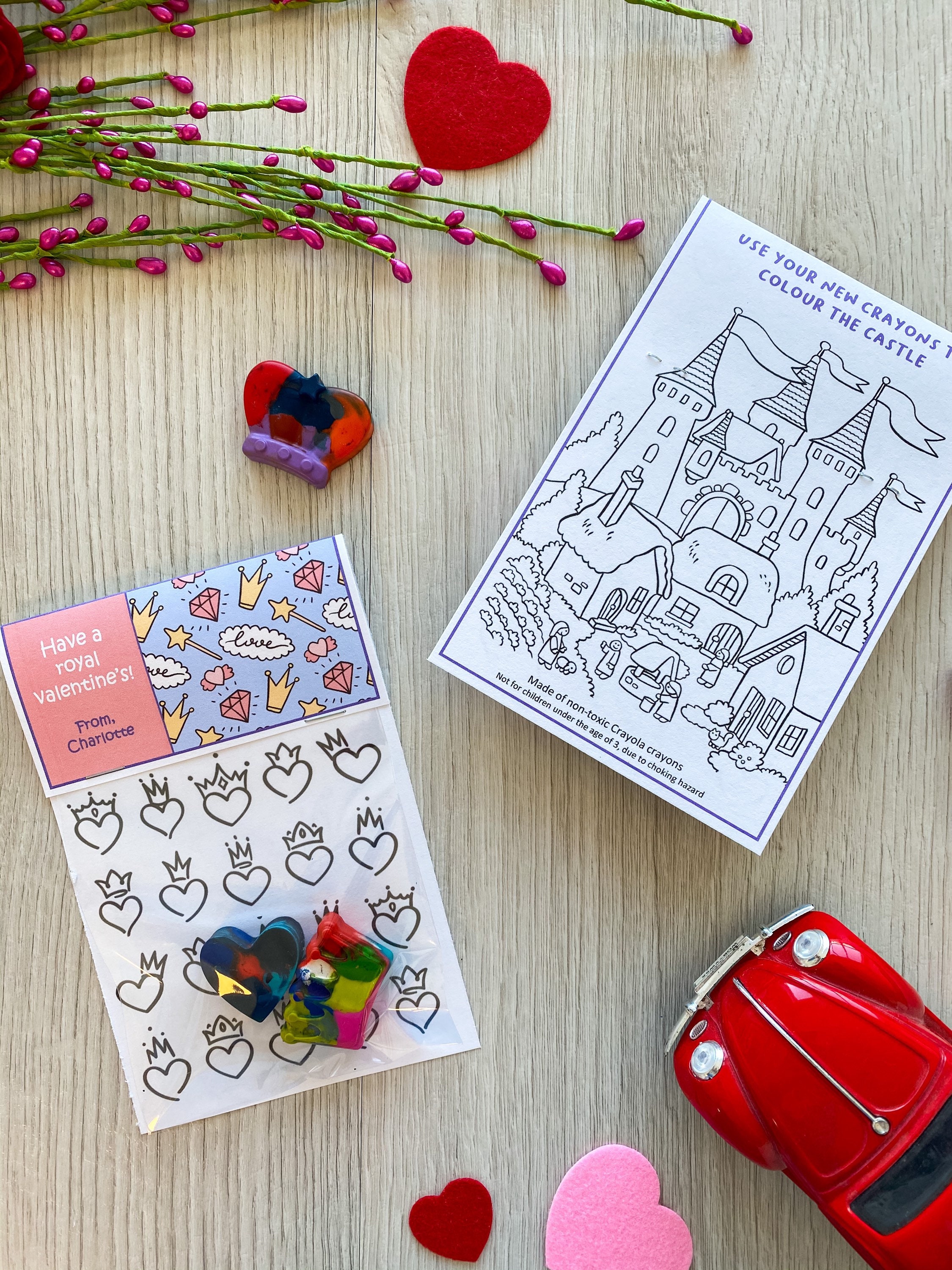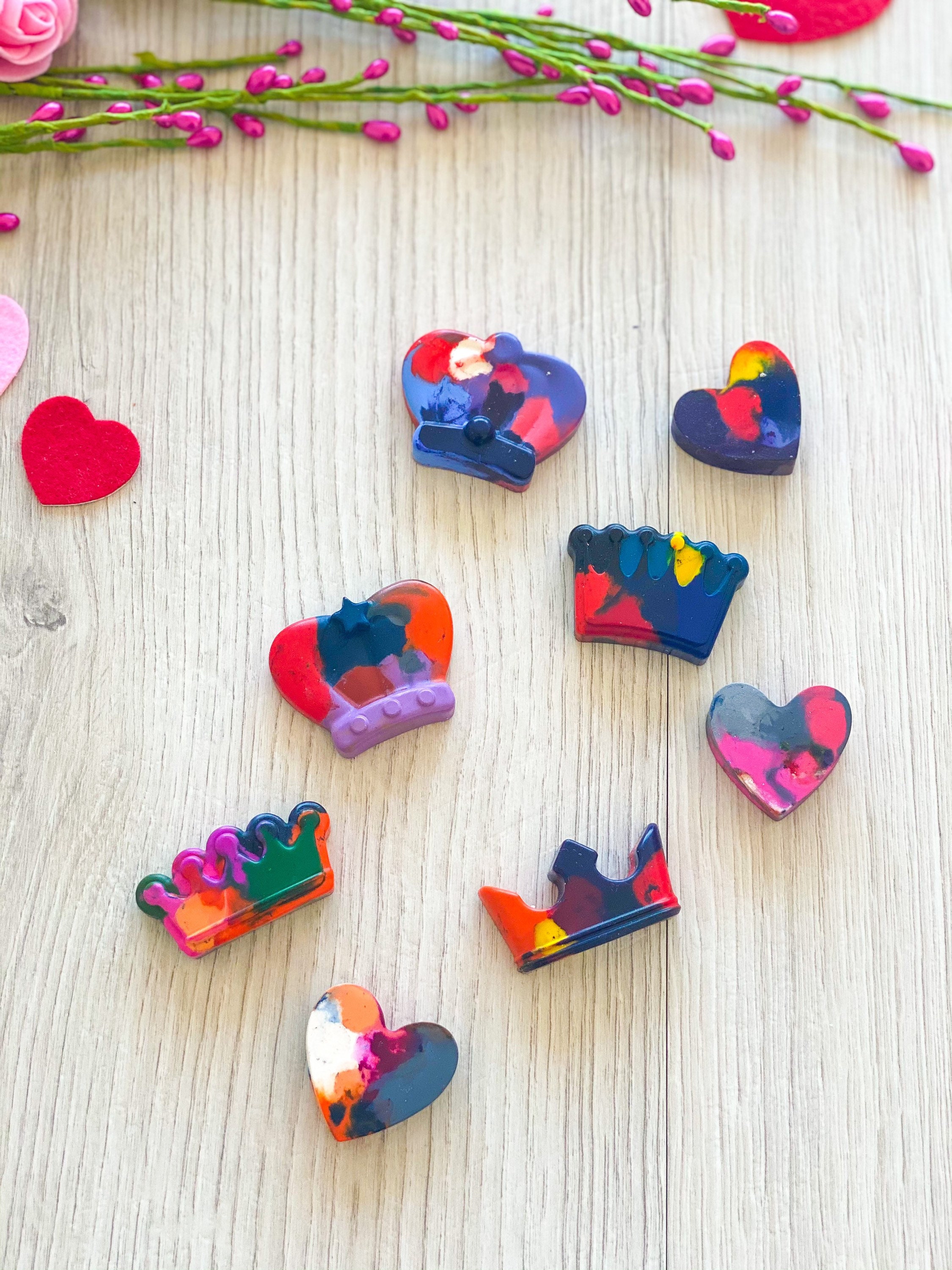 Featuring (2) handmade crayons that children can colour with, (1) crown shaped crayons and (1) heart shaped crayon