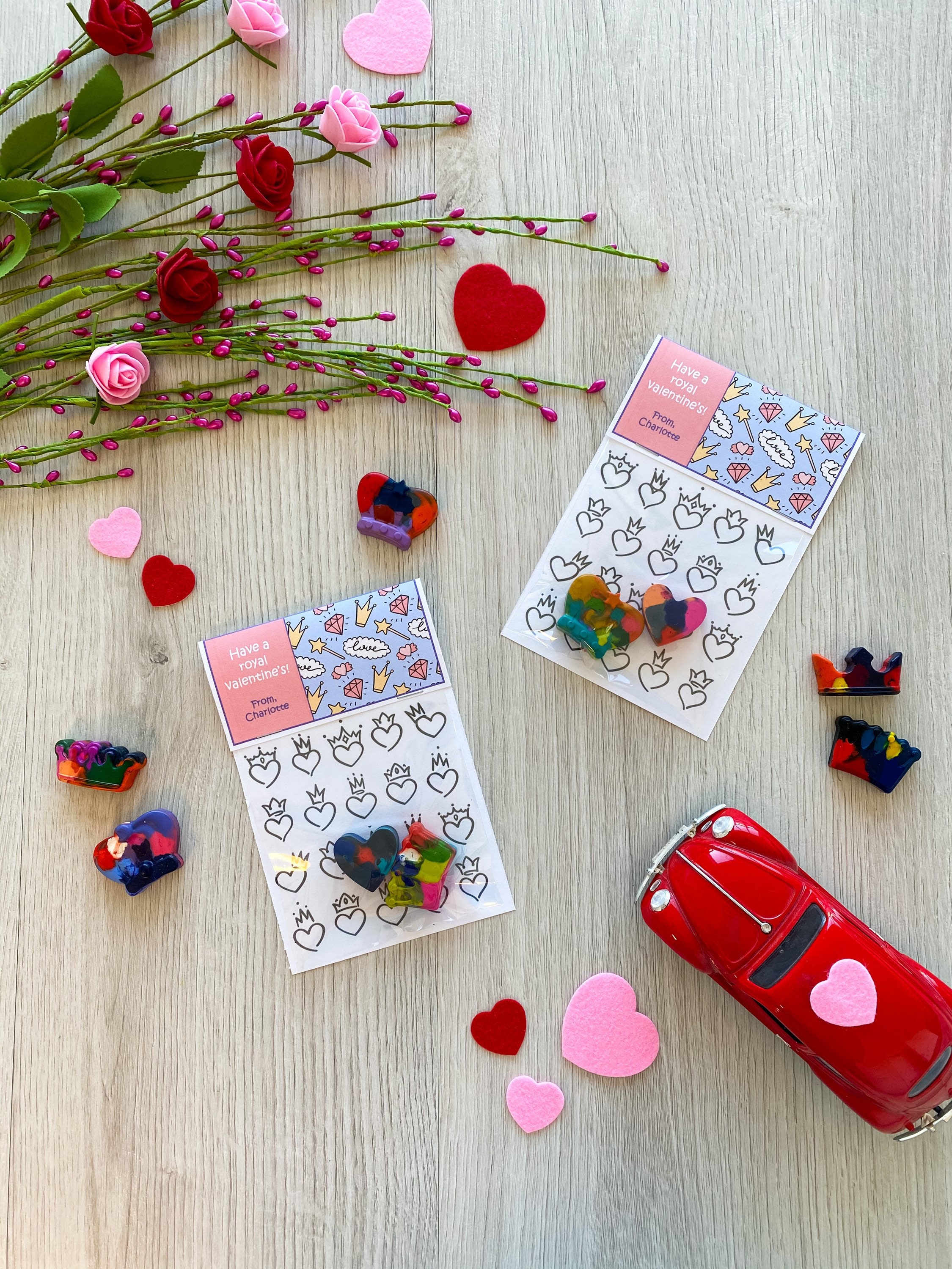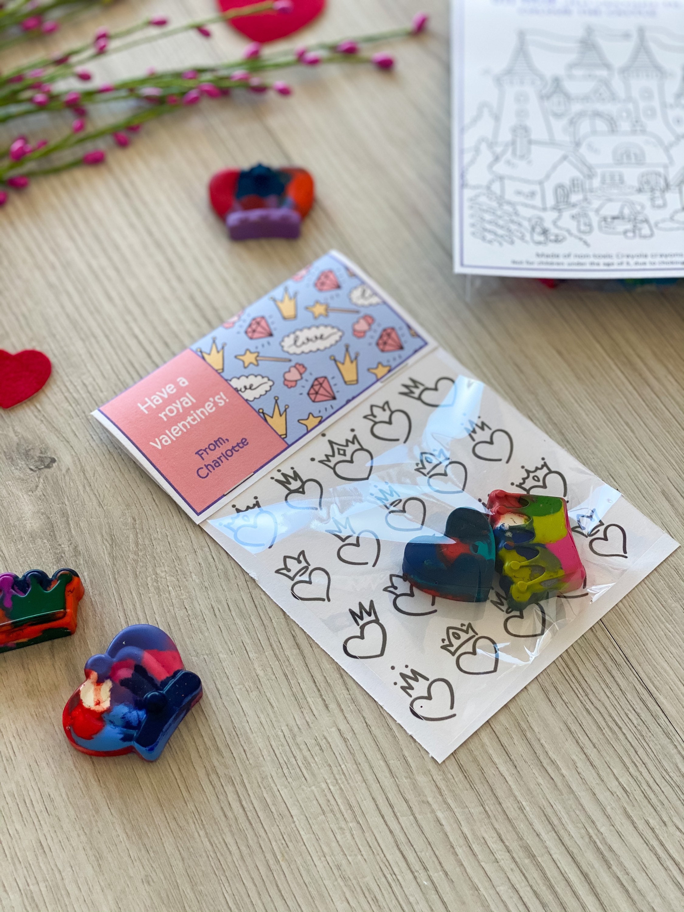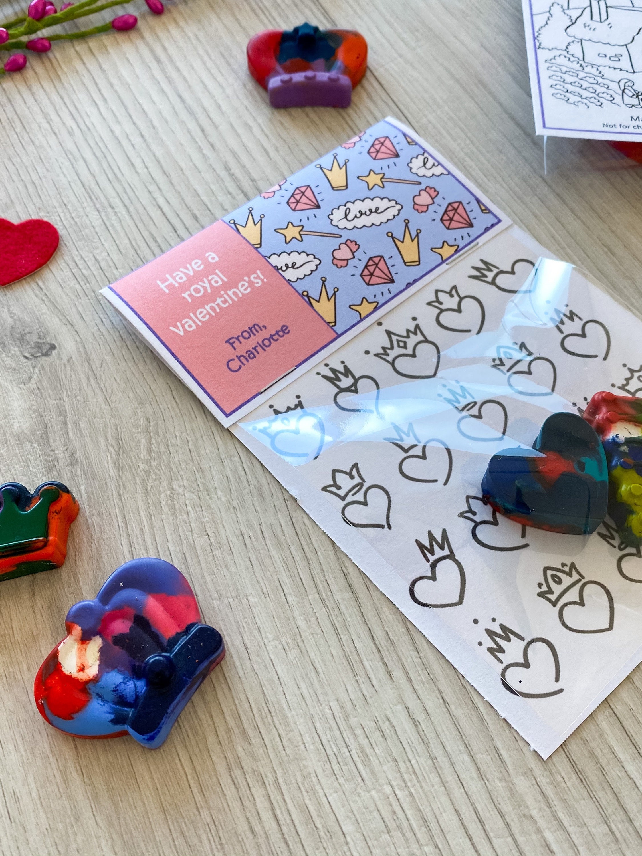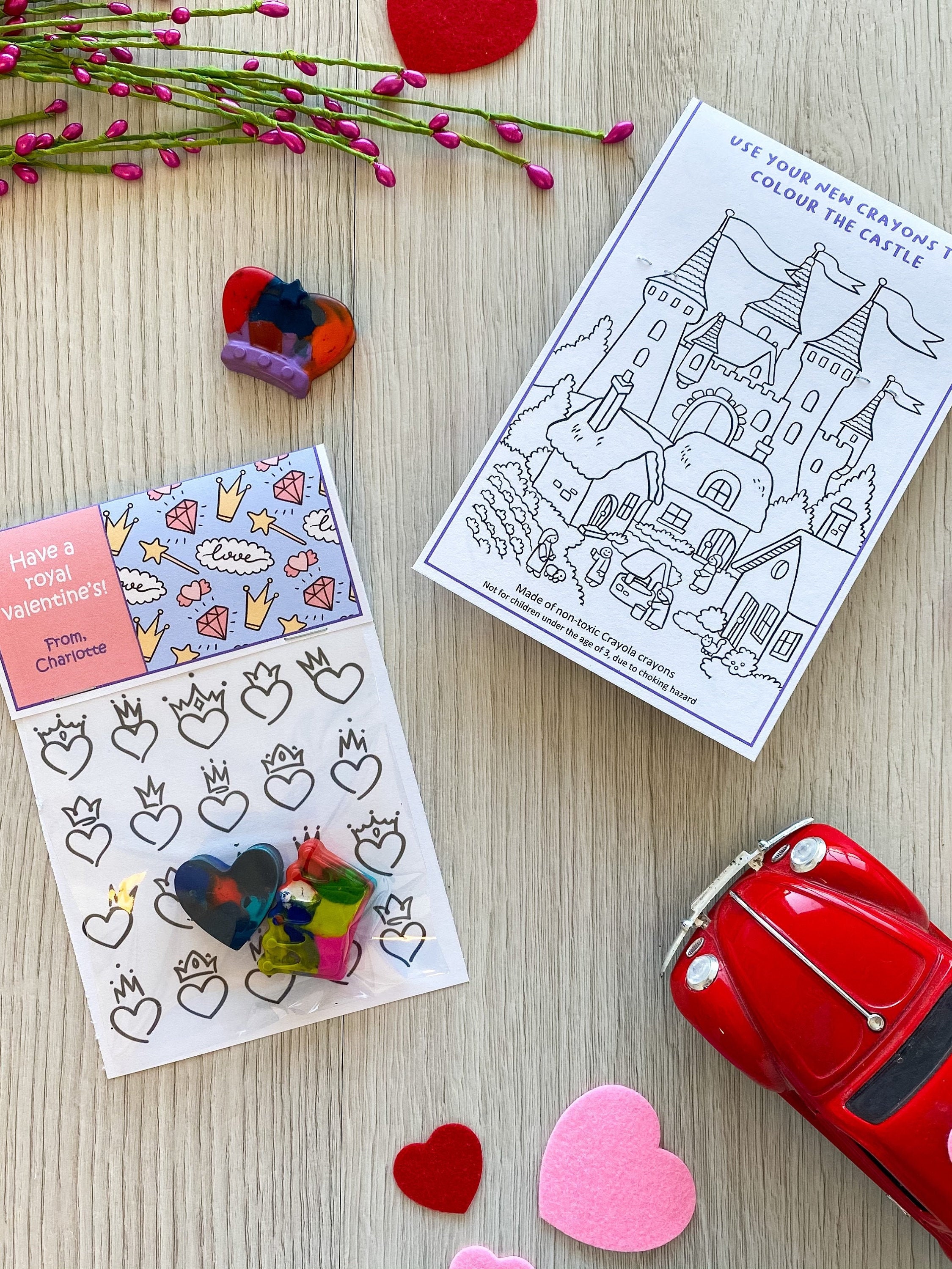 Valentine's Day Kids Cards - Valentines Day School Cards - Valentine's Day toy valentines - No Candy Valentines Day Cards - Valentines School Treats -β valentines classroom treats β kids classroom cards β kids thank you cards β kids school cards - craft Party favors - Valentines - unplugged activity kits β non candy valentines options - handmade unique shaped crayons - handmade crayons - multicolor crayon - color your own - crayon valentines - princess valentines
