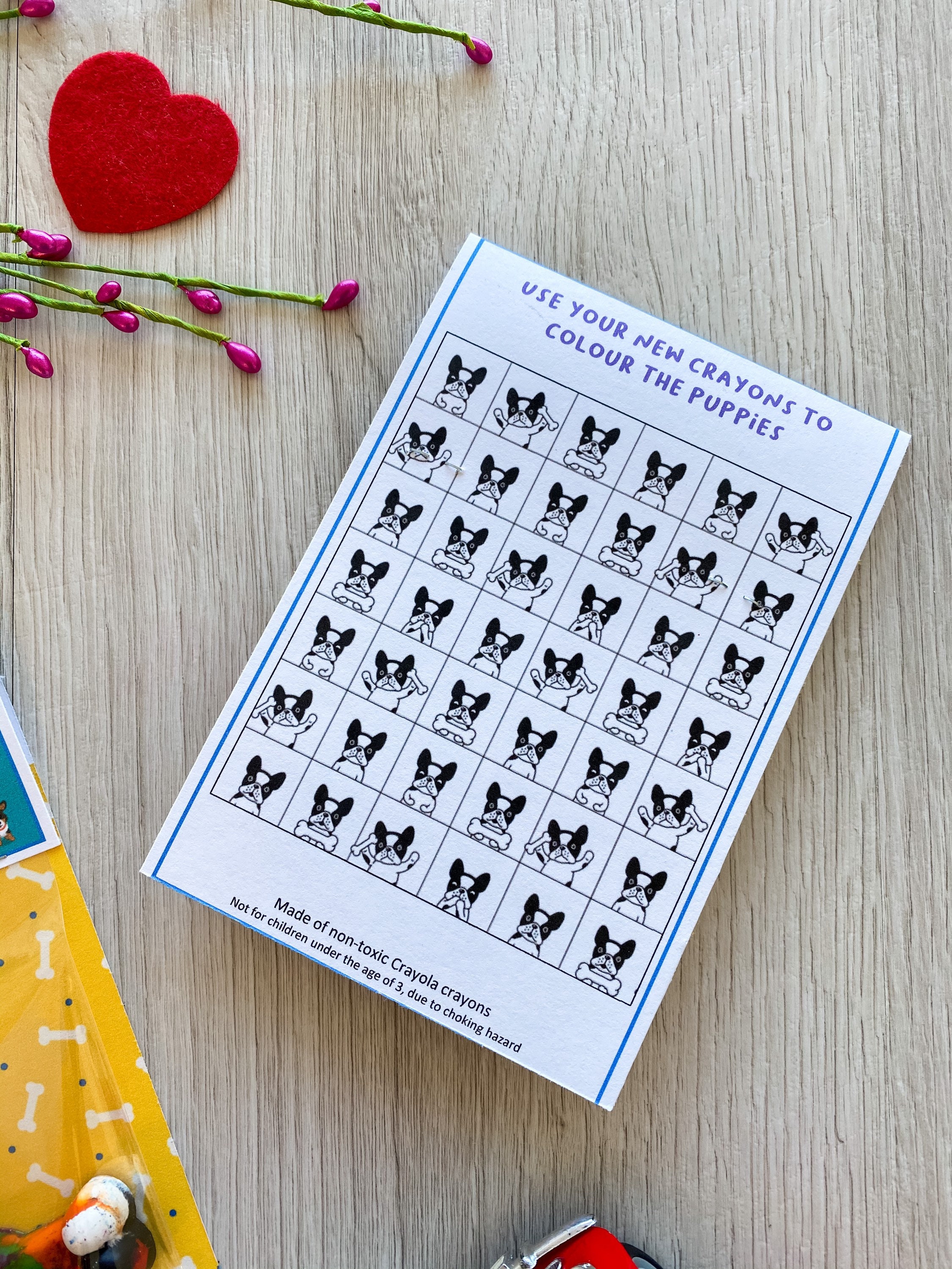 Featuring (2) handmade crayons that children can colour with, (1) puppy paw print shape and (1) dog bone shape