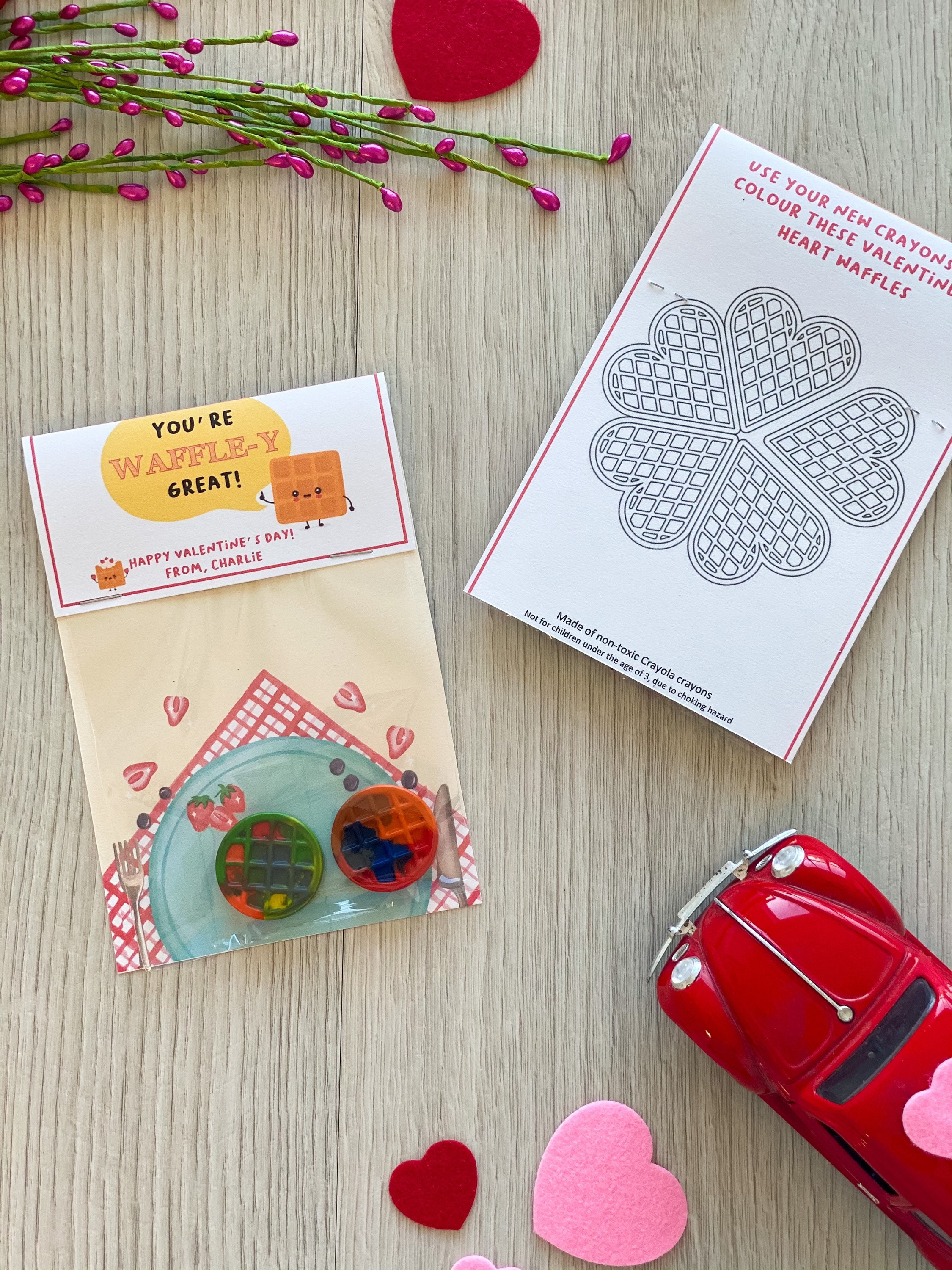The back includes a picture of heart shaped waffles that kids can use their crayons to colour in