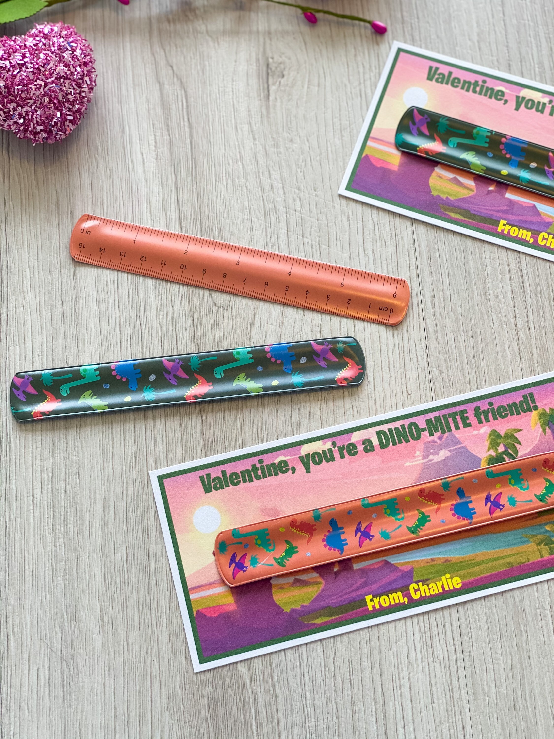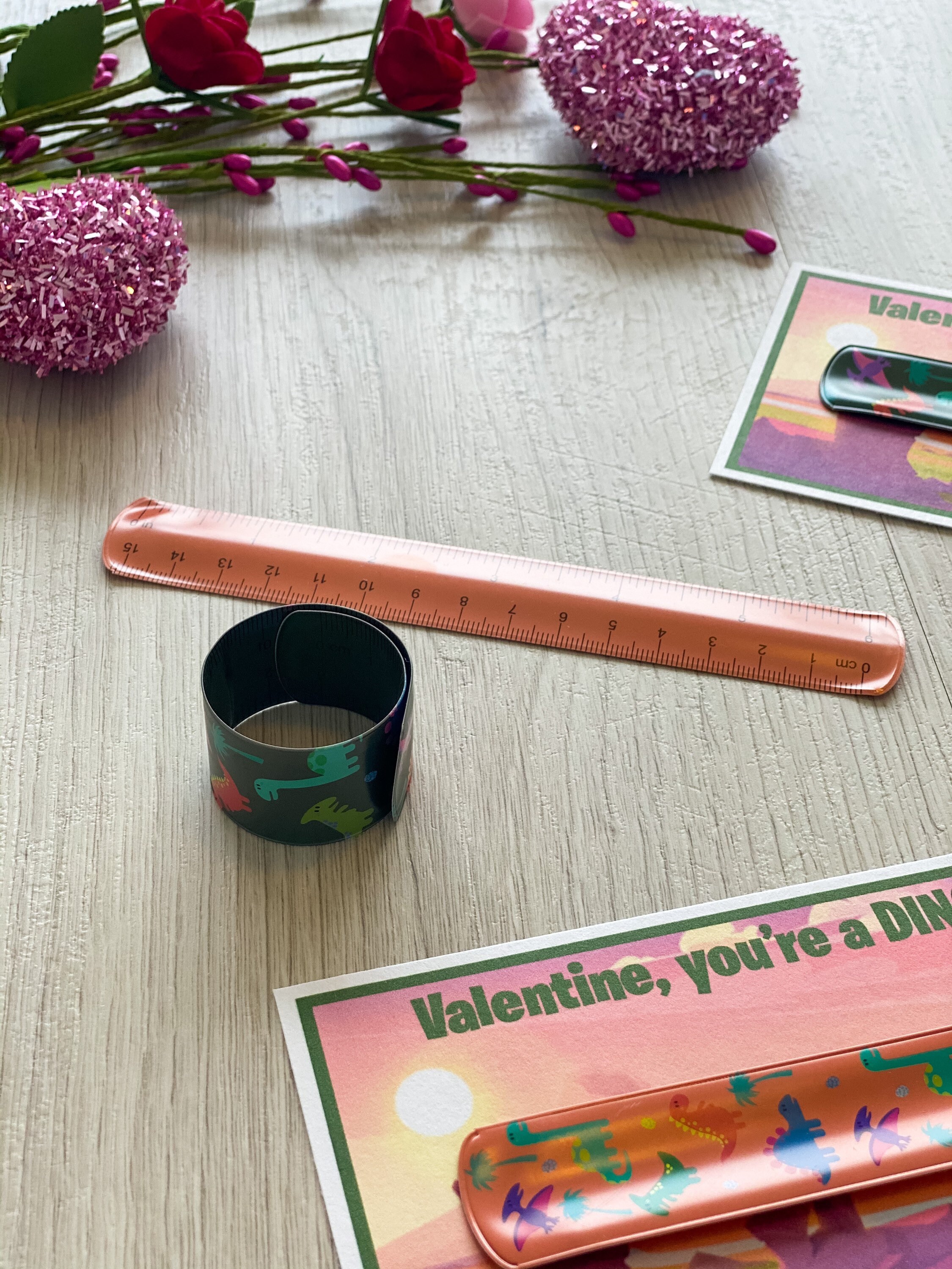 Featuring a slap bracelet kids can remove and play with, one side has a design on it and the other side is a ruler